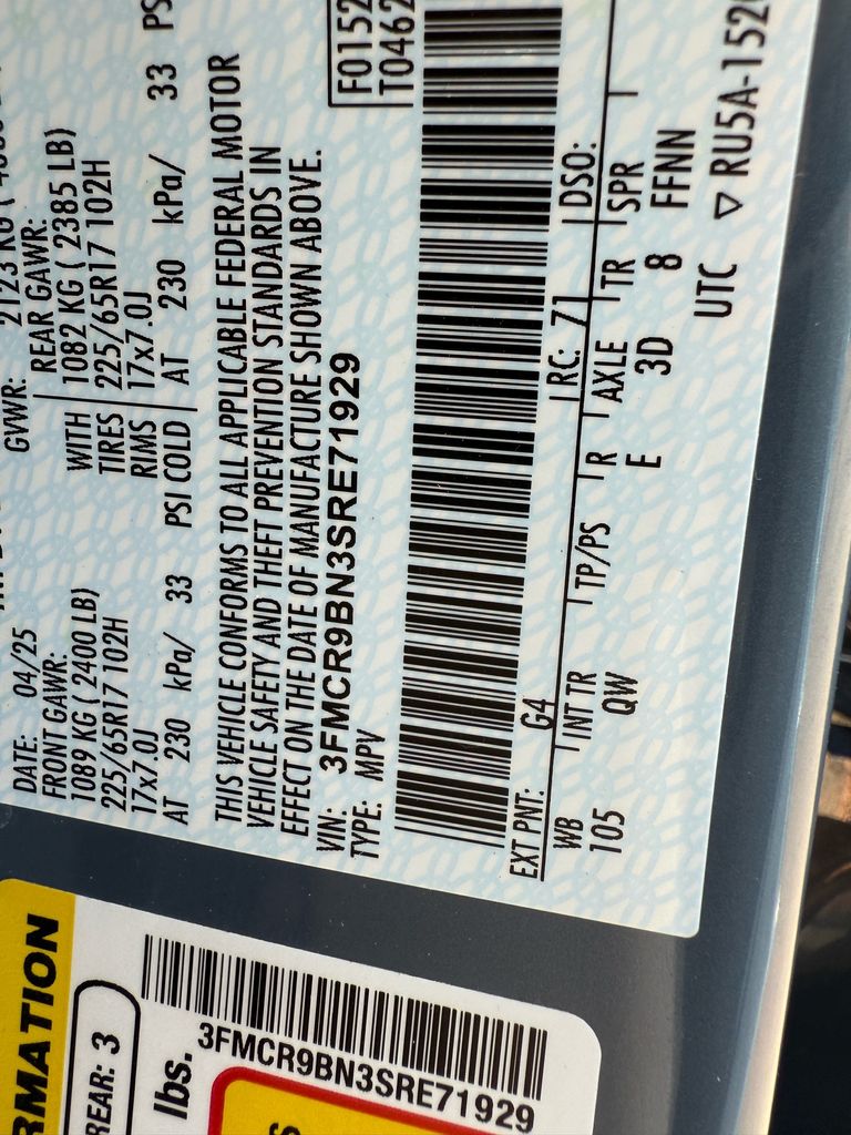 Convenience Package (Front Driver/Passenger Seat Back Map Pockets, Heated 8-Way Power Driver's Seat, LED Fog Lamps, Premium Wrapped Steering Wheel, and Universal Garage Door Opener (UGDO)), Equipment Group 200A, 4-Wheel Disc Brakes, 6 Speakers, ABS brakes, Air Conditioning, Alloy wheels, AM/FM radio: SiriusXM, AM/FM Stereo, Auto High-beam Headlights, Automatic temperature control, Brake assist, Cloth w/Easy-to-Clean Front Bucket Seats, Compass, Delay-off headlights, Driver door bin, Driver vanity mirror, Dual front impact airbags, Dual front side impact airbags, Electronic Stability Control, Emergency communication system: SYNC 4 911 Assist, Four wheel independent suspension, Front anti-roll bar, Front Bucket Seats, Front Center Armrest, Front reading lights, Fully automatic headlights, Heated door mirrors, Illuminated entry, Knee airbag, Low tire pressure warning, Occupant sensing airbag, Outside temperature display, Overhead airbag, Overhead console, Panic alarm, Passenger door bin, Passenger vanity mirror, Power door mirrors, Power steering, Power windows, Radio data system, Rear anti-roll bar, Rear Parking Sensors, Rear reading lights, Rear seat center armrest, Rear window defroster, Rear window wiper, Remote keyless entry, Security system, SiriusXM, Speed control, Speed-sensing steering, Speed-Sensitive Wipers, Split folding rear seat, Steering wheel mounted audio controls, SYNC 4 w/Enhanced Voice Recognition, Tachometer, Telescoping steering wheel, Tilt steering wheel, Traction control, Trip computer, Variably intermittent wipers, and Wheels: 17" Carbonized Gray-Painted Aluminum. Price includes: $1000 - Bonus Customer Cash. Exp. 01/05/2026 $500 - Retail Bonus Cash. Exp. 01/05/2026
