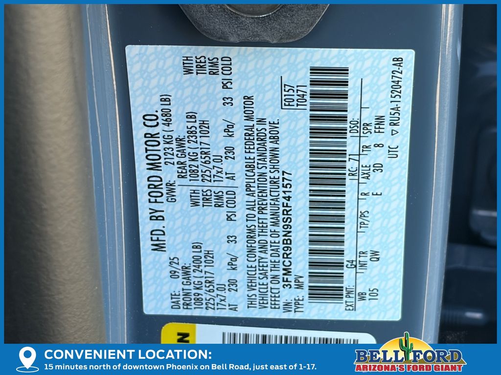 This Ford Bronco Sport is equipped with the following options: Equipment Group 200A, 4-Wheel Disc Brakes, 6 Speakers, ABS brakes, Air Conditioning, Alloy wheels, AM/FM radio: SiriusXM, AM/FM Stereo, Auto High-beam Headlights, Automatic temperature control, Brake assist, Cloth w/Easy-to-Clean Front Bucket Seats, Compass, Delay-off headlights, Driver door bin, Driver vanity mirror, Dual front impact airbags, Dual front side impact airbags, Electronic Stability Control, Emergency communication system: SYNC 4 911 Assist, Four wheel independent suspension, Front anti-roll bar, Front Bucket Seats, Front Center Armrest, Front reading lights, Fully automatic headlights, Heated door mirrors, Illuminated entry, Knee airbag, Low tire pressure warning, Occupant sensing airbag, Outside temperature display, Overhead airbag, Overhead console, Panic alarm, Passenger door bin, Passenger vanity mirror, Power door mirrors, Power steering, Power windows, Radio data system, Rear anti-roll bar, Rear Parking Sensors, Rear reading lights, Rear seat center armrest, Rear window defroster, Rear window wiper, Remote keyless entry, Security system, SiriusXM, Speed control, Speed-sensing steering, Speed-Sensitive Wipers, Split folding rear seat, Steering wheel mounted audio controls, SYNC 4 w/Enhanced Voice Recognition, Tachometer, Telescoping steering wheel, Tilt steering wheel, Traction control, Trip computer, Variably intermittent wipers, and Wheels: 17" Carbonized Gray-Painted Aluminum. Price includes: $2000 - Retail Customer Cash. Exp. 03/31/2026 $500 - Bonus Customer Cash. Exp. 02/02/2026