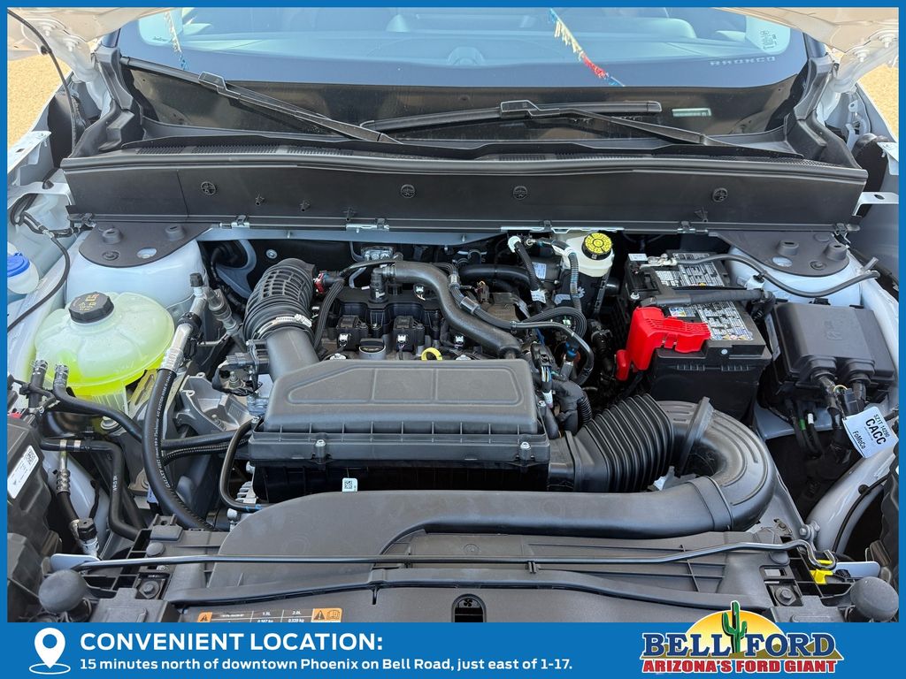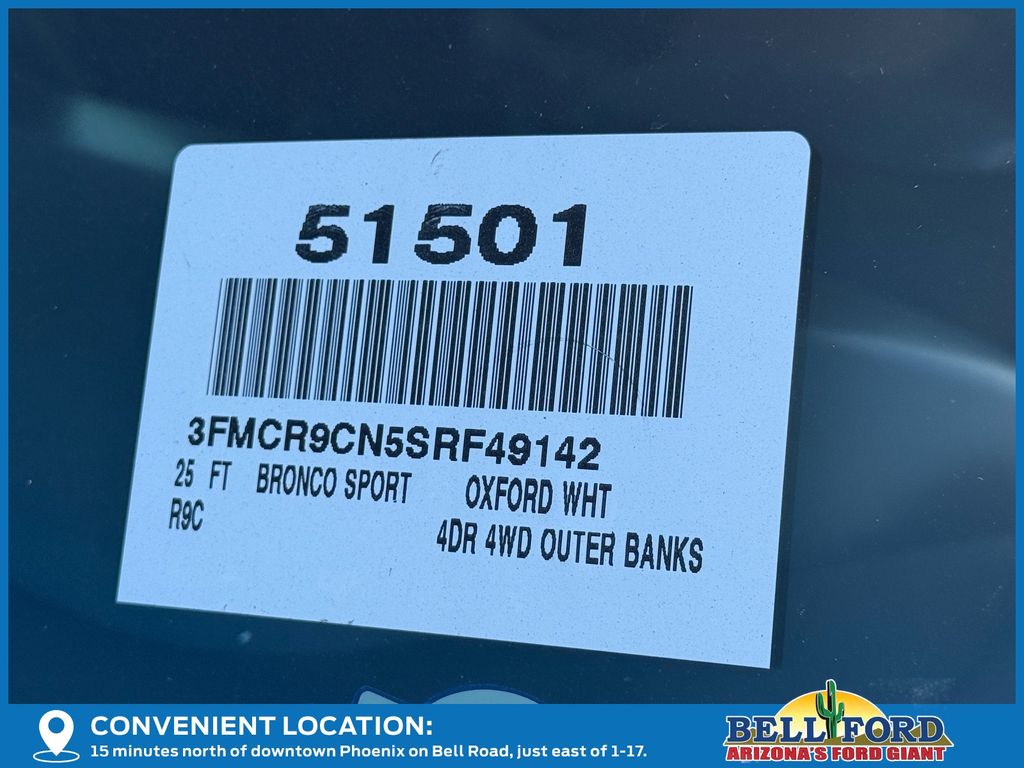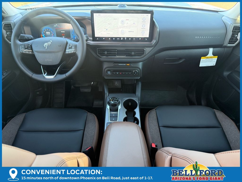 This Ford Bronco Sport is equipped with the following options: Equipment Group 300A, Outer Banks Tech Package+ (B&O Sound System by Bang & Olufsen, Connected Navigation, and HD Radio), Sasquatch Outer Banks Package (110V/400W AC Power Outlet, 2nd Row Carpeted Seatback, Auxiliary Switches & Wiring, Brush Guard, Class II Trailer Tow Pack w/Trailer Sway Control, Fender Tie Downs, Front & Rear Black Bumpers, High Clearance Fender Flares, HOSS 2.0 Off-Road Suspension, Interior Grab Handle, Recovery Hooks, Trail Control for Off-Road, and Wheels: 17" Ebony Black-Painted Aluminum), 360-Degree Camera w/Trail & Split View, 4-Wheel Disc Brakes, 6 Speakers, ABS brakes, Air Conditioning, Alloy wheels, AM/FM radio: SiriusXM, AM/FM Stereo, Auto High-beam Headlights, Auto-dimming Rear-View mirror, Automatic temperature control, Brake assist, Compass, Delay-off headlights, Driver door bin, Driver vanity mirror, Dual front impact airbags, Dual front side impact airbags, Electronic Stability Control, Emergency communication system: SYNC 4 911 Assist, Four wheel independent suspension, Front anti-roll bar, Front Bucket Seats, Front Center Armrest, Front Driver/Passenger Seat Back Map Pockets, Front dual zone A/C, Front fog lights, Front Parking Sensors, Front reading lights, Fully automatic headlights, Garage door transmitter, Heated door mirrors, Heated front seats, Heated steering wheel, Illuminated entry, Knee airbag, Low tire pressure warning, Memory seat, Occupant sensing airbag, Outside temperature display, Overhead airbag, Overhead console, Panic alarm, Passenger door bin, Passenger vanity mirror, Power door mirrors, Power driver seat, Power Moonroof, Power passenger seat, Power steering, Power windows, Premium Trimmed Front Bucket Seats w/Ebony/Roast, Radio data system, Rain sensing wipers, Rear anti-roll bar, Rear Parking Sensors, Rear reading lights, Rear seat center armrest, Rear window defroster, Rear window wiper, Remote keyless entry, Reverse Brake Assist, Security system, SiriusXM, Speed control, Speed-sensing steering, Speed-Sensitive Wipers, Split folding rear seat, Steering wheel mounted audio controls, SYNC 4 w/Enhanced Voice Recognition, Tachometer, Telescoping steering wheel, Tilt steering wheel, Traction control, Trip computer, Variably intermittent wipers, and Wheels: 18" Ebony Black-Painted Aluminum. Price includes: $1000 - Bonus Customer Cash. Exp. 01/05/2026 $1000 - Final Days Mega Bonus Cash. Exp. 01/02/2026 $500 - Retail Bonus Cash. Exp. 01/05/2026