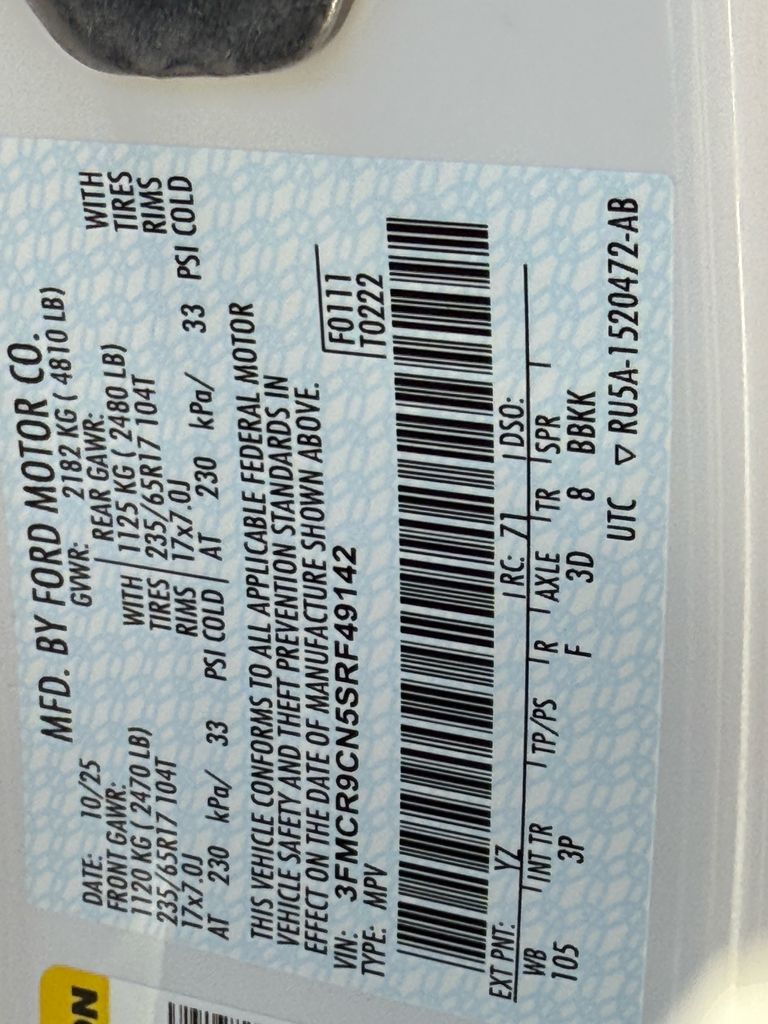 - VIN : 3FMCR9CN5SRF49142