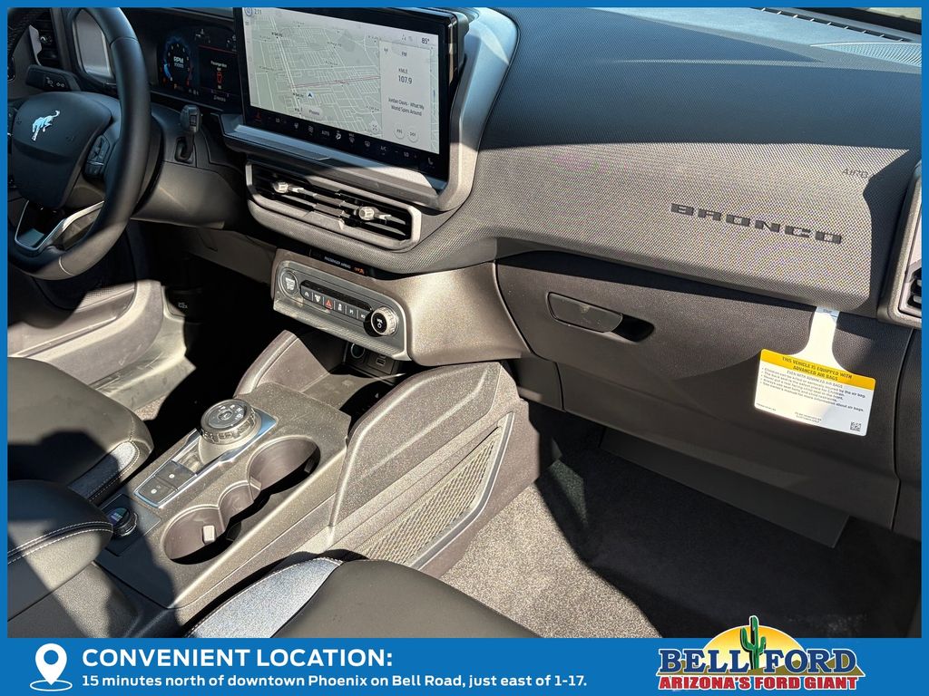 This Ford Bronco Sport is equipped with the following options: Equipment Group 300A, Outer Banks Tech Package+ (B&O Sound System by Bang & Olufsen, Connected Navigation, and HD Radio), 360-Degree Camera w/Trail & Split View, 4-Wheel Disc Brakes, 6 Speakers, ABS brakes, Air Conditioning, Alloy wheels, AM/FM radio: SiriusXM, AM/FM Stereo, Auto High-beam Headlights, Auto-dimming Rear-View mirror, Automatic temperature control, Brake assist, Compass, Delay-off headlights, Driver door bin, Driver vanity mirror, Dual front impact airbags, Dual front side impact airbags, Electronic Stability Control, Emergency communication system: SYNC 4 911 Assist, Four wheel independent suspension, Front anti-roll bar, Front Bucket Seats, Front Center Armrest, Front Driver/Passenger Seat Back Map Pockets, Front dual zone A/C, Front fog lights, Front Parking Sensors, Front reading lights, Fully automatic headlights, Garage door transmitter, Heated door mirrors, Heated front seats, Heated steering wheel, Illuminated entry, Knee airbag, Low tire pressure warning, Memory seat, Occupant sensing airbag, Outside temperature display, Overhead airbag, Overhead console, Panic alarm, Passenger door bin, Passenger vanity mirror, Power door mirrors, Power driver seat, Power passenger seat, Power steering, Power windows, Premium Trimmed Front Bucket Seats w/Ebony/Roast, Radio data system, Rain sensing wipers, Rear anti-roll bar, Rear Parking Sensors, Rear reading lights, Rear seat center armrest, Rear window defroster, Rear window wiper, Remote keyless entry, Reverse Brake Assist, Security system, SiriusXM, Speed control, Speed-sensing steering, Speed-Sensitive Wipers, Split folding rear seat, Steering wheel mounted audio controls, SYNC 4 w/Enhanced Voice Recognition, Tachometer, Telescoping steering wheel, Tilt steering wheel, Traction control, Trip computer, Variably intermittent wipers, and Wheels: 18" Ebony Black-Painted Aluminum. Price includes: $2000 - Retail Customer Cash. Exp. 03/31/2026 $500 - Bonus Customer Cash. Exp. 02/02/2026