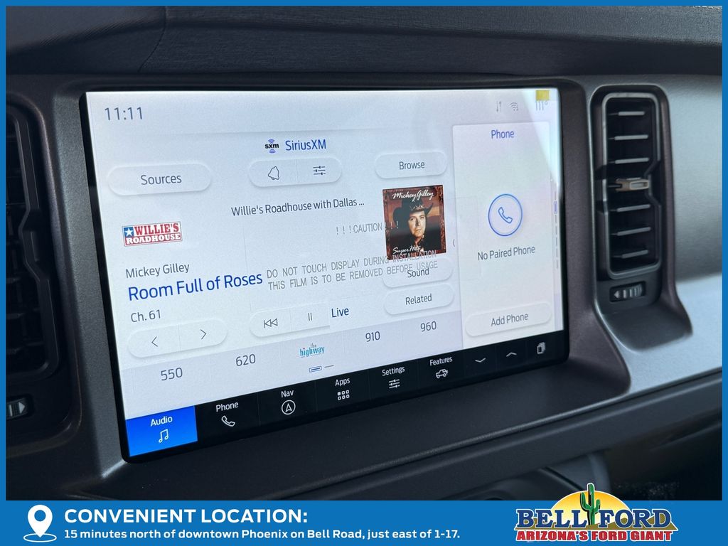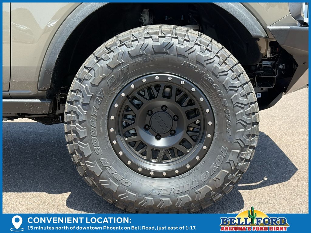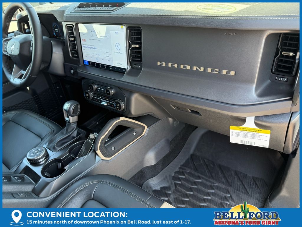 This Ford Bronco is equipped with the following options: Equipment Group 334A Lux Package (360-Degree Camera, Adaptive Cruise Control, Connected Navigation, Evasive Steering Assist, Front Parking Sensors, Information on Demand Panel, Radio: B&O Sound System by Bang & Olufsen, Sideview Mirrors, and Universal Garage Door Opener), 4-Wheel Disc Brakes, 4.7 Axle Ratio, 7 Speakers, ABS brakes, Air Conditioning, Alloy wheels, AM/FM radio: SiriusXM with 360L, AM/FM Stereo, Auto High-beam Headlights, Auto-dimming Rear-View mirror, Body Color-Painted Hard Top, Brake assist, Compass, Delay-off headlights, Driver door bin, Driver vanity mirror, Dual front impact airbags, Dual front side impact airbags, Electronic Stability Control, Emergency communication system: 911 Assist, Exterior Parking Camera Rear, Front anti-roll bar, Front Bucket Seats, Front Center Armrest, Front fog lights, Front reading lights, Front wheel independent suspension, Fully automatic headlights, Hard Top Sound Deadening Headliner, Heated door mirrors, Heated front seats, Heated steering wheel, Illuminated entry, Integrated roll-over protection, Leather Shift Knob, Leather-Trimmed/Vinyl Bucket Seats, Low tire pressure warning, Marine Grade Vinyl Heated Bucket Seats, Occupant sensing airbag, Outside temperature display, Overhead airbag, Overhead console, Panic alarm, Passenger door bin, Passenger vanity mirror, Power door mirrors, Power steering, Power windows, Radio data system, Rear-Window Defroster & Washer, Remote keyless entry, Security system, SiriusXM w/360L, Speed control, Split folding rear seat, Steering wheel mounted audio controls, SYNC 4, Tachometer, Telescoping steering wheel, Tilt steering wheel, Traction control, Trip computer, Variably intermittent wipers, and Voltmeter. Price includes: $2500 - Retail Customer Cash. Exp. 03/31/2026 Price includes dealer added accessories totaling $14,823.