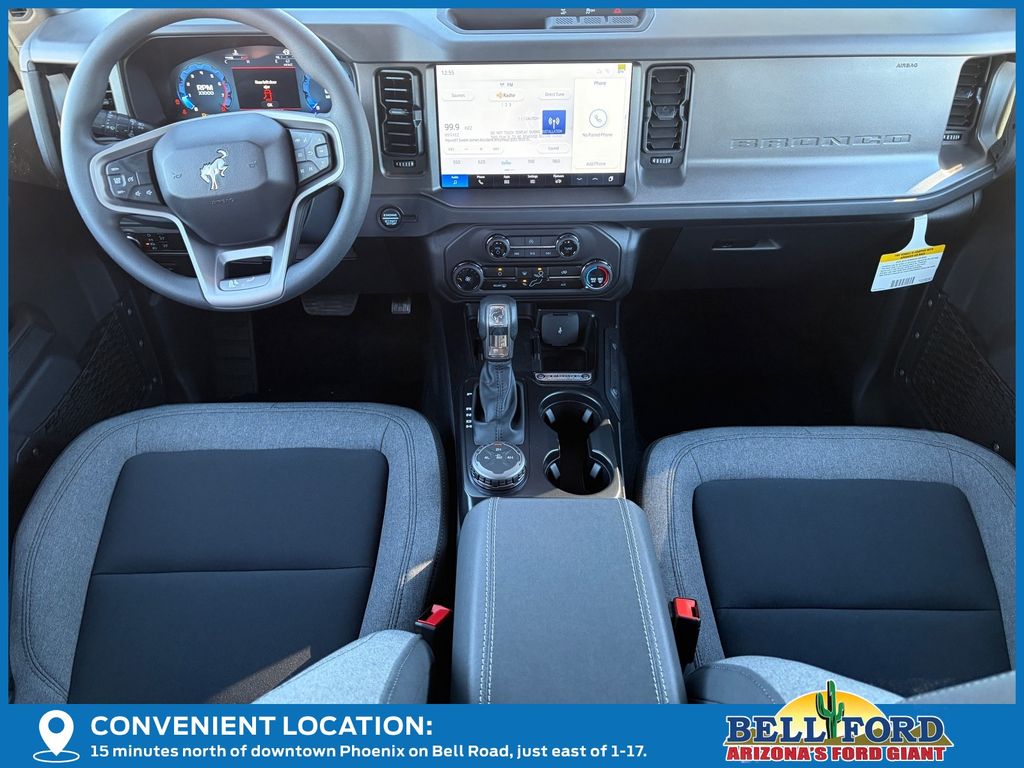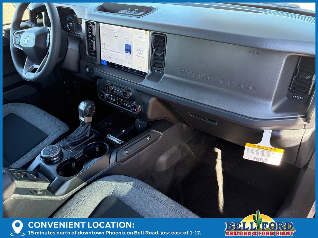 This Ford Bronco is equipped with the following options: Equipment Group 101A, 4-Wheel Disc Brakes, 4.46 Axle Ratio, 7 Speakers, ABS brakes, Air Conditioning, AM/FM radio: SiriusXM with 360L, AM/FM Stereo, Auto High-beam Headlights, Brake assist, Carbonized Gray Molded-In-Color Hard Top, Cloth Bucket Seats, Compass, Delay-off headlights, Driver door bin, Driver vanity mirror, Dual front impact airbags, Dual front side impact airbags, Electronic Stability Control, Emergency communication system: 911 Assist, Exterior Parking Camera Rear, Front anti-roll bar, Front Bucket Seats, Front Center Armrest, Front reading lights, Front wheel independent suspension, Fully automatic headlights, Hard Top Sound Deadening Headliner, Heated door mirrors, Illuminated entry, Integrated roll-over protection, Internet access capable: FordPass Connect, Low tire pressure warning, Occupant sensing airbag, Outside temperature display, Overhead airbag, Overhead console, Panic alarm, Passenger door bin, Passenger vanity mirror, Power door mirrors, Power steering, Power windows, Radio data system, Rear-Window Defroster & Washer, Remote keyless entry, Security system, SiriusXM w/360L, Speed control, Split folding rear seat, Steering wheel mounted audio controls, SYNC 4, Tachometer, Telescoping steering wheel, Tilt steering wheel, Traction control, Trip computer, Variably intermittent wipers, and Wheels: 16" Bright Polished Silver-Painted Steel. Price includes: $2500 - Retail Customer Cash. Exp. 03/31/2026