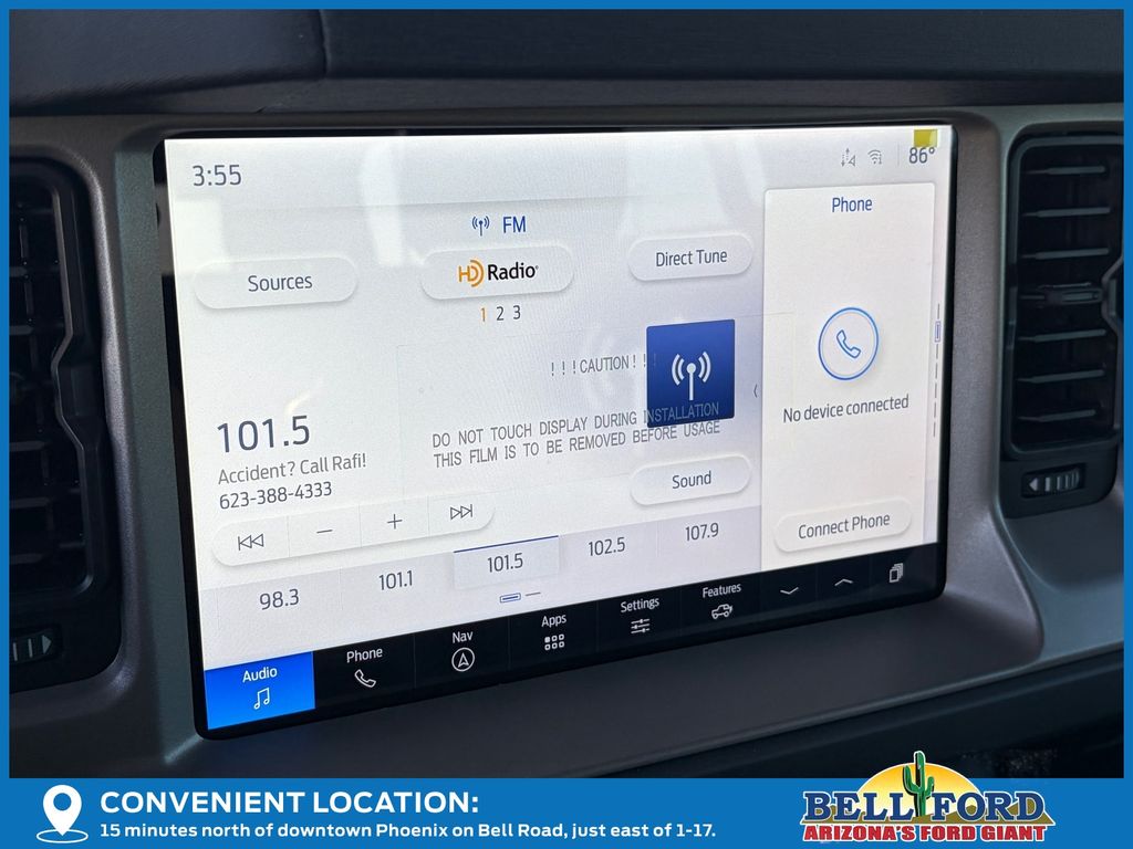 This Ford Bronco is equipped with the following options: Equipment Group 314A Lux Package (360-Degree Camera, Adaptive Cruise Control, Evasive Steering Assist, Front Parking Sensors, Information on Demand Panel, Radio: B&O Sound System by Bang & Olufsen, Sideview Mirrors, and Universal Garage Door Opener), Sasquatch Package (High Clearance Fender Flares, High Clearance Suspension, Position-Sensitive Bilstein Shock Absorbers, and Wheels: 17" Carbonized Gray Painted Aluminum), 18" Bright Machined Aluminum Wheels, 4-Wheel Disc Brakes, 7 Speakers, ABS brakes, Air Conditioning, Alloy wheels, AM/FM radio: SiriusXM with 360L, AM/FM Stereo, Auto High-beam Headlights, Auto-dimming Rear-View mirror, Automatic temperature control, Brake assist, Carbonized Gray Molded-In-Color Hard Top, Compass, Connected Navigation, Delay-off headlights, Driver door bin, Driver vanity mirror, Dual front impact airbags, Dual front side impact airbags, Electronic Stability Control, Emergency communication system: 911 Assist, Exterior Parking Camera Rear, Front anti-roll bar, Front Bucket Seats, Front Center Armrest, Front dual zone A/C, Front fog lights, Front reading lights, Front wheel independent suspension, Fully automatic headlights, Hard Top Sound Deadening Headliner, Heated door mirrors, Heated front seats, Heated Leather-Trimmed/Vinyl Bucket Seats, Heated steering wheel, Illuminated entry, Integrated roll-over protection, Internet access capable: FordPass Connect, Leather Shift Knob, Low tire pressure warning, Navigation system: Connected Navigation, Occupant sensing airbag, Outside temperature display, Overhead airbag, Overhead console, Panic alarm, Passenger door bin, Passenger vanity mirror, Power door mirrors, Power driver seat, Power passenger seat, Power steering, Power windows, Radio data system, Rear seat center armrest, Rear-Window Defroster & Washer, Remote keyless entry, Security system, SiriusXM w/360L, Speed control, Split folding rear seat, Steering wheel mounted audio controls, SYNC 4, Tachometer, Telescoping steering wheel, Tilt steering wheel, Traction control, Trip computer, Variably intermittent wipers, Voltmeter, and Wheels: 17" Black High Gloss-Painted Aluminum (64X) Price includes: $2500 - Retail Customer Cash. Exp. 03/31/2026 Price includes dealer added accessories totaling $7,600.