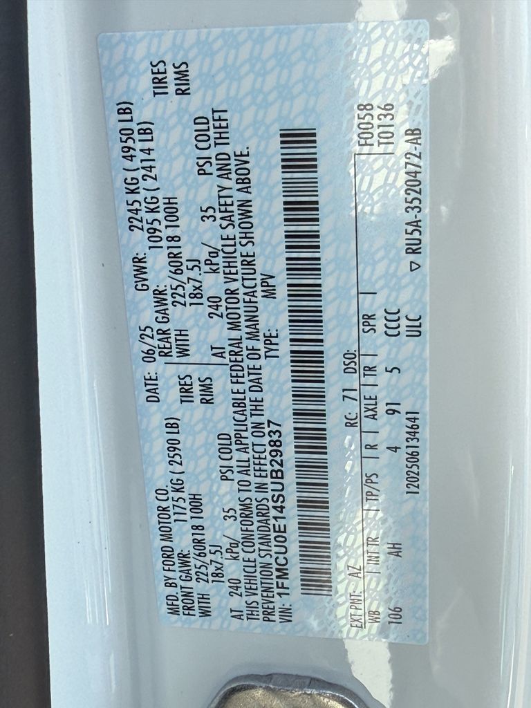 This Ford Escape Plug-In Hybrid is equipped with the following options: Class II Trailer Tow Package, Equipment Group 700A, Memory Package, PHEV Premium Package (10-Way Power Driver's Seat, 12.3" Productivity Screen in Instrument Cluster, 360-Degree Camera w/Split View, 6-Way Power Passenger Seat, Auto-Dimming Rear-View Mirror, Front Parking Sensors, HD Radio, Head-Up Display, Heated ActiveX-Trimmed Front Sport Contour Seats, LED Lightbar Headlamps, Perimeter Alarm, Radio: B&O Sound System by Bang & Olufsen, Reverse Brake Assist, Universal Garage Door Opener (UGDO), and Wireless Charging Pad), 2.5L iVCT, 2.91 Axle Ratio, 4-Wheel Disc Brakes, 6 Speakers, ABS brakes, Air Conditioning, Alloy wheels, AM/FM radio: SiriusXM, AM/FM Stereo, Auto High-beam Headlights, Automatic temperature control, Brake assist, Bumpers: body-color, Compass, Delay-off headlights, Driver door bin, Driver vanity mirror, Dual front impact airbags, Dual front side impact airbags, Electronic Stability Control, Emergency communication system: SYNC 4 911 Assist, FordPass Connect, Four wheel independent suspension, Front anti-roll bar, Front Bucket Seats, Front Center Armrest, Front dual zone A/C, Front fog lights, Front reading lights, Fully automatic headlights, Heated door mirrors, Heated front seats, Heated steering wheel, Heated Vinyl/Cloth Front Sport Contour Bucket Seats, Illuminated entry, Internet access capable: FordPass Connect 4G, Knee airbag, Low tire pressure warning, Navigation system: Connected Navigation, Occupant sensing airbag, Outside temperature display, Overhead airbag, Overhead console, Panic alarm, Passenger door bin, Passenger vanity mirror, Power door mirrors, Power driver seat, Power Liftgate, Power steering, Power windows, Radio data system, Rear anti-roll bar, Rear reading lights, Rear seat center armrest, Rear window defroster, Rear window wiper, Remote keyless entry, Speed control, Speed-sensing steering, Speed-Sensitive Wipers, Split folding rear seat, Spoiler, Steering wheel mounted audio controls, SYNC 4 w/Enhanced Voice Recognition, Telescoping steering wheel, Tilt steering wheel, Traction control, Trip computer, Variably intermittent wipers, and Wheels: 18" Machined-Face Magnetic Aluminum. Price includes: $7000 - Bonus Customer Cash. Exp. 02/02/2026