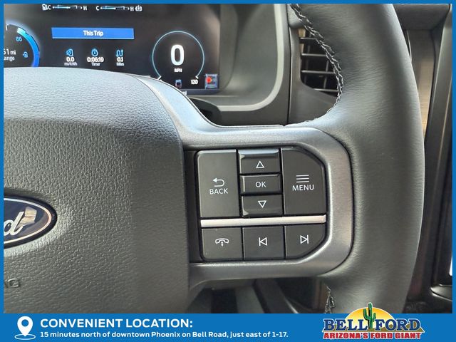 Equipment Group 312A Standard, 4-Wheel Disc Brakes, 8 Speakers, ABS brakes, ActiveX Trimmed Heated Front Seats, Adjustable pedals, Air Conditioning, Alloy wheels, Auto High-beam Headlights, Auto-dimming Rear-View mirror, Automatic temperature control, Brake assist, Bumpers: body-color, Compass, Delay-off headlights, Driver door bin, Driver vanity mirror, Dual front impact airbags, Dual front side impact airbags, Electronic Stability Control, Emergency communication system: SYNC 4 911 Assist, Four wheel independent suspension, Front anti-roll bar, Front Bucket Seats, Front Center Armrest, Front dual zone A/C, Front reading lights, Fully automatic headlights, Heated door mirrors, Heated front seats, Heated steering wheel, Illuminated entry, Knee airbag, Low tire pressure warning, Mobile Power Cord (120/240V), Navigation system: Connected Navigation, Occupant sensing airbag, Outside temperature display, Overhead airbag, Overhead console, Panic alarm, Passenger door bin, Passenger vanity mirror, Power door mirrors, Power driver seat, Power passenger seat, Power steering, Power windows, Radio data system, Radio: B&O Sound System by Bang & Olufsen, Rear anti-roll bar, Rear reading lights, Rear step bumper, Rear window defroster, Remote keyless entry, Security system, Speed control, Speed-sensing steering, Split folding rear seat, Steering wheel mounted audio controls, SYNC 4A w/Enhanced Voice Recognition, Tailgate Step w/Tailgate Work Surface, Telescoping steering wheel, Tilt steering wheel, Traction control, Trip computer, Turn signal indicator mirrors, Variably intermittent wipers, and Wheels: 20" Alloy Dark Carbonized Gray.