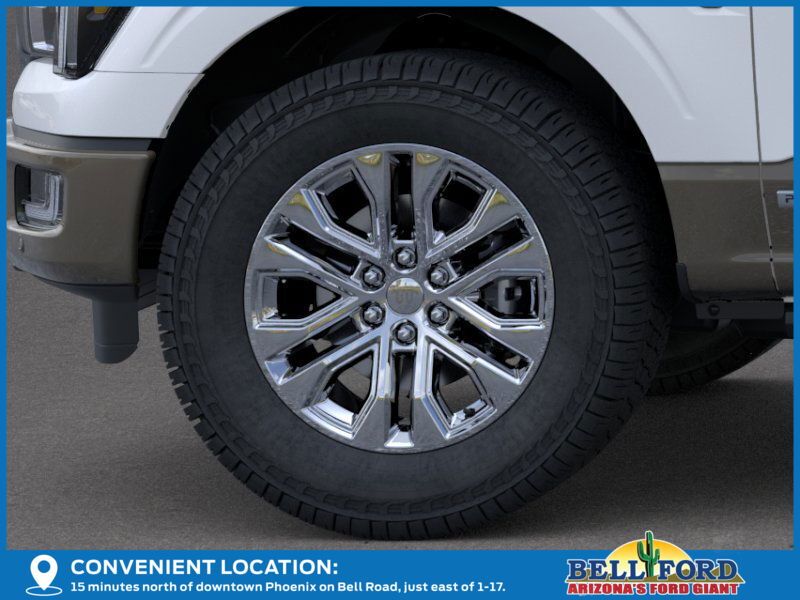 This Ford F-150 is equipped with the following options: Equipment Group 601A High, FX4 Off-Road Package (4x4 FX4 Off-Road Bodyside Decal, Hill Descent Control, Monotube Rear Shocks, Off-Road Tuned Front Shock Absorbers, and Rock Crawl Mode), 3.5L PowerBoost Full-Hybrid V6, 4WD, 14 Speakers, 4-Wheel Disc Brakes, ABS brakes, Adjustable pedals, Air Conditioning, Alloy wheels, AM/FM radio: SiriusXM with 360L, Auto High-beam Headlights, Auto tilt-away steering wheel, Auto-dimming door mirrors, Auto-dimming Rear-View mirror, Automatic temperature control, Brake assist, Chrome wheels, Compass, Delay-off headlights, Driver door bin, Driver vanity mirror, Dual front impact airbags, Dual front side impact airbags, Electronic Stability Control, Emergency communication system: SYNC 4 911 Assist, Front anti-roll bar, Front Bucket Seats, Front Center Armrest, Front dual zone A/C, Front fog lights, Front reading lights, Front wheel independent suspension, Fully automatic headlights, Garage door transmitter, Genuine wood dashboard insert, Heads-Up Display, Heated door mirrors, Heated front seats, Heated rear seats, Heated steering wheel, Illuminated entry, Internet access capable: FordPass Connect 5G, King Ranch Multicontour Leather Bucket Seats, Leather steering wheel, Low tire pressure warning, Memory seat, Navigation system: Connected Navigation, Occupant sensing airbag, Outside temperature display, Overhead airbag, Overhead console, Panic alarm, Passenger door bin, Passenger vanity mirror, Pedal memory, Power door mirrors, Power driver seat, Power moonroof, Power passenger seat, Power steering, Power windows, Radio data system, Radio: B&O Unleashed Sound System by Bang & Olufsen, Rain sensing wipers, Rear reading lights, Rear seat center armrest, Rear step bumper, Rear window defroster, Remote keyless entry, Security system, Speed control, Split folding rear seat, Steering wheel memory, Steering wheel mounted audio controls, SYNC 4 w/Enhanced Voice Recognition, Tachometer, Telescoping steering wheel, Tilt steering wheel, Traction control, Trip computer, Turn signal indicator mirrors, Variably intermittent wipers, Ventilated front seats, Voltmeter, and Wheels: 20" Chrome-Like PVD.