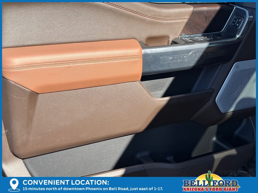 This Ford F-150 is equipped with the following options: Equipment Group 601A High, 4WD, 14 Speakers, 4-Wheel Disc Brakes, ABS brakes, Adjustable pedals, Air Conditioning, Alloy wheels, AM/FM radio: SiriusXM with 360L, Auto High-beam Headlights, Auto tilt-away steering wheel, Auto-dimming door mirrors, Auto-dimming Rear-View mirror, Automatic temperature control, Brake assist, Chrome wheels, Compass, Delay-off headlights, Driver door bin, Driver vanity mirror, Dual front impact airbags, Dual front side impact airbags, Electronic Locking w/3.55 Axle Ratio, Electronic Stability Control, Emergency communication system: SYNC 4 911 Assist, First Aid Kit w/Ford Logo, Front anti-roll bar, Front Bucket Seats, Front Center Armrest, Front dual zone A/C, Front fog lights, Front reading lights, Front wheel independent suspension, Fully automatic headlights, Garage door transmitter, Genuine wood dashboard insert, Heads-Up Display, Heated door mirrors, Heated front seats, Heated rear seats, Heated steering wheel, Illuminated entry, Internet access capable: FordPass Connect 5G, King Ranch Multicontour Leather Bucket Seats, Leather steering wheel, Low tire pressure warning, Memory seat, Navigation system: Connected Navigation, Occupant sensing airbag, Outside temperature display, Overhead airbag, Overhead console, Panic alarm, Passenger door bin, Passenger vanity mirror, Pedal memory, Power door mirrors, Power driver seat, Power moonroof, Power passenger seat, Power steering, Power windows, Radio data system, Radio: B&O Unleashed Sound System by Bang & Olufsen, Rain sensing wipers, Rear reading lights, Rear seat center armrest, Rear step bumper, Rear window defroster, Remote keyless entry, Security system, Speed control, Split folding rear seat, Steering wheel memory, Steering wheel mounted audio controls, SYNC 4 w/Enhanced Voice Recognition, Tachometer, Telescoping steering wheel, Tilt steering wheel, Traction control, Trip computer, Turn signal indicator mirrors, Variably intermittent wipers, Ventilated front seats, Voltmeter, and Wheels: 20" Chrome-Like PVD.