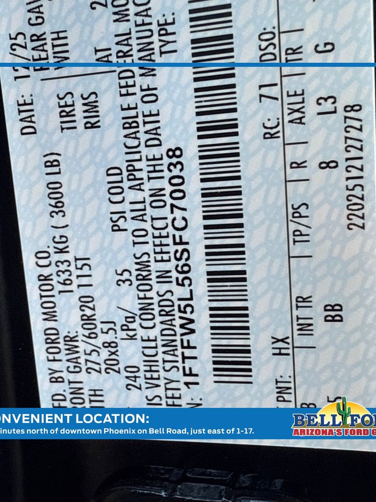 This Ford F-150 is equipped with the following options: Equipment Group 502A High (2nd Row Heated Seats, Ambient Lighting - Ice Blue Color Only, Heads-Up Display, Illuminated Driver & Passenger Visors, Power-Sliding Rear Window, Radio: B&O Unleashed Sound System by Bang & Olufsen, and Wheels: 20" Chrome-Like PVD), FX4 Off-Road Package (4x4 FX4 Off-Road Bodyside Decal, Hill Descent Control, Monotube Rear Shocks, Off-Road Tuned Front Shock Absorbers, Rock Crawl Mode, and Tray Style Floor Liner w/o Carpet Mats), Mobile Office Package (Console Worksurface, Partitioned Lockable Rear Storage, and Wireless Charging), 4WD, 4-Wheel Disc Brakes, 8 Speakers, ABS brakes, ActiveX Trimmed Bucket Seats, Adjustable pedals, Air Conditioning, Alloy wheels, AM/FM radio: SiriusXM with 360L, Auto High-beam Headlights, Auto-dimming door mirrors, Auto-dimming Rear-View mirror, Automatic temperature control, Brake assist, Bumpers: chrome, Chrome wheels, Compass, Delay-off headlights, Driver door bin, Driver vanity mirror, Dual front impact airbags, Dual front side impact airbags, Electronic Stability Control, Emergency communication system: SYNC 4 911 Assist, First Aid Kit w/Ford Logo, Front anti-roll bar, Front Bucket Seats, Front Center Armrest, Front dual zone A/C, Front fog lights, Front reading lights, Front wheel independent suspension, Fully automatic headlights, Garage door transmitter, Heated door mirrors, Heated front seats, Heated steering wheel, Illuminated entry, Internet access capable: FordPass Connect 5G, Low tire pressure warning, Memory seat, Navigation system: Connected Navigation, Occupant sensing airbag, Outside temperature display, Overhead airbag, Overhead console, Panic alarm, Passenger door bin, Passenger vanity mirror, Pedal memory, Power door mirrors, Power driver seat, Power passenger seat, Power steering, Power windows, Radio data system, Radio: B&O Sound System by Bang & Olufsen, Rain sensing wipers, Rear reading lights, Rear seat center armrest, Rear step bumper, Rear window defroster, Remote keyless entry, Security system, Speed control, Split folding rear seat, Steering wheel mounted audio controls, SYNC 4 w/Enhanced Voice Recognition, Tachometer, Telescoping steering wheel, Tilt steering wheel, Traction control, Trip computer, Turn signal indicator mirrors, Variably intermittent wipers, Ventilated front seats, Voltmeter, and Wheels: 18" Chrome-Like PVD. Price includes: $1000 - Truck Month Retail Bonus Cash. Exp. 03/31/2026 $2000 - Retail Customer Cash. Exp. 03/31/2026 $500 - Retail Bonus Cash. Exp. 03/31/2026