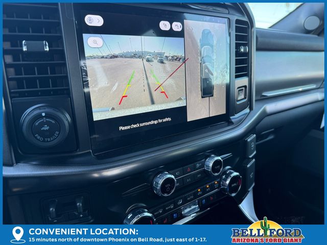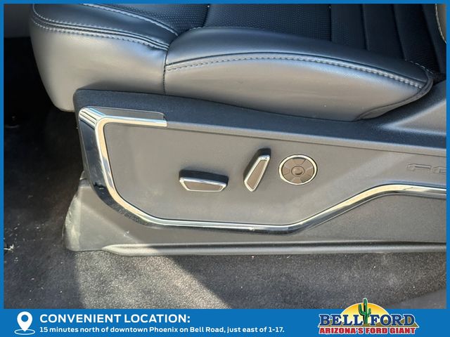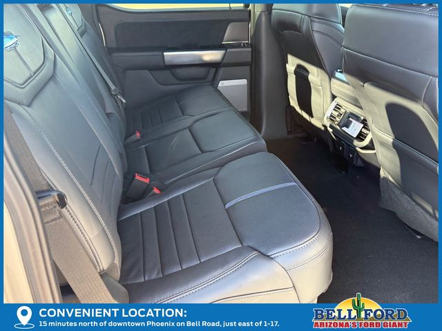 Equipment Group 701A Standard, 3.5L PowerBoost Full-Hybrid V6, 4WD, 4-Wheel Disc Brakes, 8 Speakers, ABS brakes, Adjustable pedals, Air Conditioning, Alloy wheels, AM/FM radio: SiriusXM with 360L, Auto High-beam Headlights, Auto tilt-away steering wheel, Auto-dimming door mirrors, Auto-dimming Rear-View mirror, Automatic temperature control, Brake assist, Bumpers: body-color, Compass, Delay-off headlights, Driver door bin, Driver vanity mirror, Dual front impact airbags, Dual front side impact airbags, Electronic Stability Control, Emergency communication system: SYNC 4 911 Assist, Front anti-roll bar, Front Bucket Seats, Front Center Armrest, Front dual zone A/C, Front fog lights, Front reading lights, Front wheel independent suspension, Fully automatic headlights, Garage door transmitter, Heated door mirrors, Heated front seats, Heated rear seats, Heated steering wheel, Illuminated entry, Leather steering wheel, LED Sideview Mirror Spotlights, Low tire pressure warning, Memory seat, Navigation system: Connected Navigation, Occupant sensing airbag, Outside temperature display, Overhead airbag, Overhead console, Panic alarm, Passenger door bin, Passenger vanity mirror, Pedal memory, Power door mirrors, Power driver seat, Power passenger seat, Power steering, Power Telescoping/Glass/Folding Trailer Tow Mirrors, Power windows, Radio data system, Radio: B&O Sound System by Bang & Olufsen, Rain sensing wipers, Rear reading lights, Rear seat center armrest, Rear step bumper, Rear window defroster, Remote keyless entry, Security system, Speed control, Split folding rear seat, Steering wheel memory, Steering wheel mounted audio controls, SYNC 4 w/Enhanced Voice Recognition, Tachometer, Telescoping steering wheel, Tilt steering wheel, Tough Bed Spray-In Bedliner, Traction control, Tray Style Floor Liner, Trip computer, Turn signal indicator mirrors, Unique Multi-Contour Leather Bucket Seats, Variably intermittent wipers, Ventilated front seats, Voltmeter, Wheel Well Liner, and Wheels: 20" Painted Gloss Ebony Black.