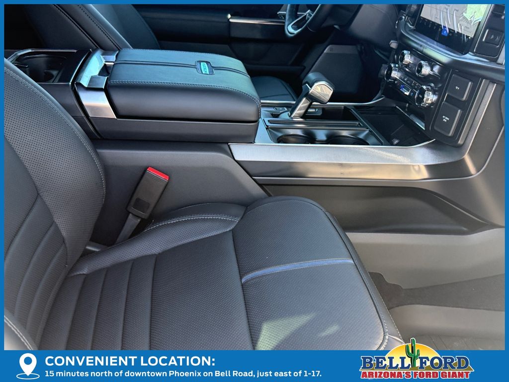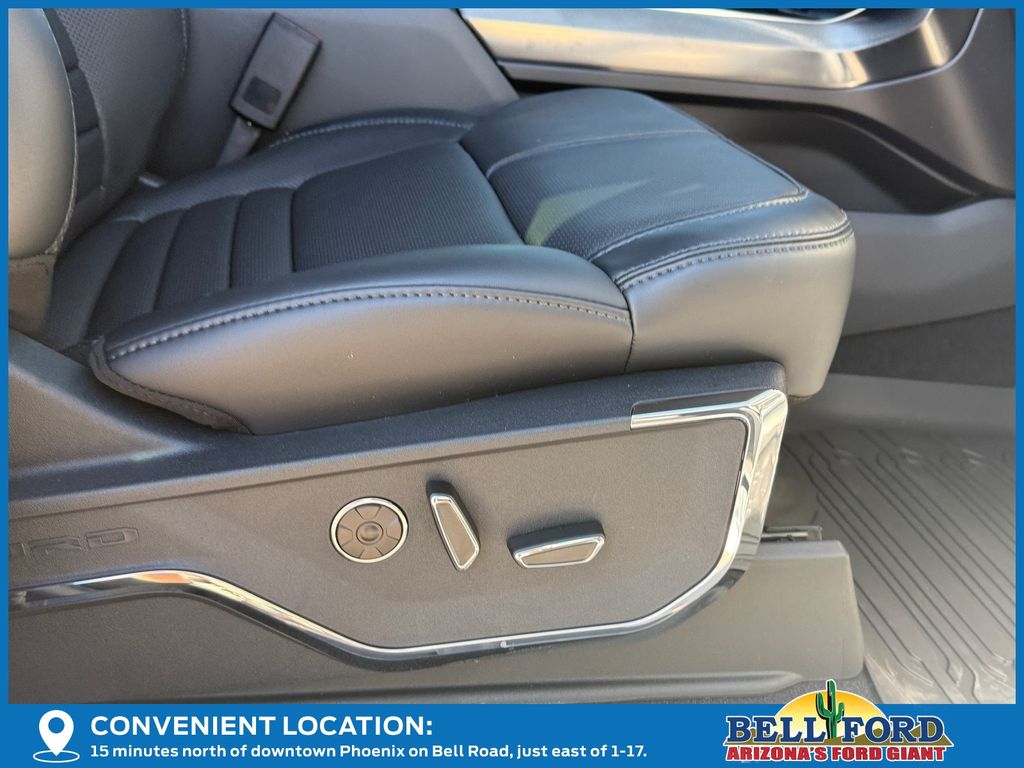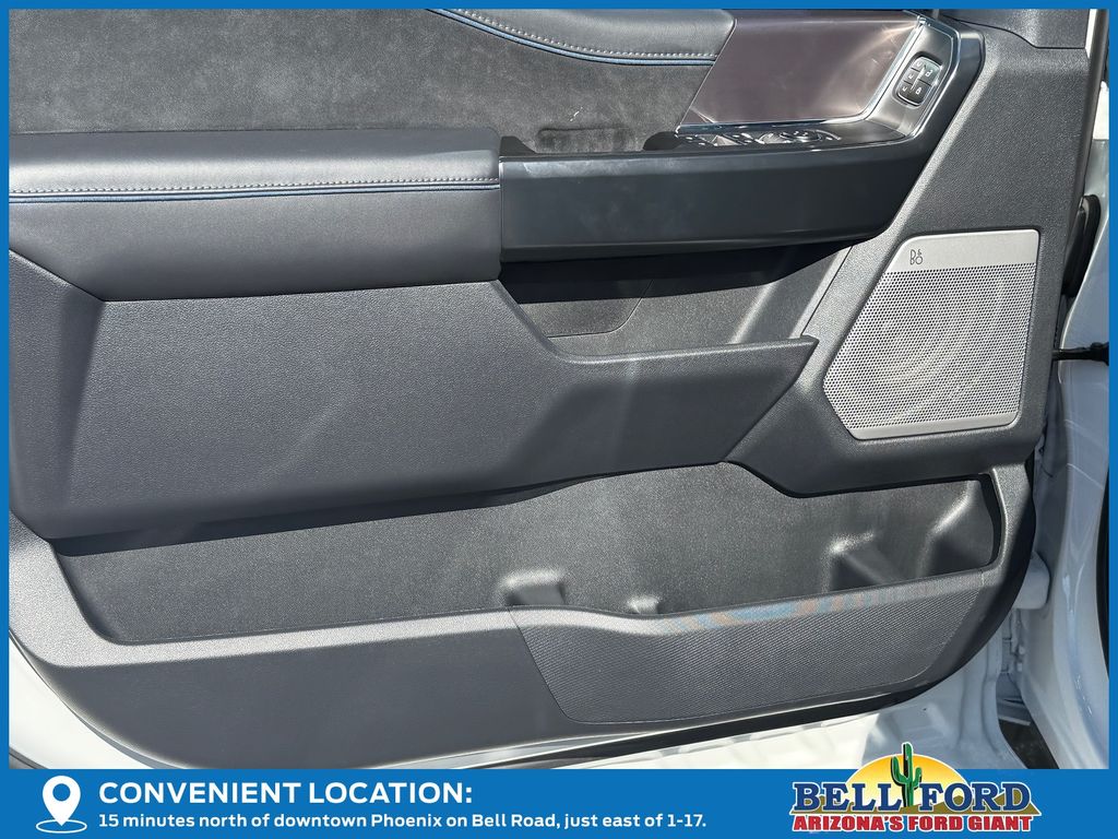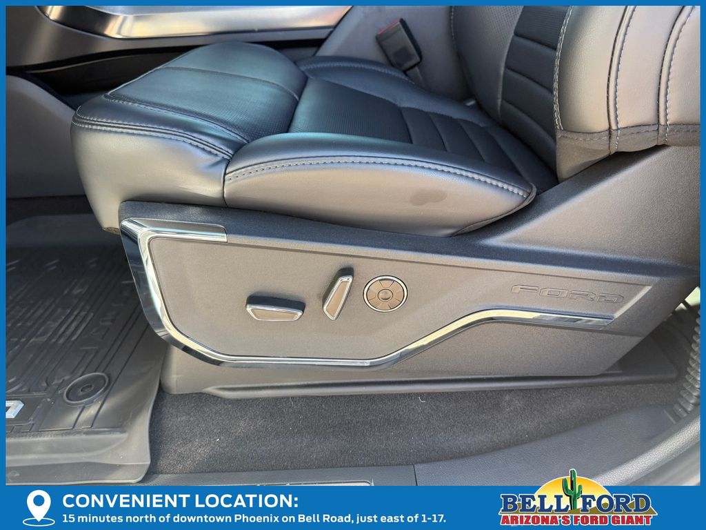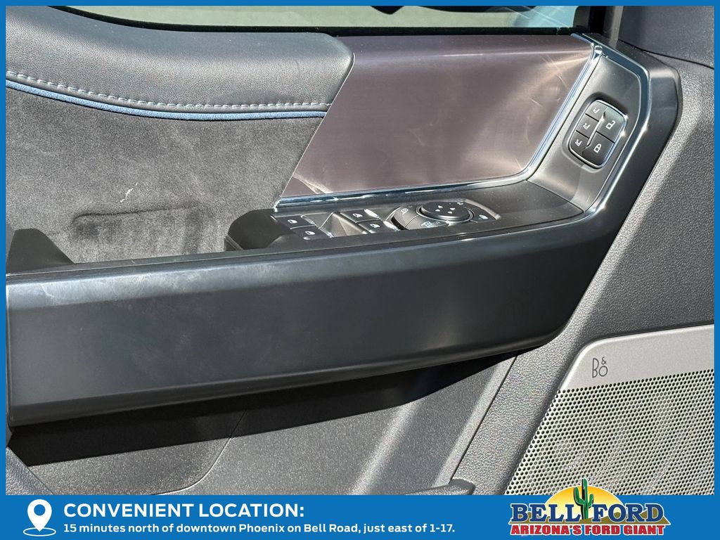 This Ford F-150 is equipped with the following options: Equipment Group 701A Standard, FX4 Off-Road Package (4x4 FX4 Off-Road Bodyside Decal, Hill Descent Control, Monotube Rear Shocks, Off-Road Tuned Front Shock Absorbers, and Rock Crawl Mode), 4WD, 4-Wheel Disc Brakes, 8 Speakers, ABS brakes, Adjustable pedals, Air Conditioning, Alloy wheels, AM/FM radio: SiriusXM with 360L, Auto High-beam Headlights, Auto tilt-away steering wheel, Auto-dimming door mirrors, Auto-dimming Rear-View mirror, Automatic temperature control, Brake assist, Bumpers: body-color, Compass, Delay-off headlights, Driver door bin, Driver vanity mirror, Dual front impact airbags, Dual front side impact airbags, Electronic Locking w/3.55 Axle Ratio, Electronic Stability Control, Emergency communication system: SYNC 4 911 Assist, Exposed Wheel Lock Kit, Front anti-roll bar, Front Bucket Seats, Front Center Armrest, Front dual zone A/C, Front fog lights, Front reading lights, Front wheel independent suspension, Fully automatic headlights, Garage door transmitter, Heated door mirrors, Heated front seats, Heated rear seats, Heated steering wheel, Illuminated entry, Internet access capable: FordPass Connect 5G, Leather steering wheel, Low tire pressure warning, Memory seat, Navigation system: Connected Navigation, Occupant sensing airbag, Outside temperature display, Overhead airbag, Overhead console, Panic alarm, Passenger door bin, Passenger vanity mirror, Pedal memory, Power door mirrors, Power driver seat, Power passenger seat, Power steering, Power windows, Radio data system, Radio: B&O Sound System by Bang & Olufsen, Rain sensing wipers, Rear reading lights, Rear seat center armrest, Rear step bumper, Rear window defroster, Remote keyless entry, Security system, Speed control, Split folding rear seat, Steering wheel memory, Steering wheel mounted audio controls, SYNC 4 w/Enhanced Voice Recognition, Tachometer, Telescoping steering wheel, Tilt steering wheel, Tough Bed Spray-In Bedliner, Traction control, Tray Style Floor Liner, Trip computer, Turn signal indicator mirrors, Unique Multi-Contour Leather Bucket Seats, Variably intermittent wipers, Ventilated front seats, Voltmeter, Wheel Well Liner, and Wheels: 20" Painted Gloss Ebony Black.