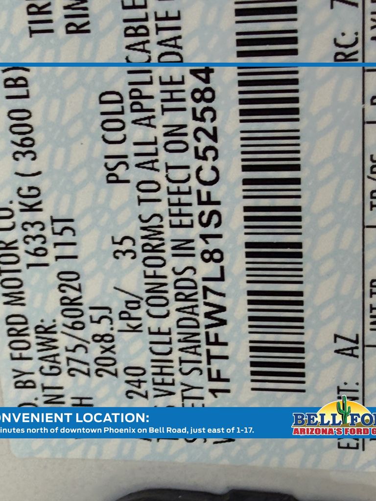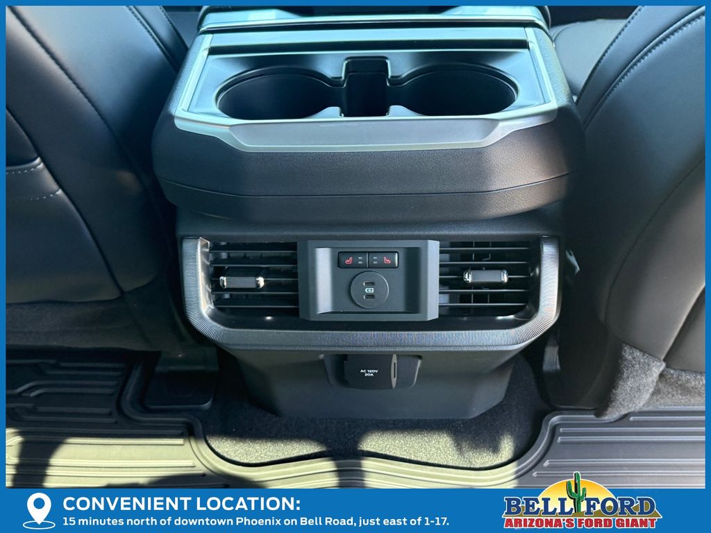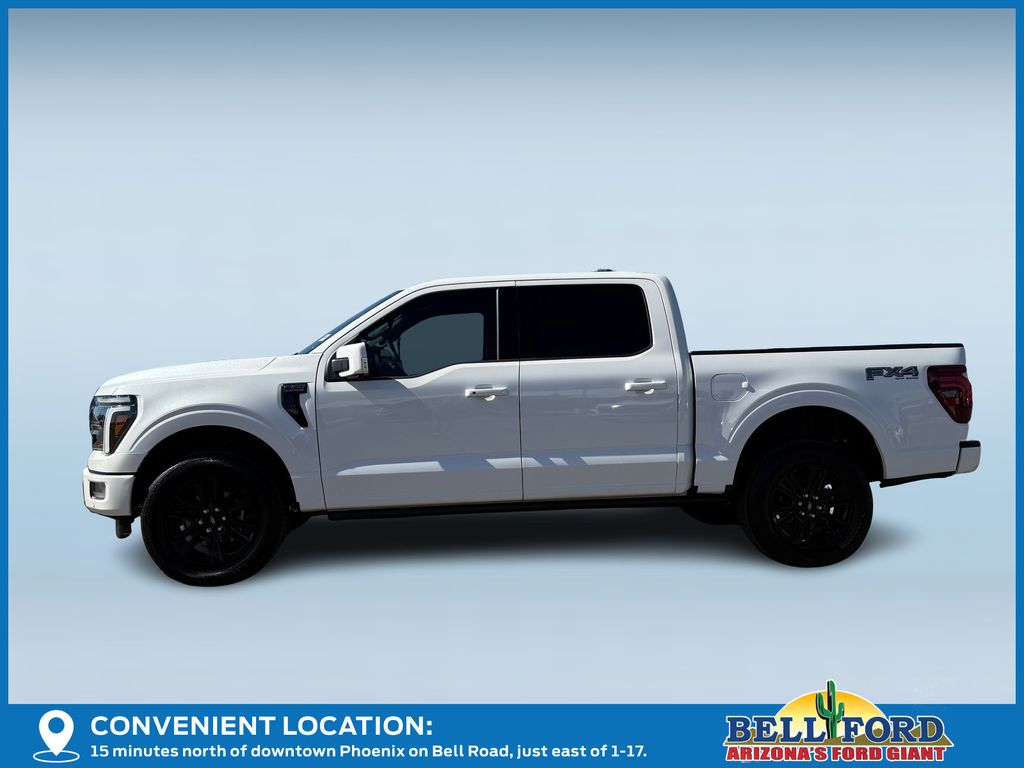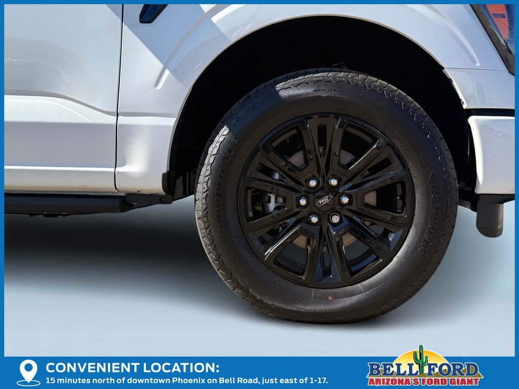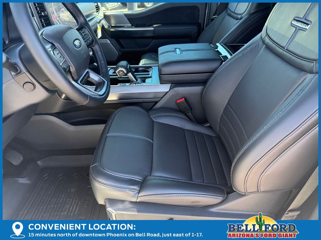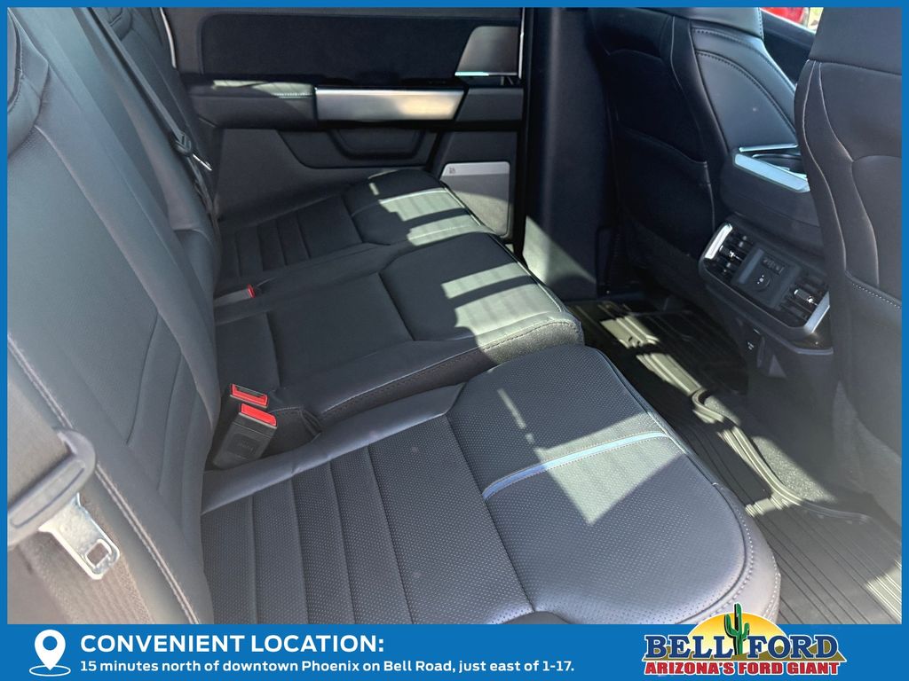 This Ford F-150 is equipped with the following options: Equipment Group 701A Standard, FX4 Off-Road Package (4x4 FX4 Off-Road Bodyside Decal, Hill Descent Control, Monotube Rear Shocks, Off-Road Tuned Front Shock Absorbers, and Rock Crawl Mode), 4WD, 4-Wheel Disc Brakes, 8 Speakers, ABS brakes, Adjustable pedals, Air Conditioning, Alloy wheels, AM/FM radio: SiriusXM with 360L, Auto High-beam Headlights, Auto tilt-away steering wheel, Auto-dimming door mirrors, Auto-dimming Rear-View mirror, Automatic temperature control, Brake assist, Bumpers: body-color, Compass, Delay-off headlights, Driver door bin, Driver vanity mirror, Dual front impact airbags, Dual front side impact airbags, Electronic Locking w/3.55 Axle Ratio, Electronic Stability Control, Emergency communication system: SYNC 4 911 Assist, Exposed Wheel Lock Kit, Front anti-roll bar, Front Bucket Seats, Front Center Armrest, Front dual zone A/C, Front fog lights, Front reading lights, Front wheel independent suspension, Fully automatic headlights, Garage door transmitter, Heated door mirrors, Heated front seats, Heated rear seats, Heated steering wheel, Illuminated entry, Internet access capable: FordPass Connect 5G, Leather steering wheel, Low tire pressure warning, Memory seat, Navigation system: Connected Navigation, Occupant sensing airbag, Outside temperature display, Overhead airbag, Overhead console, Panic alarm, Passenger door bin, Passenger vanity mirror, Pedal memory, Power door mirrors, Power driver seat, Power passenger seat, Power steering, Power windows, Radio data system, Radio: B&O Sound System by Bang & Olufsen, Rain sensing wipers, Rear reading lights, Rear seat center armrest, Rear step bumper, Rear window defroster, Remote keyless entry, Security system, Speed control, Split folding rear seat, Steering wheel memory, Steering wheel mounted audio controls, SYNC 4 w/Enhanced Voice Recognition, Tachometer, Telescoping steering wheel, Tilt steering wheel, Tough Bed Spray-In Bedliner, Traction control, Tray Style Floor Liner, Trip computer, Turn signal indicator mirrors, Unique Multi-Contour Leather Bucket Seats, Variably intermittent wipers, Ventilated front seats, Voltmeter, Wheel Well Liner, and Wheels: 20" Painted Gloss Ebony Black.