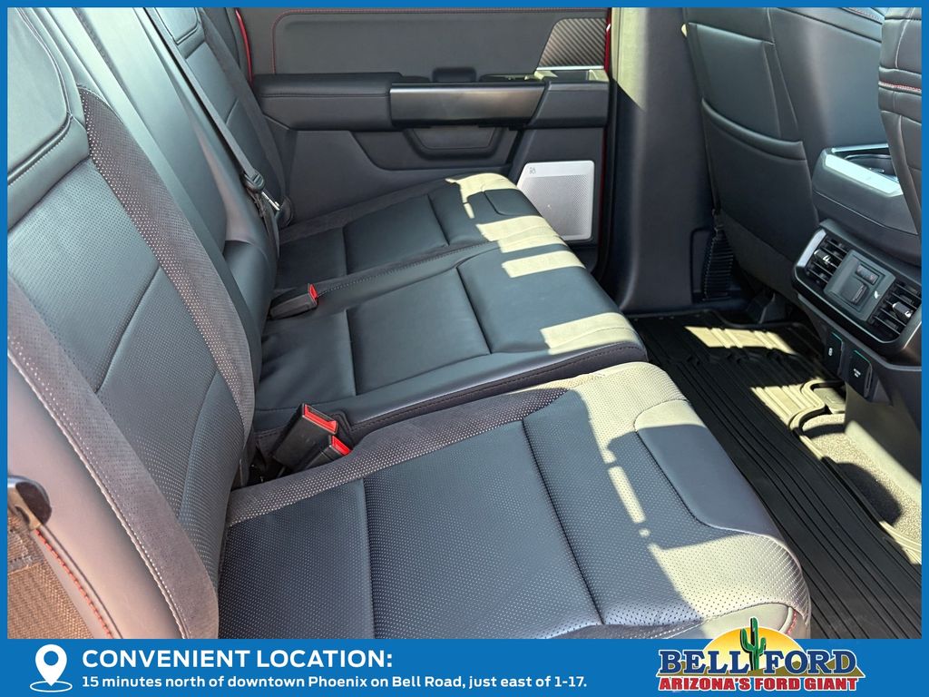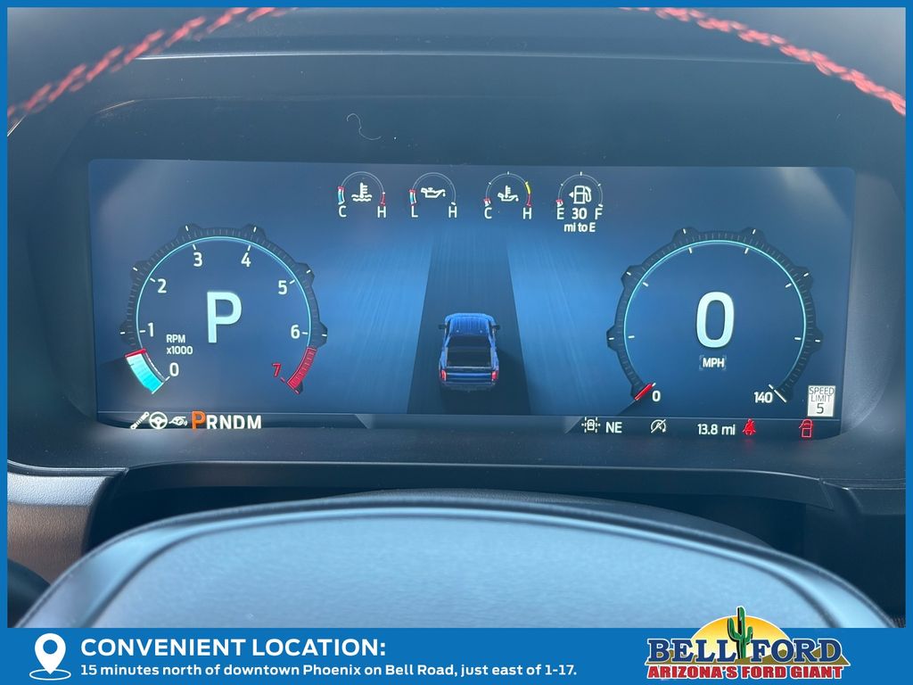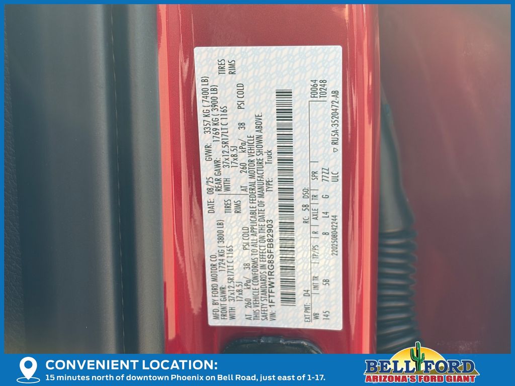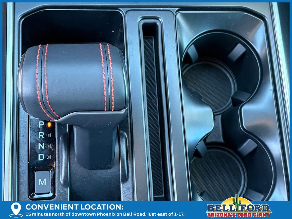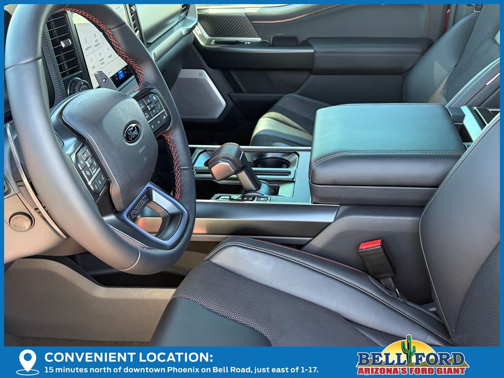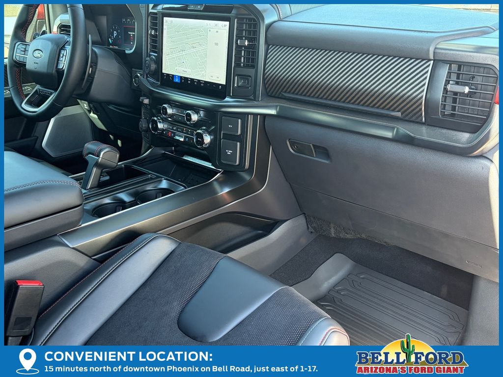 This Ford F-150 is equipped with the following options: Equipment Group 802A Raptor 37 (Carbon Fiber Interior Appliques, Dual Valve Shocks, Modular Front Bumper, RECARO Alcantara Suede Front Seats, and Wheels: Raptor 37 Unique 17" Cast Aluminum), 4WD, 14 Speakers, 17" Cast Aluminum Wheels, 4-Wheel Disc Brakes, ABS brakes, Adjustable pedals, Air Conditioning, Alloy wheels, AM/FM radio: SiriusXM with 360L, Auto High-beam Headlights, Auto tilt-away steering wheel, Auto-dimming door mirrors, Auto-dimming Rear-View mirror, Automatic temperature control, Brake assist, Bumpers: body-color, Compass, Delay-off headlights, Driver door bin, Driver vanity mirror, Dual front impact airbags, Dual front side impact airbags, Electronic Locking w/4.10 Axle Ratio, Electronic Stability Control, Emergency communication system: SYNC 4 911 Assist, Front anti-roll bar, Front Bucket Seats, Front Center Armrest, Front dual zone A/C, Front fog lights, Front License Plate Bracket, Front reading lights, Front wheel independent suspension, Fully automatic headlights, Garage door transmitter, Heads-Up Display, Heated door mirrors, Heated front seats, Heated rear seats, Heated steering wheel, Illuminated entry, Internet access capable: FordPass Connect 5G, Lane Departure Warning System, Leather steering wheel, Leather Trimmed Seats, Low tire pressure warning, Memory seat, Navigation system: Connected Navigation, Occupant sensing airbag, Outside temperature display, Overhead airbag, Overhead console, Panic alarm, Passenger door bin, Passenger vanity mirror, Pedal memory, Power door mirrors, Power driver seat, Power passenger seat, Power steering, Power windows, Radio data system, Radio: B&O Unleashed Sound System by Bang & Olufsen, Rain sensing wipers, Rear reading lights, Rear step bumper, Rear window defroster, Remote keyless entry, Security system, Speed control, Speed-sensing steering, Split folding rear seat, Steering wheel memory, Steering wheel mounted audio controls, SYNC 4 w/Enhanced Voice Recognition, Tachometer, Telescoping steering wheel, Tilt steering wheel, Tough Bed Spray-In Bedliner, Traction control, Trip computer, Turn signal indicator mirrors, Twin Panel Moonroof, Variably intermittent wipers, and Ventilated front seats.