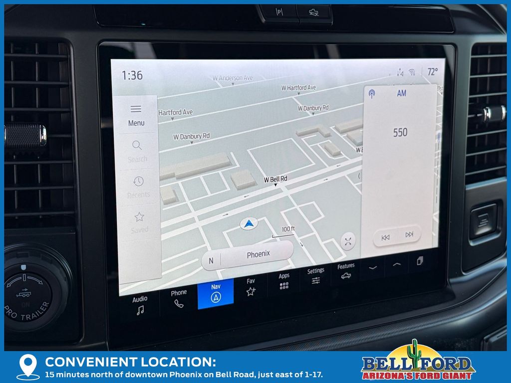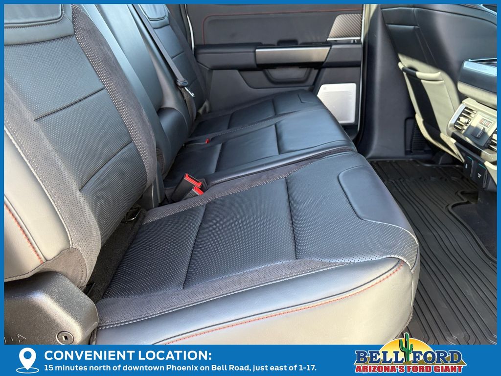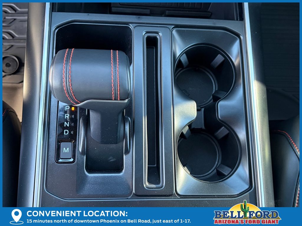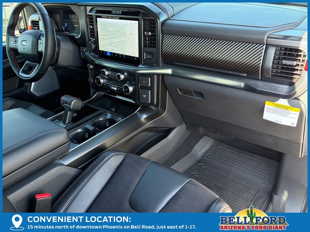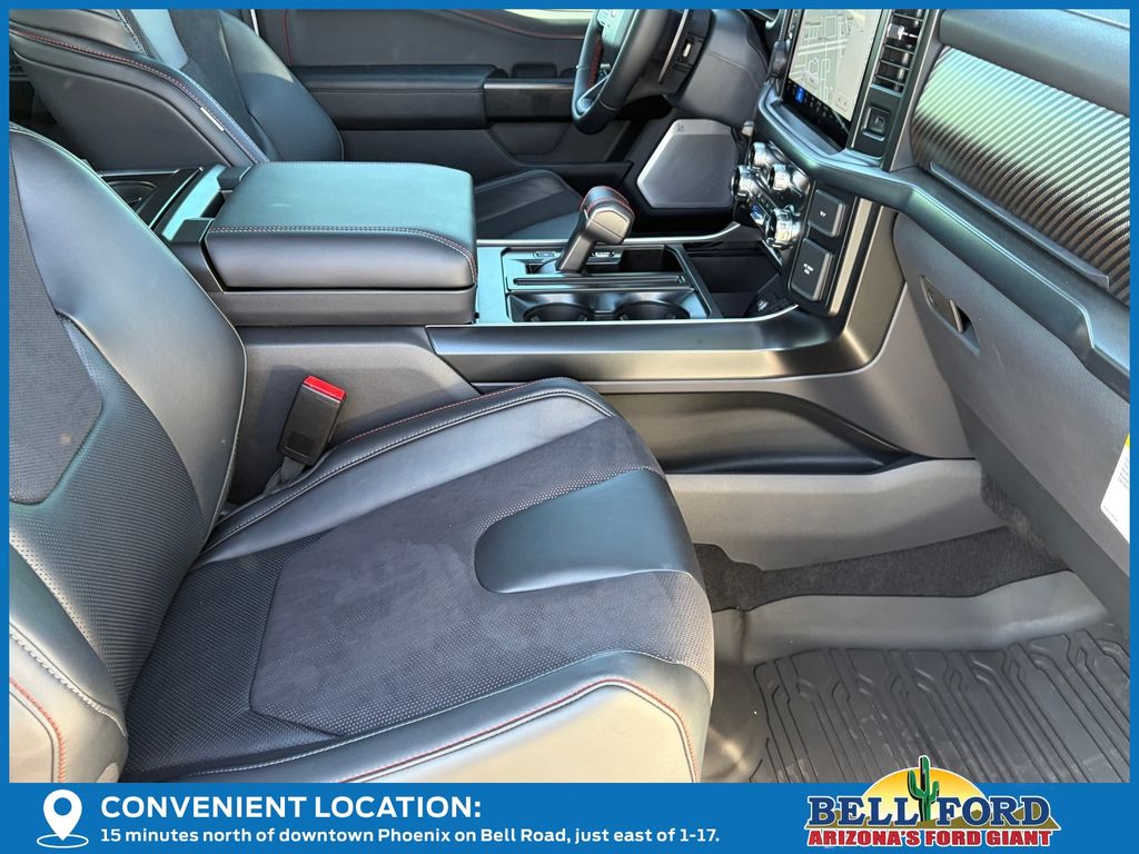 This Ford F-150 is equipped with the following options: Equipment Group 802A Raptor 37 (Carbon Fiber Interior Appliques, Dual Valve Shocks, Modular Front Bumper, RECARO Alcantara Suede Front Seats, and Wheels: Raptor 37 Unique 17" Cast Aluminum), 4WD, 14 Speakers, 17" Cast Aluminum Wheels, 4-Wheel Disc Brakes, ABS brakes, Adjustable pedals, Air Conditioning, Alloy wheels, AM/FM radio: SiriusXM with 360L, Auto High-beam Headlights, Auto tilt-away steering wheel, Auto-dimming door mirrors, Auto-dimming Rear-View mirror, Automatic temperature control, Brake assist, Bumpers: body-color, Compass, Delay-off headlights, Driver door bin, Driver vanity mirror, Dual front impact airbags, Dual front side impact airbags, Electronic Locking w/4.10 Axle Ratio, Electronic Stability Control, Emergency communication system: SYNC 4 911 Assist, Front anti-roll bar, Front Bucket Seats, Front Center Armrest, Front dual zone A/C, Front fog lights, Front reading lights, Front wheel independent suspension, Fully automatic headlights, Garage door transmitter, Heads-Up Display, Heated door mirrors, Heated front seats, Heated rear seats, Heated steering wheel, Illuminated entry, Internet access capable: FordPass Connect 5G, Lane Departure Warning System, Leather steering wheel, Leather Trimmed Seats, Low tire pressure warning, Memory seat, Navigation system: Connected Navigation, Occupant sensing airbag, Outside temperature display, Overhead airbag, Overhead console, Panic alarm, Passenger door bin, Passenger vanity mirror, Pedal memory, Power door mirrors, Power driver seat, Power passenger seat, Power steering, Power windows, Radio data system, Radio: B&O Unleashed Sound System by Bang & Olufsen, Rain sensing wipers, Rear reading lights, Rear step bumper, Rear window defroster, Remote keyless entry, Security system, Speed control, Speed-sensing steering, Split folding rear seat, Steering wheel memory, Steering wheel mounted audio controls, SYNC 4 w/Enhanced Voice Recognition, Tachometer, Telescoping steering wheel, Tilt steering wheel, Tough Bed Spray-In Bedliner, Traction control, Trip computer, Turn signal indicator mirrors, Twin Panel Moonroof, Variably intermittent wipers, and Ventilated front seats.