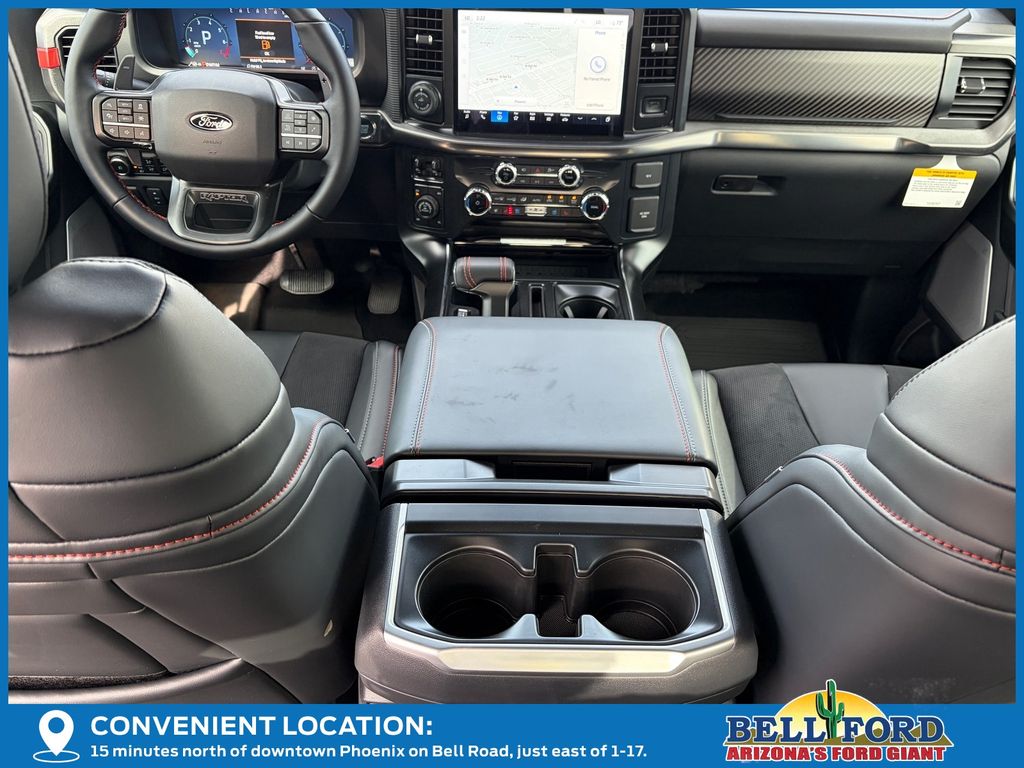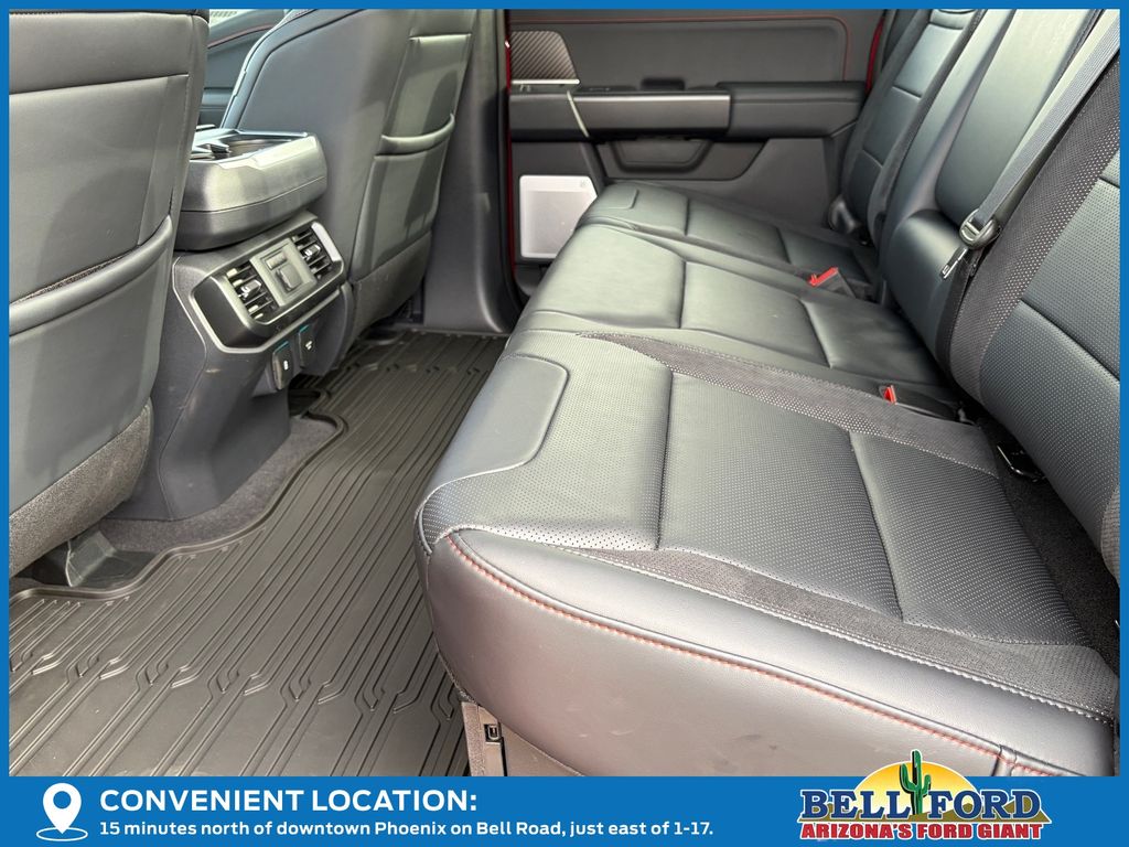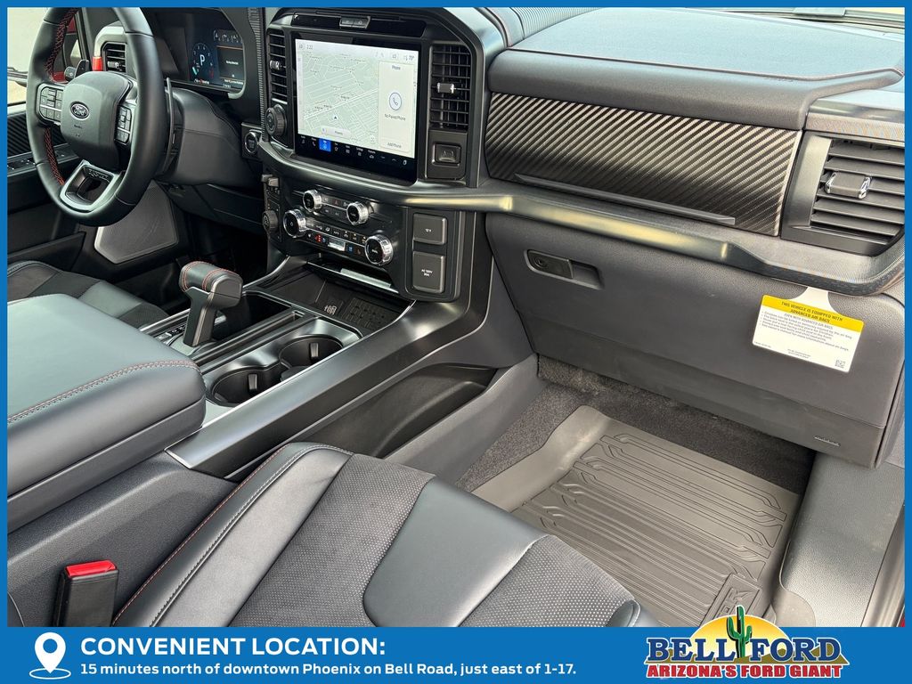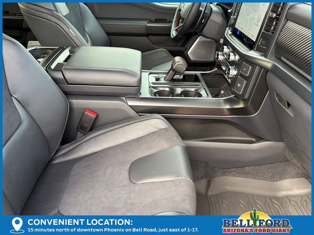 This Ford F-150 is equipped with the following options: Equipment Group 802A Raptor 37 (Carbon Fiber Interior Appliques, Dual Valve Shocks, Modular Front Bumper, RECARO Alcantara Suede Front Seats, and Wheels: Raptor 37 Unique 17" Cast Aluminum), 4WD, 14 Speakers, 17" Cast Aluminum Wheels, 4-Wheel Disc Brakes, ABS brakes, Adjustable pedals, Air Conditioning, Alloy wheels, AM/FM radio: SiriusXM with 360L, Auto High-beam Headlights, Auto tilt-away steering wheel, Auto-dimming door mirrors, Auto-dimming Rear-View mirror, Automatic temperature control, Brake assist, Bumpers: body-color, Compass, Delay-off headlights, Driver door bin, Driver vanity mirror, Dual front impact airbags, Dual front side impact airbags, Electronic Locking w/4.10 Axle Ratio, Electronic Stability Control, Emergency communication system: SYNC 4 911 Assist, Front anti-roll bar, Front Bucket Seats, Front Center Armrest, Front dual zone A/C, Front fog lights, Front License Plate Bracket, Front reading lights, Front wheel independent suspension, Fully automatic headlights, Garage door transmitter, Heads-Up Display, Heated door mirrors, Heated front seats, Heated rear seats, Heated steering wheel, Illuminated entry, Internet access capable: FordPass Connect 5G, Lane Departure Warning System, Leather steering wheel, Leather Trimmed Seats, Low tire pressure warning, Memory seat, Navigation system: Connected Navigation, Occupant sensing airbag, Outside temperature display, Overhead airbag, Overhead console, Panic alarm, Passenger door bin, Passenger vanity mirror, Pedal memory, Power door mirrors, Power driver seat, Power passenger seat, Power steering, Power windows, Radio data system, Radio: B&O Unleashed Sound System by Bang & Olufsen, Rain sensing wipers, Rear reading lights, Rear step bumper, Rear window defroster, Remote keyless entry, Security system, Speed control, Speed-sensing steering, Split folding rear seat, Steering wheel memory, Steering wheel mounted audio controls, SYNC 4 w/Enhanced Voice Recognition, Tachometer, Telescoping steering wheel, Tilt steering wheel, Traction control, Trip computer, Turn signal indicator mirrors, Variably intermittent wipers, and Ventilated front seats.