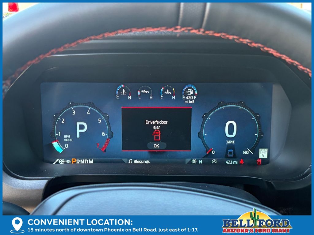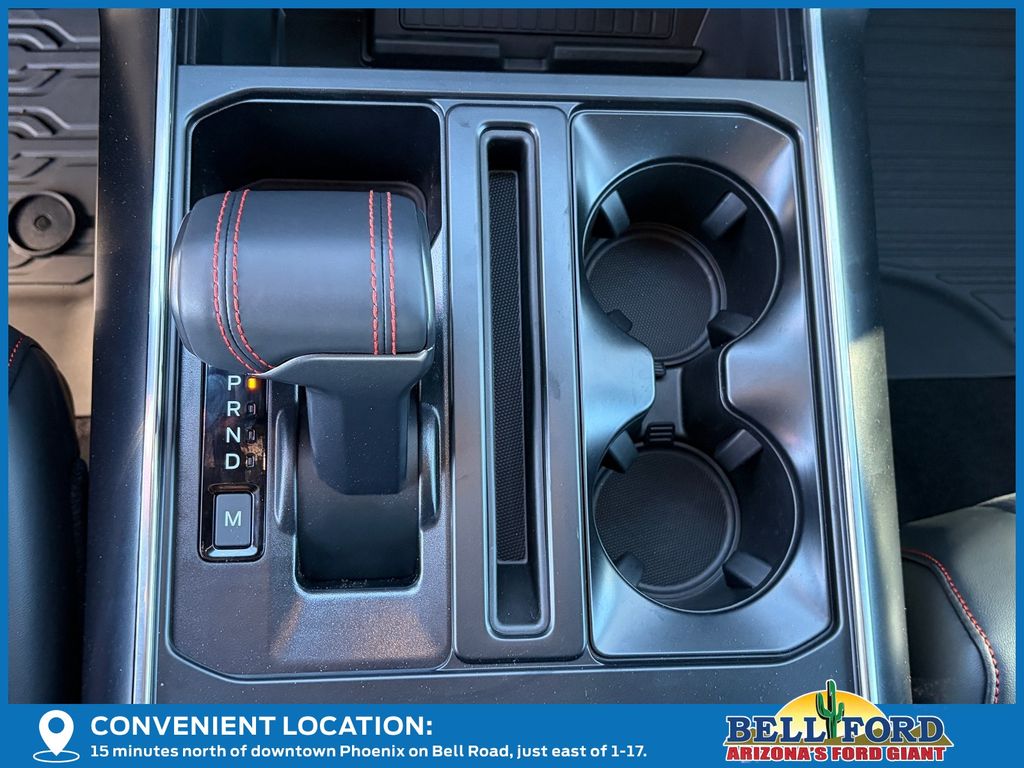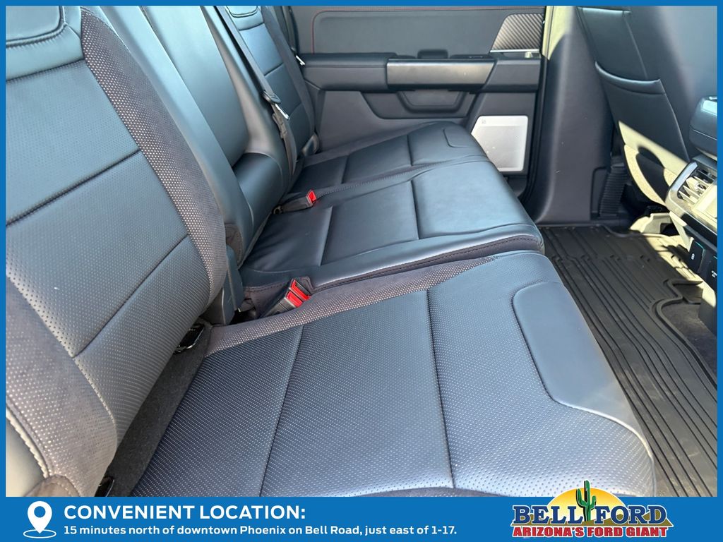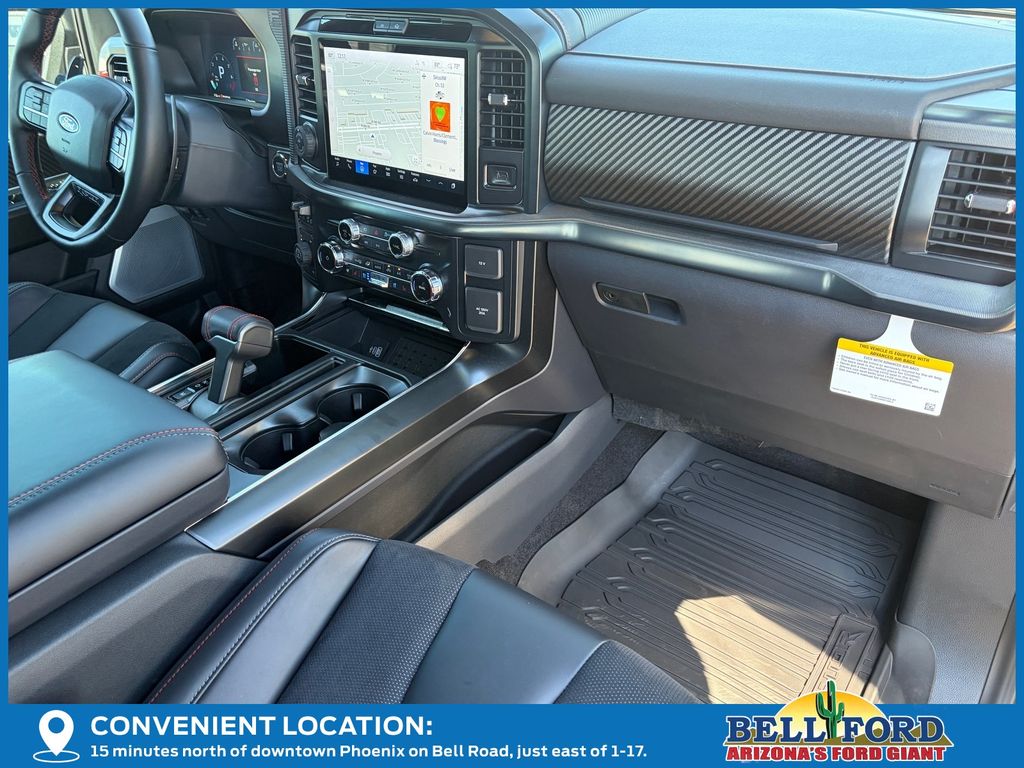 This Ford F-150 is equipped with the following options: Equipment Group 802A Raptor 37 (Carbon Fiber Interior Appliques, Dual Valve Shocks, Modular Front Bumper, RECARO Alcantara Suede Front Seats, and Wheels: Raptor 37 Unique 17" Cast Aluminum), 4WD, 14 Speakers, 17" Cast Aluminum Wheels, 4-Wheel Disc Brakes, ABS brakes, Adjustable pedals, Air Conditioning, Alloy wheels, AM/FM radio: SiriusXM with 360L, Auto High-beam Headlights, Auto tilt-away steering wheel, Auto-dimming door mirrors, Auto-dimming Rear-View mirror, Automatic temperature control, Brake assist, Bumpers: body-color, Compass, Delay-off headlights, Driver door bin, Driver vanity mirror, Dual front impact airbags, Dual front side impact airbags, Electronic Locking w/4.10 Axle Ratio, Electronic Stability Control, Emergency communication system: SYNC 4 911 Assist, Front anti-roll bar, Front Bucket Seats, Front Center Armrest, Front dual zone A/C, Front fog lights, Front License Plate Bracket, Front reading lights, Front wheel independent suspension, Fully automatic headlights, Garage door transmitter, Heads-Up Display, Heated door mirrors, Heated front seats, Heated rear seats, Heated steering wheel, Illuminated entry, Internet access capable: FordPass Connect 5G, Lane Departure Warning System, Leather steering wheel, Leather Trimmed Seats, Low tire pressure warning, Memory seat, Navigation system: Connected Navigation, Occupant sensing airbag, Outside temperature display, Overhead airbag, Overhead console, Panic alarm, Passenger door bin, Passenger vanity mirror, Pedal memory, Power door mirrors, Power driver seat, Power passenger seat, Power steering, Power windows, Radio data system, Radio: B&O Unleashed Sound System by Bang & Olufsen, Rain sensing wipers, Rear reading lights, Rear step bumper, Rear window defroster, Remote keyless entry, Security system, Speed control, Speed-sensing steering, Split folding rear seat, Steering wheel memory, Steering wheel mounted audio controls, SYNC 4 w/Enhanced Voice Recognition, Tachometer, Telescoping steering wheel, Tilt steering wheel, Tough Bed Spray-In Bedliner, Traction control, Trip computer, Turn signal indicator mirrors, Twin Panel Moonroof, Variably intermittent wipers, and Ventilated front seats.