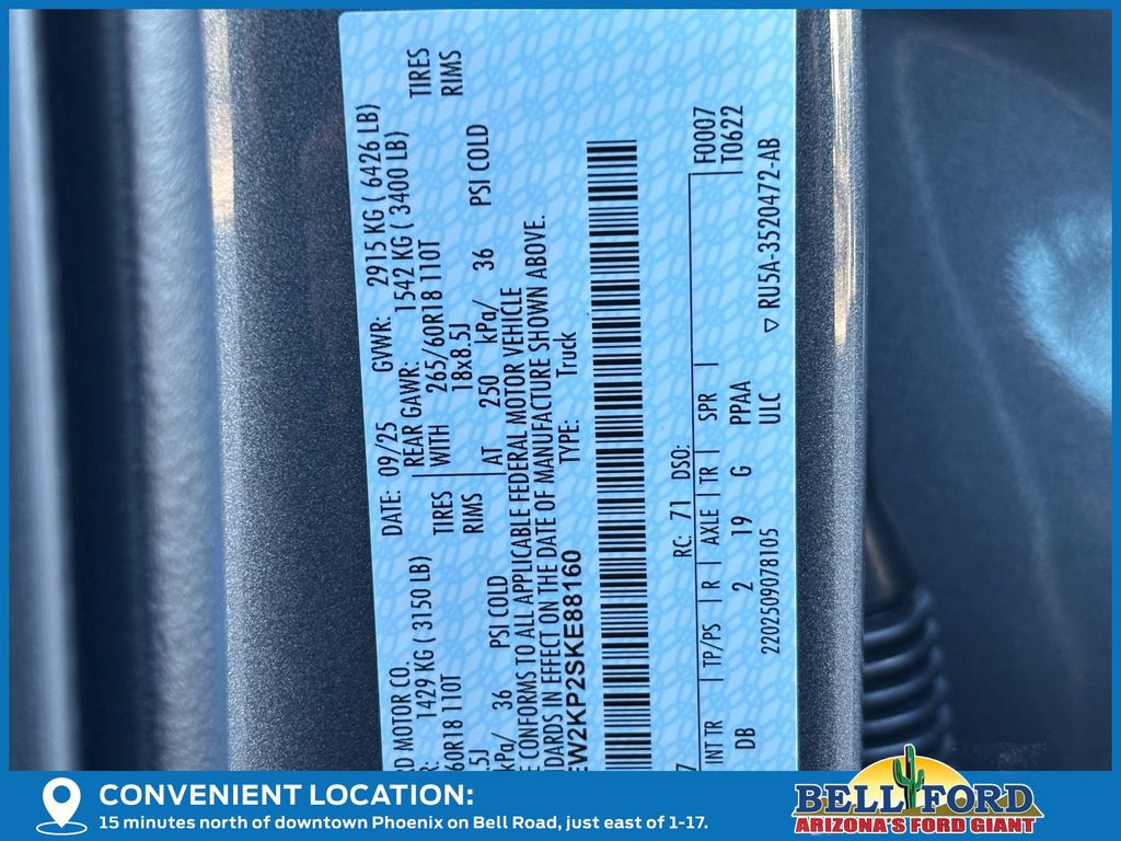 This Ford F-150 is equipped with the following options: Equipment Group 200B Standard, GVWR: 6,426 lbs Payload Package, 3.55 Axle Ratio, 4-Wheel Disc Brakes, 6 Speakers, ABS brakes, Air Conditioning, Alloy wheels, AM/FM radio: SiriusXM with 360L, Auto High-beam Headlights, Brake assist, Bumpers: body-color, Compass, Delay-off headlights, Driver door bin, Dual front impact airbags, Dual front side impact airbags, Electronic Stability Control, Emergency communication system: SYNC 4 911 Assist, Front anti-roll bar, Front Bucket Seats, Front Center Armrest, Front reading lights, Front wheel independent suspension, Fully automatic headlights, Heated door mirrors, Illuminated entry, Internet access capable: FordPass Connect 5G, Low tire pressure warning, Occupant sensing airbag, Outside temperature display, Overhead airbag, Overhead console, Panic alarm, Passenger door bin, Passenger vanity mirror, Power door mirrors, Power steering, Power windows, Radio data system, Radio: AM/FM Stereo w/SiriusXM 360L, Rear Parking Sensors, Rear step bumper, Rear window defroster, Remote keyless entry, Security system, Speed control, Split folding rear seat, Steering wheel mounted audio controls, SYNC 4 w/Enhanced Voice Recognition, Tachometer, Telescoping steering wheel, Tilt steering wheel, Traction control, Trip computer, Variably intermittent wipers, Voltmeter, and Wheels: 18" Gloss Black. Price includes: $1000 - Final Days Mega Bonus Cash. Exp. 01/02/2026 $1250 - Retail Bonus Cash. Exp. 01/05/2026 $2000 - Retail Customer Cash. Exp. 01/05/2026