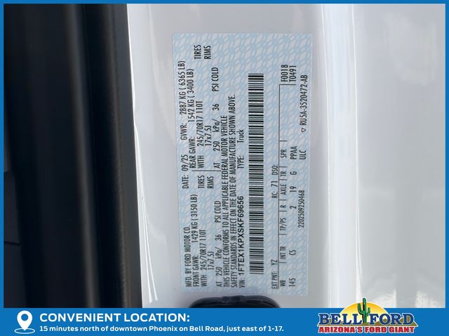 Equipment Group 101A Standard, GVWR: 6,365 lbs Payload Package, 3.55 Axle Ratio, 4-Wheel Disc Brakes, 6 Speakers, ABS brakes, Air Conditioning, AM/FM radio: SiriusXM with 360L, Auto High-beam Headlights, Brake assist, Cloth 40/20/40 Front Seat, Compass, Delay-off headlights, Driver door bin, Dual front impact airbags, Dual front side impact airbags, Electronic Stability Control, Emergency communication system: SYNC 4 911 Assist, Front anti-roll bar, Front Center Armrest, Front reading lights, Front wheel independent suspension, Fully automatic headlights, Heated door mirrors, Illuminated entry, Low tire pressure warning, Occupant sensing airbag, Outside temperature display, Overhead airbag, Overhead console, Panic alarm, Passenger door bin, Passenger vanity mirror, Power door mirrors, Power steering, Power windows, Radio data system, Radio: AM/FM Stereo w/SiriusXM 360L, Rear Parking Sensors, Rear step bumper, Remote keyless entry, Security system, Speed control, Split folding rear seat, Steering wheel mounted audio controls, SYNC 4 w/Enhanced Voice Recognition, Tachometer, Telescoping steering wheel, Tilt steering wheel, Traction control, Trip computer, Variably intermittent wipers, Voltmeter, and Wheels: 17" Silver Steel. Price includes: $1250 - Retail Bonus Cash. Exp. 01/05/2026