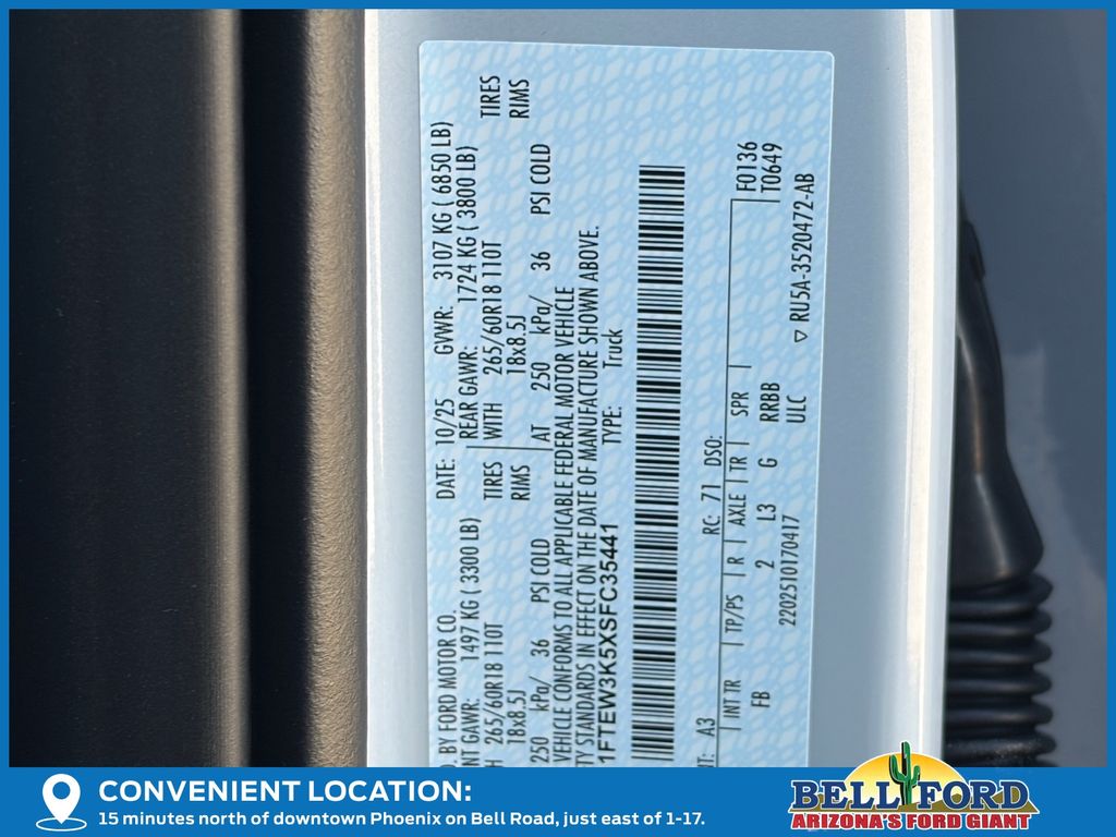 Equipment Group 302A Mid (360 Degree Camera, 400W Cab & Bed Outlets, 6" Angular Bright Anodized Step Bar, Adaptive Cruise Control w/Stop & Go, Auto-Dimming Rear-View Mirror, Black Painted Grille w/Chrome Center Bar, Chrome Door & Tailgate Handles, Chrome Single-Tip Exhaust, Cloth 40/Console/40 Front Seats, Connected Navigation, Driver State Detection, Dual-Zone Electronic Automatic Temperature Control, Evasive Steering Assist, Ford Co-Pilot360 Assist 2.0, Front Parking Sensors, Heated Front Seats, Intelligent Access w/Push Button Start, Power Glass Heated Sideview Mirrors, Power-Sliding Rear Window, Remote Start System w/Remote Tailgate Release, Towing Technology, and Wrapped Steering Wheel), GVWR: 6,426 lbs Payload Package, Mobile Office Package (Console Worksurface and Partitioned Lockable Rear Storage), XLT Black Appearance Package (6" Black Running Boards, Black Exterior Badging, Black Grille, Body-Color Front & Rear Bumpers, Dark Interior Appliques, Floor Shifter, Unique Sport Cloth 40/Console/40 Front-Seats, and Wheels: 18" Gloss Black), 4-Wheel Disc Brakes, 6 Speakers, ABS brakes, Air Conditioning, Alloy wheels, AM/FM radio: SiriusXM with 360L, Auto High-beam Headlights, Brake assist, Bumpers: chrome, Cloth 40/20/40 Front Seat, Compass, Delay-off headlights, Driver door bin, Driver vanity mirror, Dual front impact airbags, Dual front side impact airbags, Electronic Stability Control, Emergency communication system: SYNC 4 911 Assist, First Aid Kit w/Ford Logo, Front anti-roll bar, Front Center Armrest, Front fog lights, Front reading lights, Front wheel independent suspension, Fully automatic headlights, Heated door mirrors, Illuminated entry, Low tire pressure warning, Occupant sensing airbag, Outside temperature display, Overhead airbag, Overhead console, Panic alarm, Passenger door bin, Passenger vanity mirror, Power door mirrors, Power steering, Power windows, Radio data system, Radio: AM/FM Stereo w/SiriusXM 360L, Rear Parking Sensors, Rear reading lights, Rear step bumper, Rear window defroster, Remote keyless entry, Security system, Speed control, Split folding rear seat, Steering wheel mounted audio controls, SYNC 4 w/Enhanced Voice Recognition, Tachometer, Telescoping steering wheel, Tilt steering wheel, Traction control, Trip computer, Variably intermittent wipers, Voltmeter, and Wheels: 17" Silver Painted Aluminum. Price includes: $1500 - Retail Bonus Cash. Exp. 01/05/2026