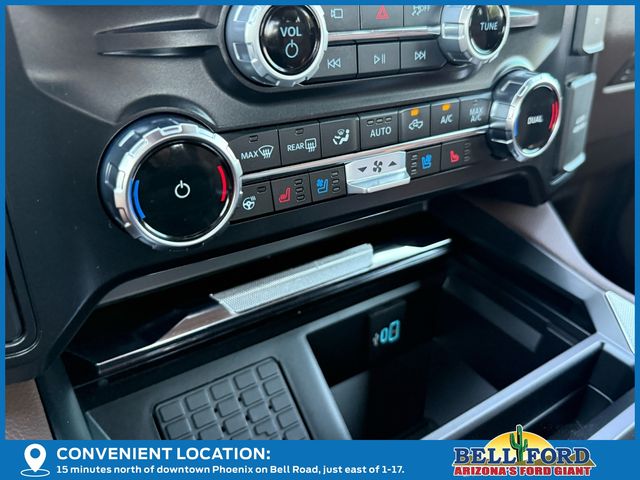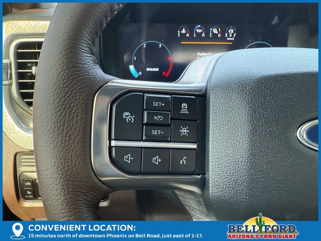 5th Wheel/Gooseneck Hitch Prep Package, Chrome Package (Chrome Door Handles, Chrome Exhaust Tip, Chrome Front & Rear Bumpers, Unique Chrome Mirror Caps, and Wheels: 20" Chrome PVD Aluminum), FX4 Off-Road Package (Hill Descent Control, Off-Road Specifically Tuned Shock Absorbers, and Unique FX4 Off-Road Box Decal), Order Code 710A, 4WD, 14 Speakers, 4-Wheel Disc Brakes, ABS brakes, Adjustable pedals, Air Conditioning, Alloy wheels, AM/FM radio: SiriusXM with 360L, Auto High-beam Headlights, Auto tilt-away steering wheel, Auto-dimming Rear-View mirror, Automatic temperature control, Brake assist, Compass, Delay-off headlights, Driver door bin, Driver vanity mirror, Dual front impact airbags, Dual front side impact airbags, Electronic Stability Control, Emergency communication system: SYNC 4 911 Assist, Engine Block Heater, Flow-Through Console, Front & Rear Wheel Well Liners (Pre-Installed), Front anti-roll bar, Front Bucket Seats, Front Center Armrest, Front dual zone A/C, Front fog lights, Front reading lights, Fully automatic headlights, Garage door transmitter, Heads-Up Display, Heated door mirrors, Heated front seats, Heated rear seats, Heated steering wheel, Illuminated entry, Leather steering wheel, Low tire pressure warning, Max Recline Seats, Memory seat, Navigation System, Outside temperature display, Overhead airbag, Overhead console, Panic alarm, Passenger door bin, Passenger vanity mirror, Pedal memory, Power door mirrors, Power driver seat, Power passenger seat, Power steering, Power windows, Radio: B&O Unleashed Sound System by Bang & Olufsen, Rain sensing wipers, Rear reading lights, Rear seat center armrest, Rear step bumper, Rear window defroster, Remote keyless entry, Retractable Bed Side-Step (Pre-Installed), Security system, SiriusXM Radio w/360L, Speed control, Split folding rear seat, Steering wheel memory, Steering wheel mounted A/C controls, Steering wheel mounted audio controls, SYNC 4 w/Enhanced Voice Recognition, Tachometer, Telescoping steering wheel, Tilt steering wheel, Traction control, Trip computer, Turn signal indicator mirrors, Unique King Ranch Leather 40/Console/40 Seats, Upfitter Switches (6), Variably intermittent wipers, Ventilated front seats, and Wheels: 20" Bright Machined Cast Aluminum.