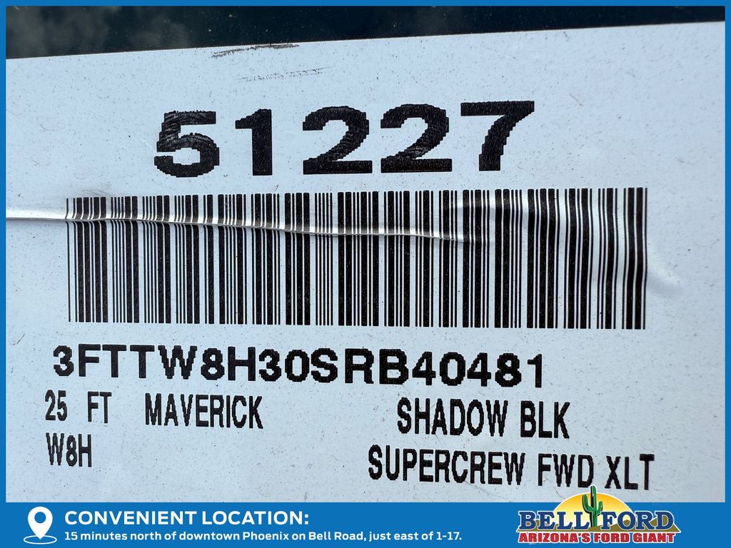 This Ford Maverick is equipped with the following options: Equipment Group 300A, XLT Luxury Package (400W Inverter w/USB Console Rear, Heated Mirror w/Painted Black Skull Caps, Heated Seats, LED Box Lighting, Remote Start System, and Soft Vinyl Wrapped Heated Steering Wheel), 2.5L I-4 Hybrid, 2.91 Axle Ratio, 4-Wheel Disc Brakes, 6 Speakers, ABS brakes, Air Conditioning, Alloy wheels, AM/FM radio: SiriusXM with 360L, Apple CarPlay/Android Auto, Auto High Beams, Auto High-beam Headlights, Automatic temperature control, Brake assist, Bumpers: body-color, Compass, Delay-off headlights, Driver door bin, Driver vanity mirror, Dual front impact airbags, Dual front side impact airbags, Electronic Stability Control, Emergency communication system: SYNC 4 911 Assist, Exterior Parking Camera Rear, Front anti-roll bar, Front Bucket Seats, Front Center Armrest, Front reading lights, Front wheel independent suspension, Fully automatic headlights, Illuminated entry, Internet access capable: FordPass Connect 5G, Knee airbag, Low tire pressure warning, Occupant sensing airbag, Outside temperature display, Overhead airbag, Overhead console, Panic alarm, Passenger door bin, Passenger vanity mirror, Power door mirrors, Power Moonroof, Power steering, Power windows, Pre-Collision Assist w/Automatic Emergency Braking, Radio data system, Radio: AM/FM Stereo w/6 Speakers, Rear anti-roll bar, Rear seat center armrest, Rear step bumper, Rear-View Camera, Remote keyless entry, Security system, SiriusXM w/360L, Speed control, Speed-sensing steering, Steering wheel mounted audio controls, SYNC 4 w/Enhanced Voice Recognition, Telescoping steering wheel, Tilt steering wheel, Traction control, Trip computer, Unique Cloth Front Bucket Seats, and Wheels: 17" Carbonized Gray Painted Aluminum. Price includes: $1000 - Retail Customer Cash. Exp. 03/31/2026