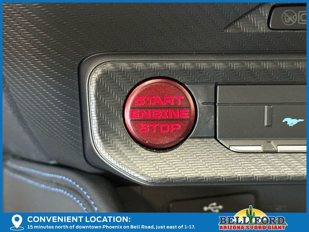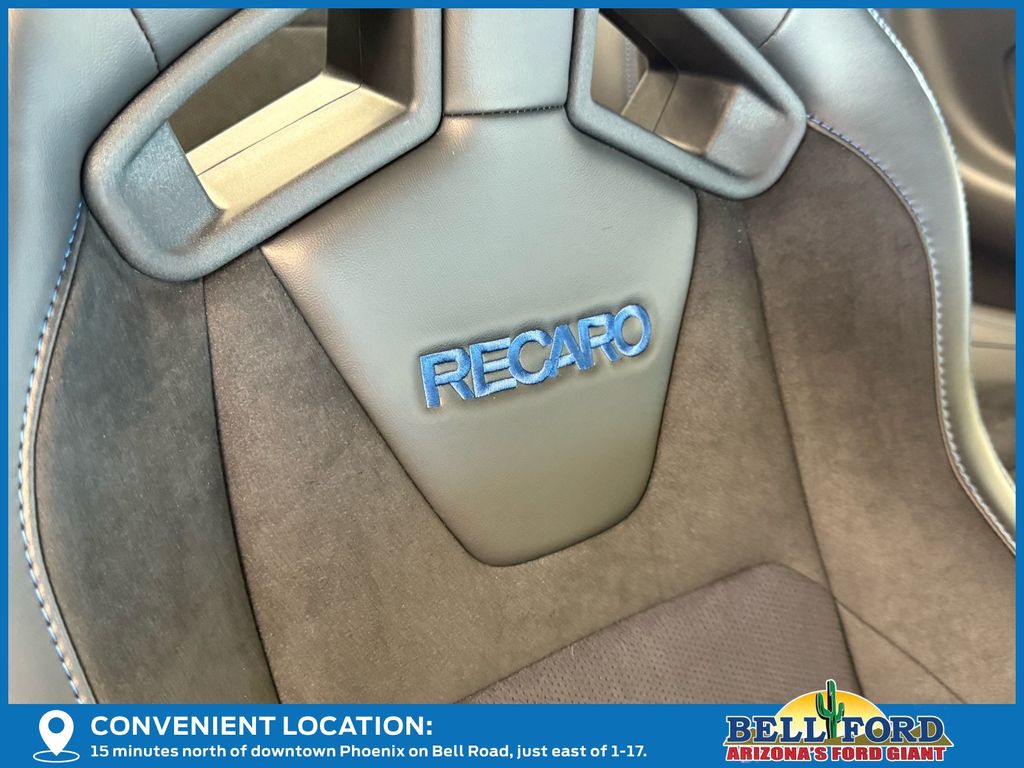 This Ford Mustang is equipped with the following options: Equipment Group 700A Deluxe Package (Aluminum Foot Pedals, Approach Detection, Cloth/Vinyl Climate-Controlled Bucket Seats, and Universal Garage Door Opener (UGDO)), RECARO Sport Seats (RECARO Micro-Suede/Vinyl Bucket Seats), Security Package (Active Anti-Theft System), 12 Speakers, 4-Wheel Disc Brakes, ABS brakes, Adaptive suspension, Air Conditioning, Alloy wheels, AM/FM radio: SiriusXM with 360L, AM/FM Stereo, Auto High-beam Headlights, Auto-dimming Rear-View mirror, Automatic temperature control, B&O Sound System by Bang & Olufsen, Brake assist, Bumpers: body-color, Cloth/Vinyl Heated Bucket Seats, Compass, Delay-off headlights, Driver door bin, Driver vanity mirror, Dual front impact airbags, Dual front side impact airbags, Electronic Stability Control, Emergency communication system: 911 Assist, Exterior Parking Camera Rear, Four wheel independent suspension, Front anti-roll bar, Front Bucket Seats, Front Center Armrest, Front dual zone A/C, Front reading lights, Fully automatic headlights, HD Radio, Heated front seats, Heated steering wheel, Illuminated entry, Knee airbag, Low tire pressure warning, Matte Clear Film, Navigation system: Connected Navigation, Occupant sensing airbag, Outside temperature display, Overhead airbag, Overhead console, Panic alarm, Passenger door bin, Passenger vanity mirror, Power door mirrors, Power driver seat, Power passenger seat, Power steering, Power windows, Radio data system, Rain sensing wipers, Rear anti-roll bar, Rear Parking Sensors, Rear window defroster, Remote keyless entry, Remote Start System, SiriusXM w/360L, Speed control, Speed-sensing steering, Speed-Sensitive Wipers, Split folding rear seat, Spoiler, Sport steering wheel, Steering wheel mounted audio controls, Storage Cooler Bag (DIO), SYNC 4, Tachometer, Telescoping steering wheel, Tilt steering wheel, Traction control, Trip computer, Variably intermittent wipers, Voltmeter, and Wheels: 19" x 9.5" Fr & 19" x 10" Rr Aluminum.