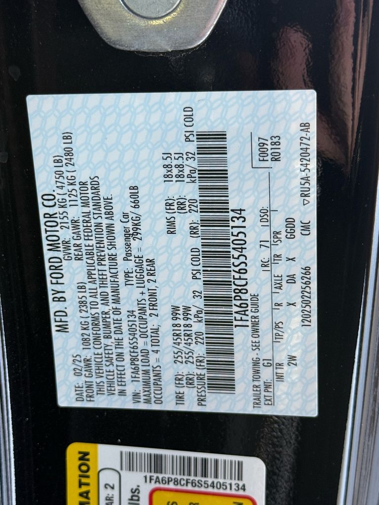 Equipment Group 301A High Package (9-Speaker Stereo System, Ambient Lighting w/MyColor, Cloth/Vinyl Heated Bucket Seats, and SiriusXM w/360L & HD Radio), 3.55 Limited Slip Rear Axle, 4-Wheel Disc Brakes, 6 Speakers, ABS brakes, Active Valve Performance Exhaust, Air Conditioning, Alloy wheels, AM/FM radio, AM/FM Stereo, Auto High-beam Headlights, Automatic temperature control, Brake assist, Bumpers: body-color, Cloth Bucket Seats, Compass, Delay-off headlights, Driver door bin, Driver vanity mirror, Dual front impact airbags, Dual front side impact airbags, Electronic Stability Control, Emergency communication system: 911 Assist, Exterior Parking Camera Rear, Four wheel independent suspension, Front anti-roll bar, Front Bucket Seats, Front Center Armrest, Front dual zone A/C, Front reading lights, Fully automatic headlights, Illuminated entry, Knee airbag, Leather Shift Knob, Leather steering wheel, Low tire pressure warning, Occupant sensing airbag, Outside temperature display, Overhead airbag, Overhead console, Panic alarm, Passenger door bin, Passenger vanity mirror, Power door mirrors, Power steering, Power windows, Radio data system, Rain sensing wipers, Rear anti-roll bar, Rear Parking Sensors, Rear window defroster, Remote keyless entry, Speed control, Speed-sensing steering, Speed-Sensitive Wipers, Split folding rear seat, Spoiler, Sport steering wheel, Steering wheel mounted audio controls, SYNC 4, Tachometer, Telescoping steering wheel, Tilt steering wheel, Traction control, Trip computer, Variably intermittent wipers, Voltmeter, and Wheels: 18" x 8.5" Ebony Black Painted Aluminum. Price includes: $3500 - Retail Customer Cash. Exp. 01/05/2026 Price includes dealer added accessories totaling $16,988.