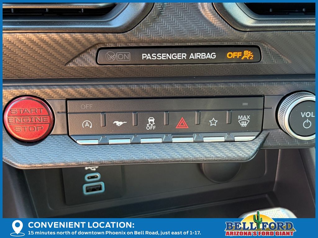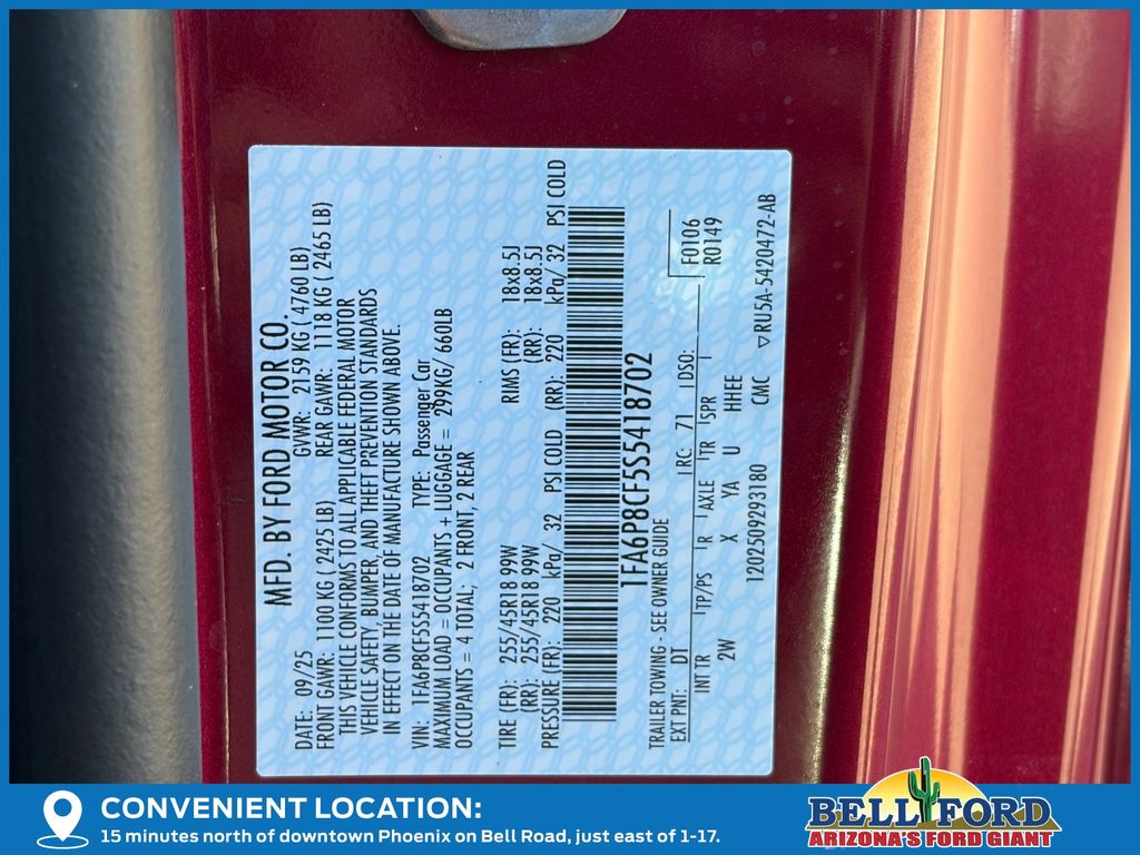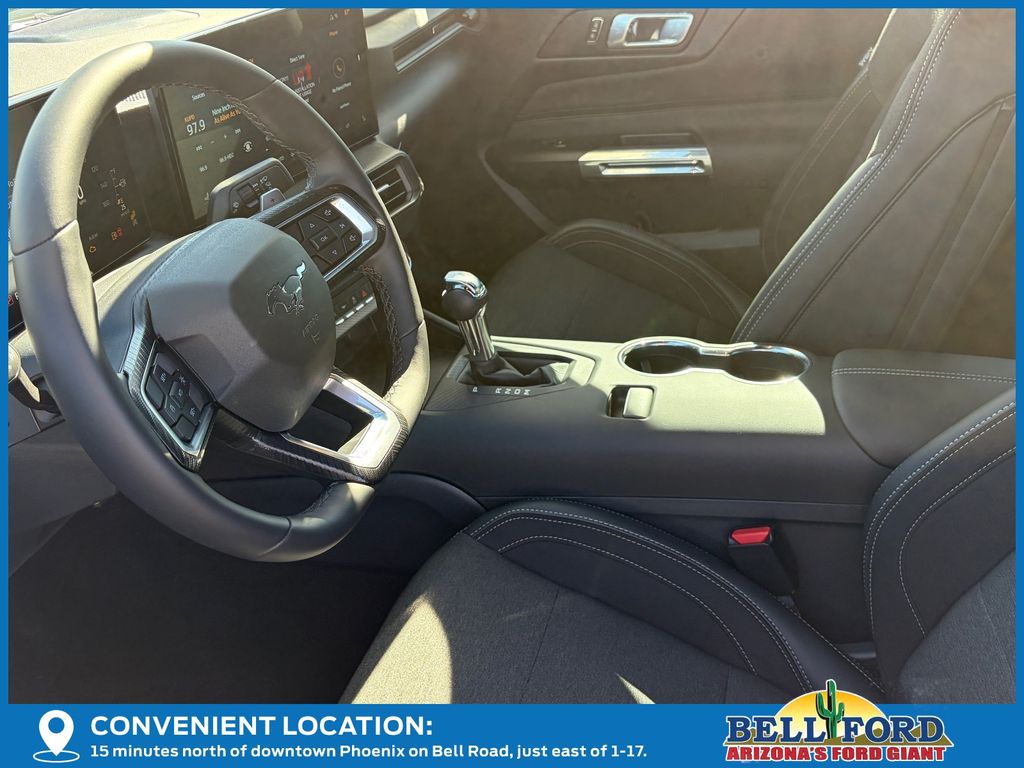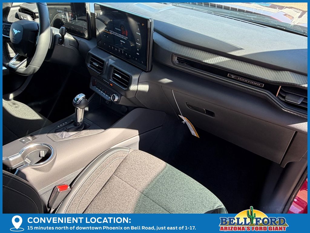 This Ford Mustang is equipped with the following options: Equipment Group 301A High Package (9-Speaker Stereo System, Ambient Lighting w/MyColor, Cloth/Vinyl Heated Bucket Seats, and SiriusXM w/360L & HD Radio), 4-Wheel Disc Brakes, 6 Speakers, ABS brakes, Active Valve Performance Exhaust, Air Conditioning, Alloy wheels, AM/FM radio, AM/FM Stereo, Auto High-beam Headlights, Automatic temperature control, Brake assist, Bumpers: body-color, Cloth Bucket Seats, Compass, Delay-off headlights, Driver door bin, Driver vanity mirror, Dual front impact airbags, Dual front side impact airbags, Electronic Stability Control, Emergency communication system: 911 Assist, Exterior Parking Camera Rear, Four wheel independent suspension, Front anti-roll bar, Front Bucket Seats, Front Center Armrest, Front dual zone A/C, Front reading lights, Fully automatic headlights, Illuminated entry, Internet access capable: FordPass Connect, Knee airbag, Leather Shift Knob, Leather steering wheel, Low tire pressure warning, Occupant sensing airbag, Outside temperature display, Overhead airbag, Overhead console, Panic alarm, Passenger door bin, Passenger vanity mirror, Power door mirrors, Power steering, Power windows, Radio data system, Rain sensing wipers, Rear anti-roll bar, Rear Parking Sensors, Rear window defroster, Remote keyless entry, Speed control, Speed-sensing steering, Speed-Sensitive Wipers, Split folding rear seat, Spoiler, Sport steering wheel, Steering wheel mounted audio controls, SYNC 4, Tachometer, Telescoping steering wheel, Tilt steering wheel, Traction control, Trip computer, Variably intermittent wipers, Voltmeter, and Wheels: 18" x 8.5" Ebony Black Painted Aluminum. Price includes: $1000 - SUV Spike Retail Bonus Cash. Exp. 03/02/2026 $3500 - Retail Customer Cash. Exp. 03/31/2026