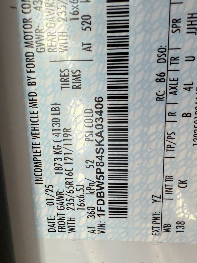 Exterior Upgrade Package (Black HID Lamps, Front Fog Lamps, Honeycomb Mesh Grille w/Chrome Surround, Wheels: 16" Steel w/Full Silver Wheel Covers, and Wiper Activated Headlamps), Interior Upgrade Package (Dark Palazzo Gray Cloth Bucket Seats and Illuminated Vinyl-Trimmed Sun Visors), Order Code 501A, 110V/400W Power Outlet, 4 Speakers, 4-Wheel Disc Brakes, 4.10 Limited Slip Axle Ratio, ABS brakes, Air Conditioning, AM/FM radio, AM/FM Stereo, Auto High-beam Headlights, Brake assist, Dark Palazzo Gray Vinyl Bucket Seats, Delay-off headlights, Driver door bin, Driver's Seat Mounted Armrest, Dual AGM Batteries (70 Amp-hr Each), Dual front impact airbags, Dual front side impact airbags, Electronic Air Temperature Control, Electronic Stability Control, Front anti-roll bar, Front Bucket Seats, Front Overhead Shelf, Front reading lights, Front wheel independent suspension, Fully automatic headlights, Illuminated entry, Large Center Console, Long-Arm Manual-Folding Heated Power Adjust Mirrors, Low tire pressure warning, Modified Vehicle Wiring System, Occupant sensing airbag, Overhead airbag, Panic alarm, Passenger cancellable airbag, Passenger door bin, Power steering, Power windows, Radio: AM/FM Stereo w/SYNC 4, Rain sensing wipers, Rear Video Camera & Prep Kit, Remote keyless entry, Speed control, Steering wheel mounted audio controls, Tachometer, Telescoping steering wheel, Tilt steering wheel, Tow/Haul Mode w/Trailer Wiring Provisions, Trailer Brake Controller, Variably intermittent wipers, Vinyl Front Bucket Seats, and Wheels: 16" Silver Steel w/Black Hubcaps. Price includes: $4000 - Retail Customer Cash. Exp. 01/05/2026