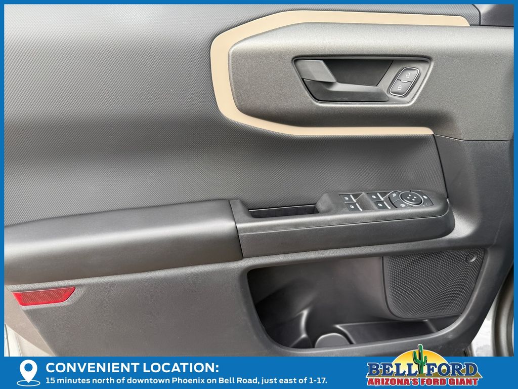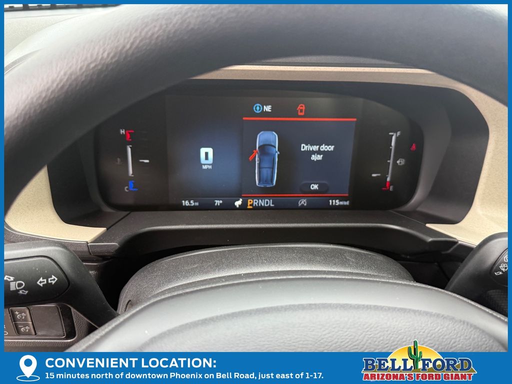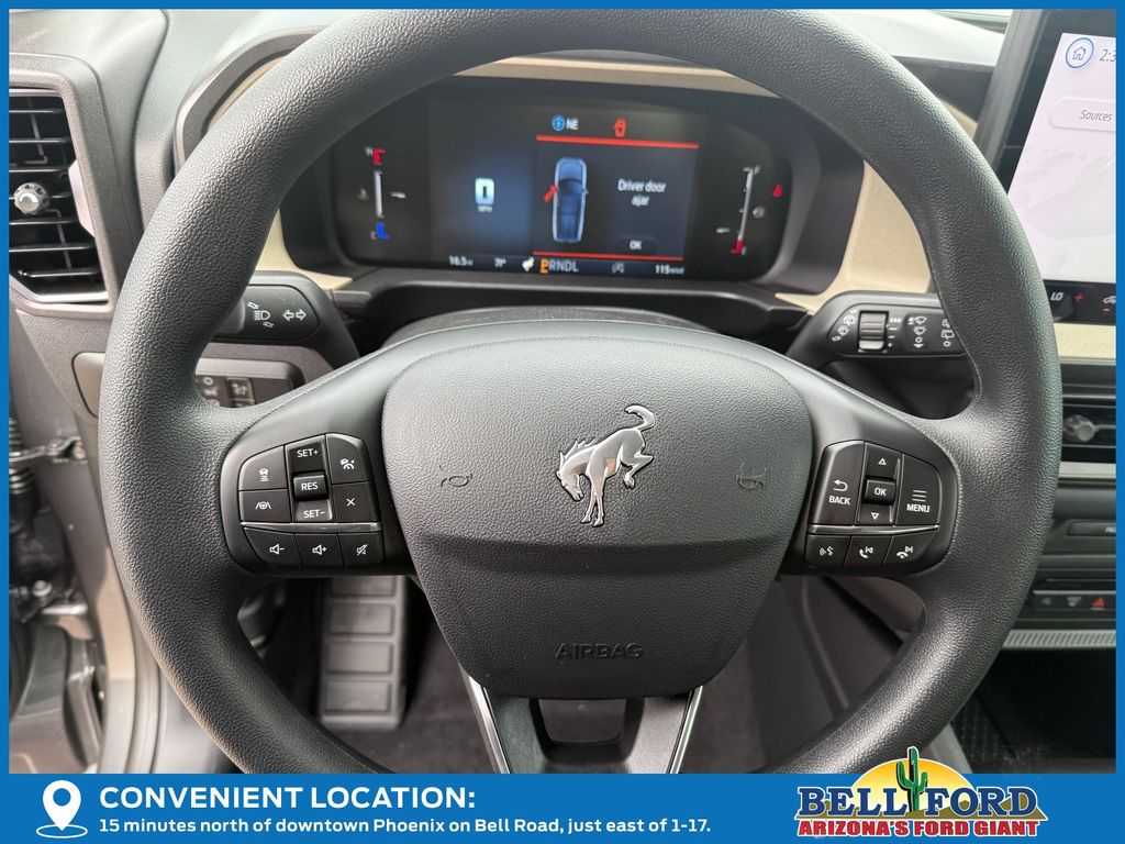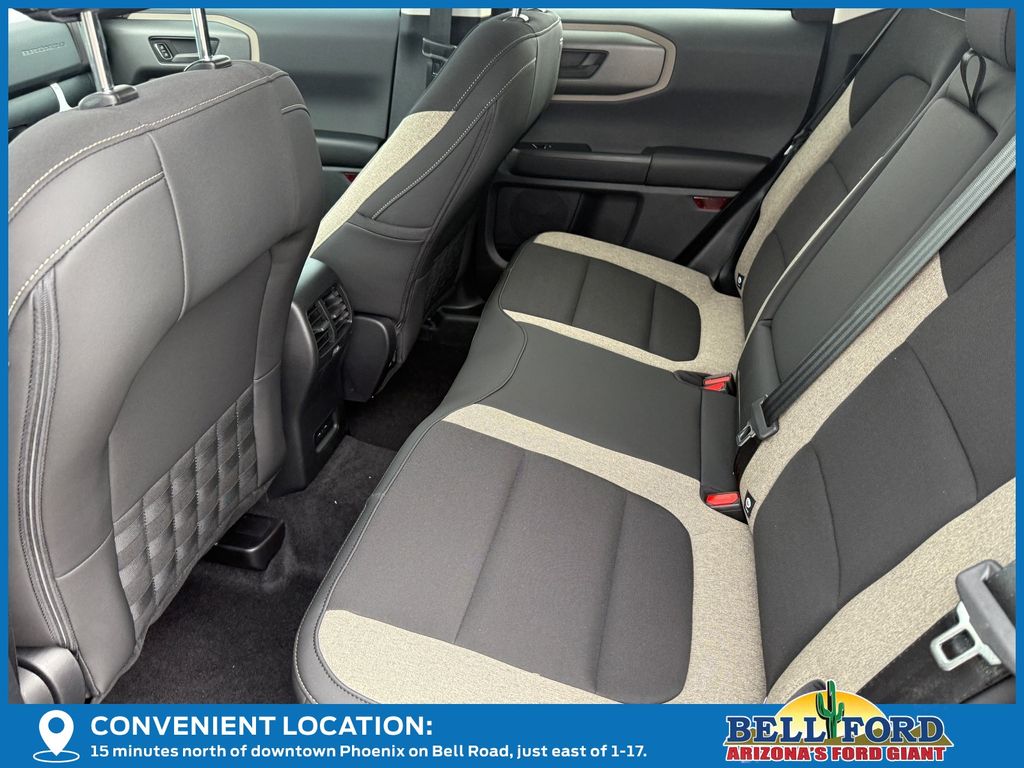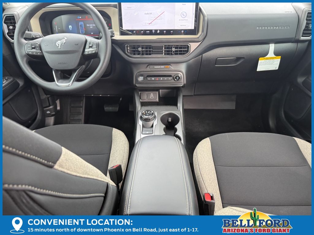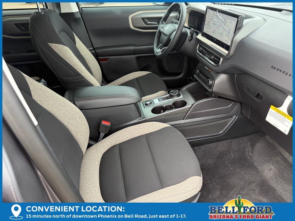 This Ford Bronco Sport is equipped with the following options: Equipment Group 200A Standard Package (AM/FM Stereo, Cloth with Easy-to-Clean Front Bucket Seats, SiriusXM with 360L, SYNC 4 with Enhanced Voice Recognition, and Wheels: 17" Carbonized Gray Painted Aluminum), Ford Connectivity Package (1-Year Included), Internet access capable: 5G Modem - Ford Connectivity Package, 4-Wheel Disc Brakes, 6 Speakers, ABS brakes, Air Conditioning, Alloy wheels, AM/FM radio: SiriusXM with 360L, Apple CarPlay/Android Auto, Auto High-beam Headlights, Automatic temperature control, Brake assist, Compass, Delay-off headlights, Driver door bin, Driver vanity mirror, Dual front impact airbags, Dual front side impact airbags, Electronic Stability Control, Emergency communication system: SYNC 4 911 Assist, Exterior Parking Camera Rear, Four wheel independent suspension, Front anti-roll bar, Front Bucket Seats, Front Center Armrest, Front reading lights, Fully automatic headlights, Heated door mirrors, Illuminated entry, Knee airbag, Low tire pressure warning, Occupant sensing airbag, Outside temperature display, Overhead airbag, Overhead console, Panic alarm, Passenger door bin, Passenger vanity mirror, Power door mirrors, Power steering, Power windows, Radio data system, Rear anti-roll bar, Rear Parking Sensors, Rear reading lights, Rear seat center armrest, Rear window defroster, Rear window wiper, Remote keyless entry, Security system, Speed control, Speed-sensing steering, Speed-Sensitive Wipers, Split folding rear seat, Steering wheel mounted audio controls, Tachometer, Telescoping steering wheel, Tilt steering wheel, Traction control, Trip computer, and Variably intermittent wipers.