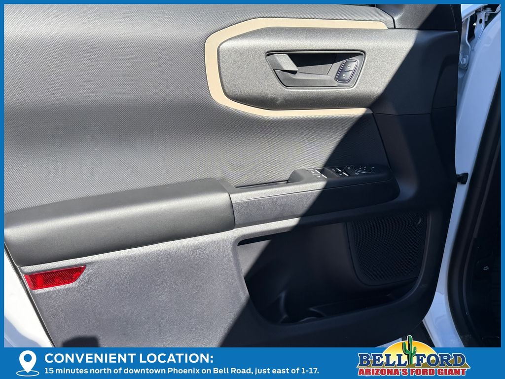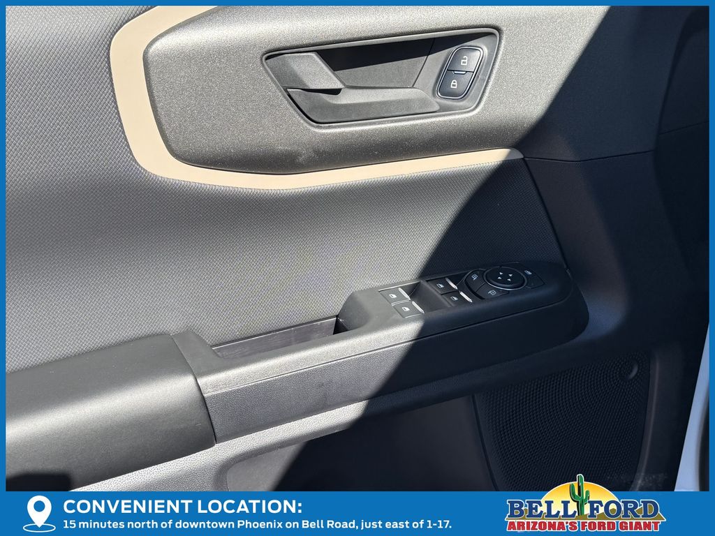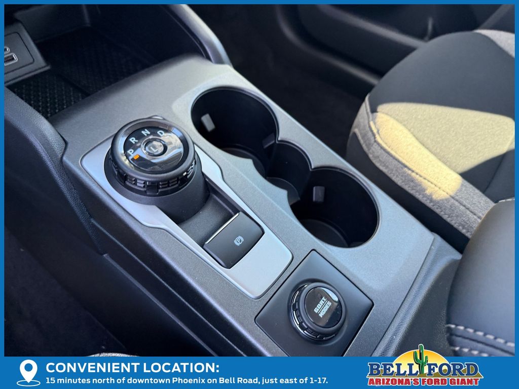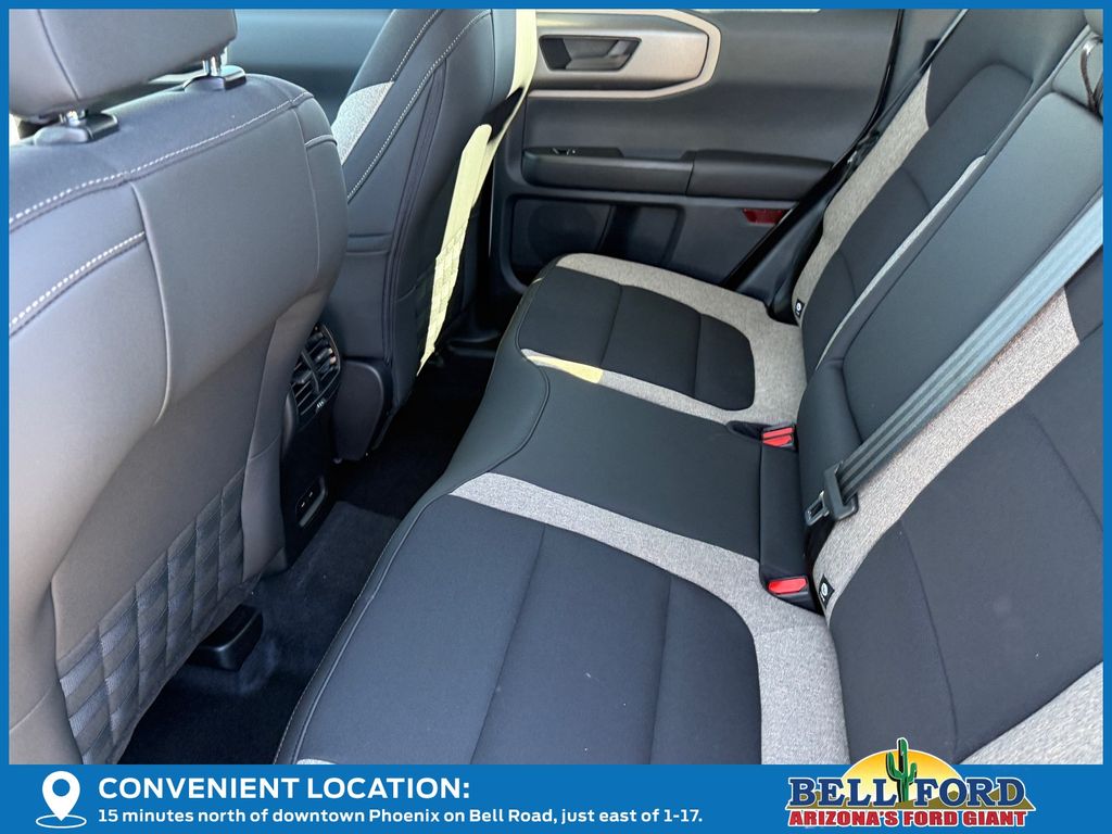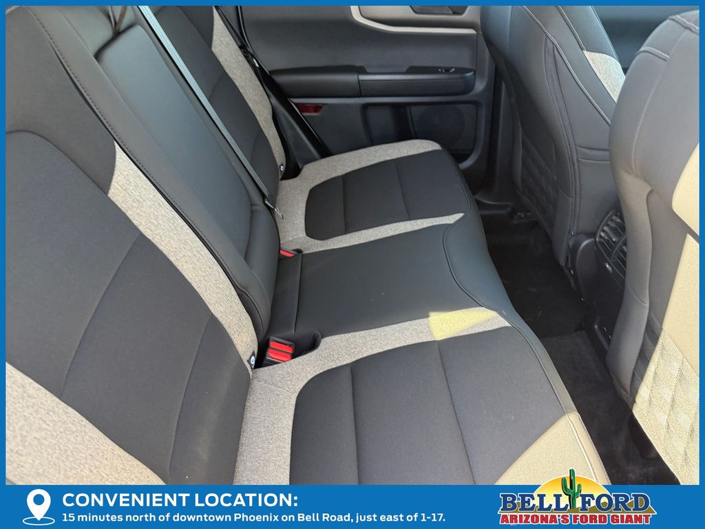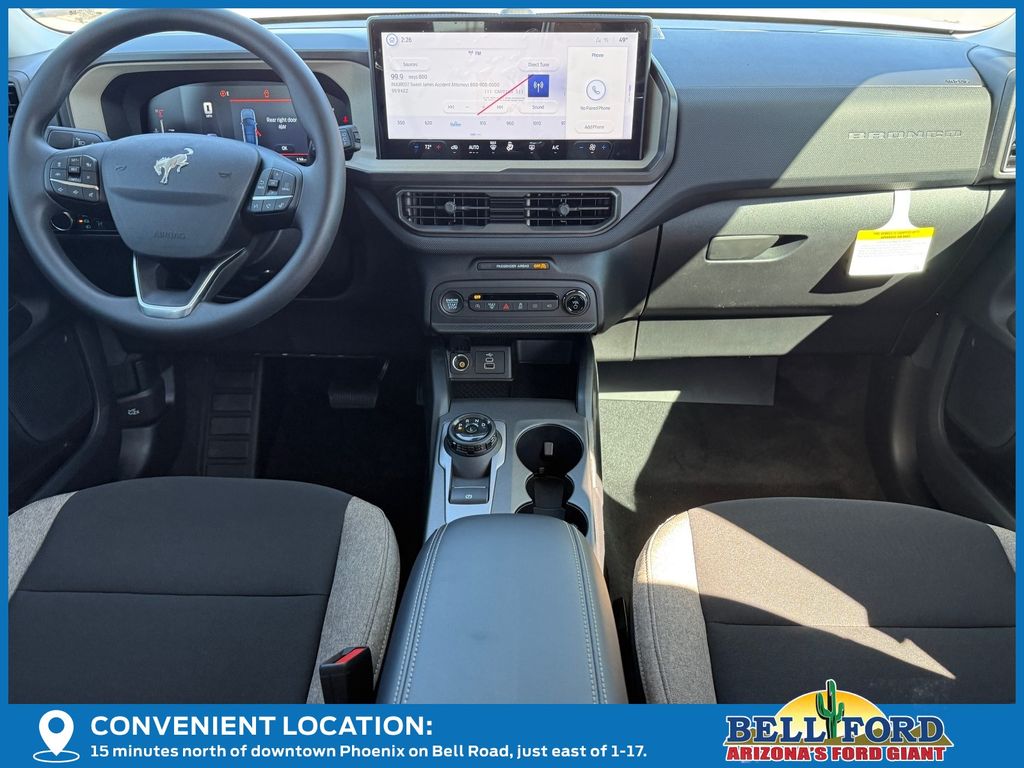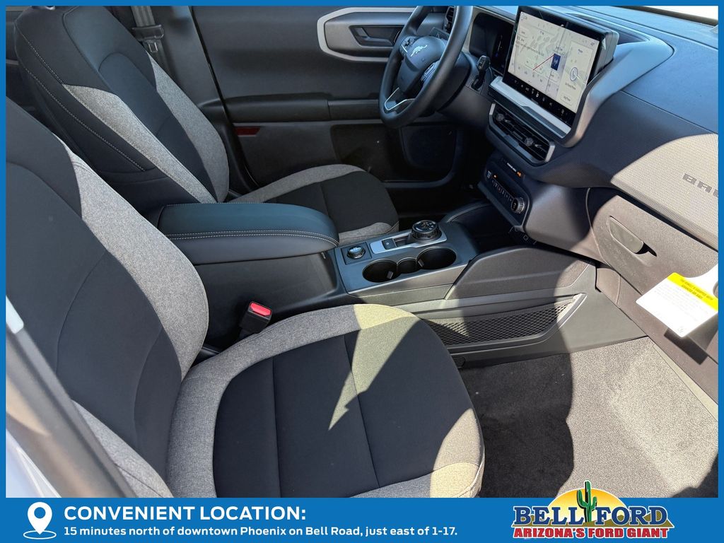 This Ford Bronco Sport is equipped with the following options: Equipment Group 200A Standard Package (AM/FM Stereo, Cloth with Easy-to-Clean Front Bucket Seats, SiriusXM with 360L, SYNC 4 with Enhanced Voice Recognition, and Wheels: 17" Carbonized Gray Painted Aluminum), Ford Connectivity Package (1-Year Included), Internet access capable: 5G Modem - Ford Connectivity Package, 4-Wheel Disc Brakes, 6 Speakers, ABS brakes, Air Conditioning, Alloy wheels, AM/FM radio: SiriusXM with 360L, Apple CarPlay/Android Auto, Auto High-beam Headlights, Automatic temperature control, Brake assist, Compass, Delay-off headlights, Driver door bin, Driver vanity mirror, Dual front impact airbags, Dual front side impact airbags, Electronic Stability Control, Emergency communication system: SYNC 4 911 Assist, Exterior Parking Camera Rear, Four wheel independent suspension, Front anti-roll bar, Front Bucket Seats, Front Center Armrest, Front reading lights, Fully automatic headlights, Heated door mirrors, Illuminated entry, Knee airbag, Low tire pressure warning, Occupant sensing airbag, Outside temperature display, Overhead airbag, Overhead console, Panic alarm, Passenger door bin, Passenger vanity mirror, Power door mirrors, Power steering, Power windows, Radio data system, Rear anti-roll bar, Rear Parking Sensors, Rear reading lights, Rear seat center armrest, Rear window defroster, Rear window wiper, Remote keyless entry, Security system, Speed control, Speed-sensing steering, Speed-Sensitive Wipers, Split folding rear seat, Steering wheel mounted audio controls, Tachometer, Telescoping steering wheel, Tilt steering wheel, Traction control, Trip computer, Variably intermittent wipers, and Wheels: 17" Carbonized Gray-Painted Aluminum.