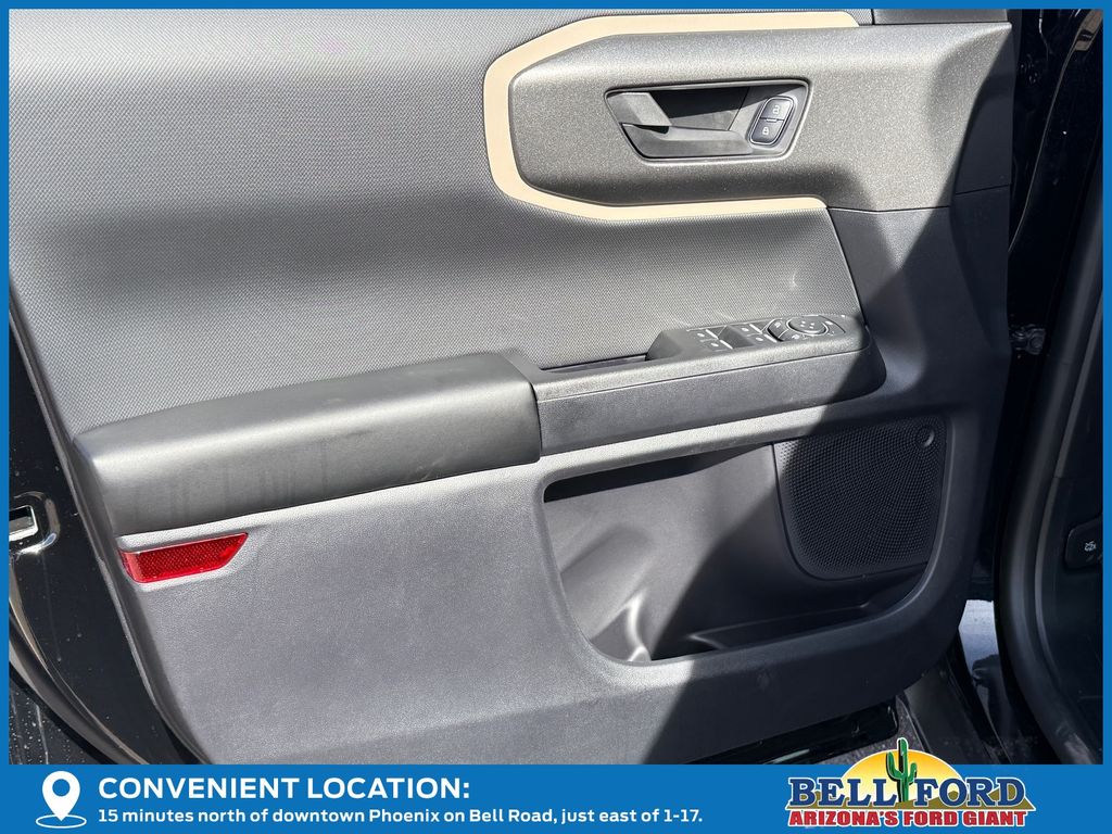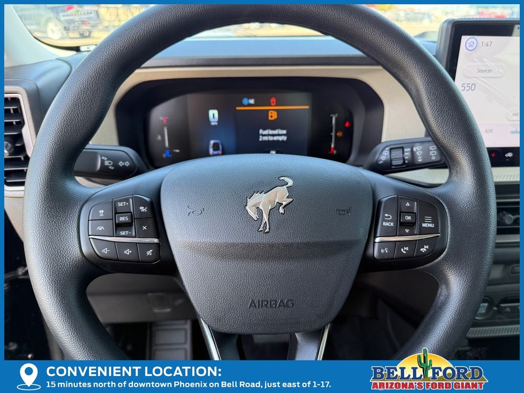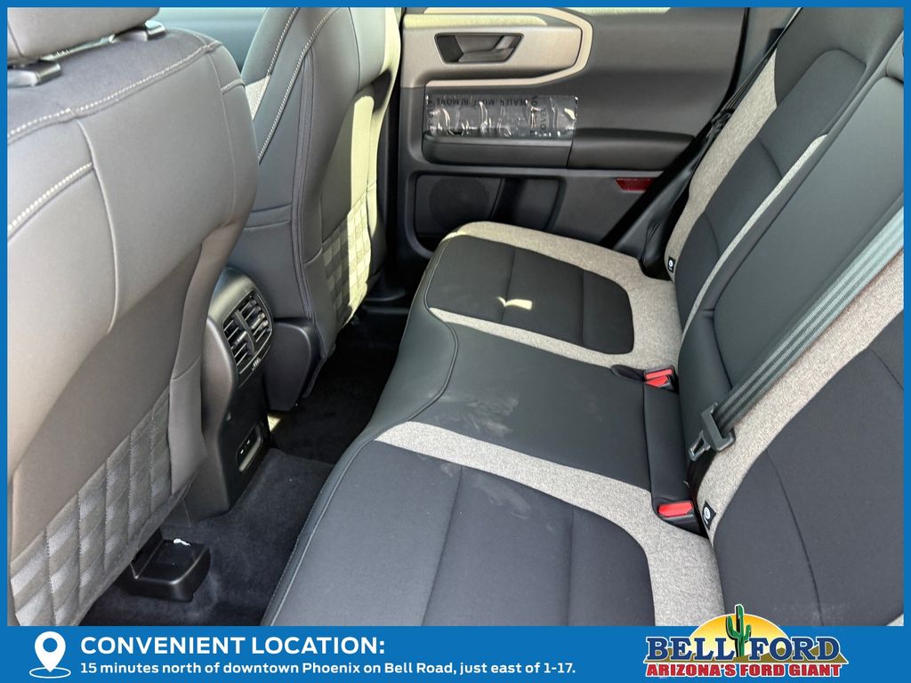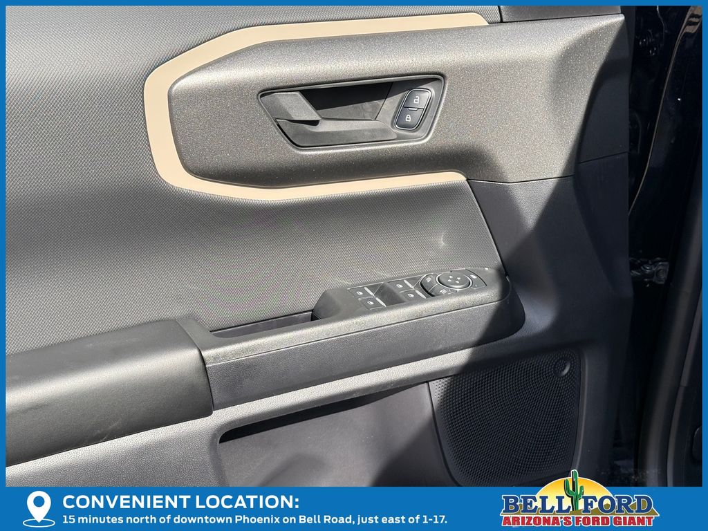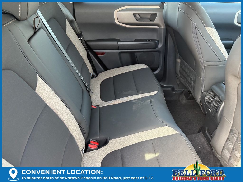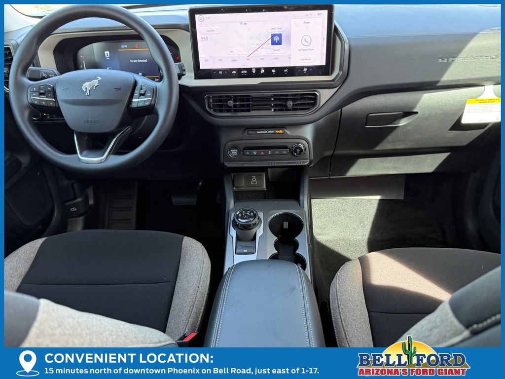 This Ford Bronco Sport is equipped with the following options: Equipment Group 200A Standard Package (AM/FM Stereo, Cloth with Easy-to-Clean Front Bucket Seats, SiriusXM with 360L, SYNC 4 with Enhanced Voice Recognition, and Wheels: 17" Carbonized Gray Painted Aluminum), Ford Connectivity Package (1-Year Included), Internet access capable: 5G Modem - Ford Connectivity Package, 4-Wheel Disc Brakes, 6 Speakers, ABS brakes, Air Conditioning, Alloy wheels, AM/FM radio: SiriusXM with 360L, Apple CarPlay/Android Auto, Auto High-beam Headlights, Automatic temperature control, Brake assist, Compass, Delay-off headlights, Driver door bin, Driver vanity mirror, Dual front impact airbags, Dual front side impact airbags, Electronic Stability Control, Emergency communication system: SYNC 4 911 Assist, Exterior Parking Camera Rear, Four wheel independent suspension, Front anti-roll bar, Front Bucket Seats, Front Center Armrest, Front reading lights, Fully automatic headlights, Heated door mirrors, Illuminated entry, Knee airbag, Low tire pressure warning, Occupant sensing airbag, Outside temperature display, Overhead airbag, Overhead console, Panic alarm, Passenger door bin, Passenger vanity mirror, Power door mirrors, Power steering, Power windows, Radio data system, Rear anti-roll bar, Rear Parking Sensors, Rear reading lights, Rear seat center armrest, Rear window defroster, Rear window wiper, Remote keyless entry, Security system, Speed control, Speed-sensing steering, Speed-Sensitive Wipers, Split folding rear seat, Steering wheel mounted audio controls, Tachometer, Telescoping steering wheel, Tilt steering wheel, Traction control, Trip computer, Variably intermittent wipers, and Wheels: 17" Carbonized Gray-Painted Aluminum.
