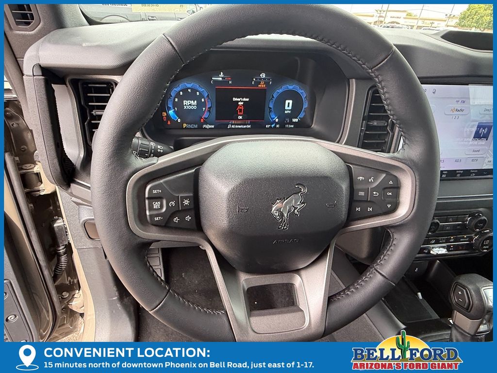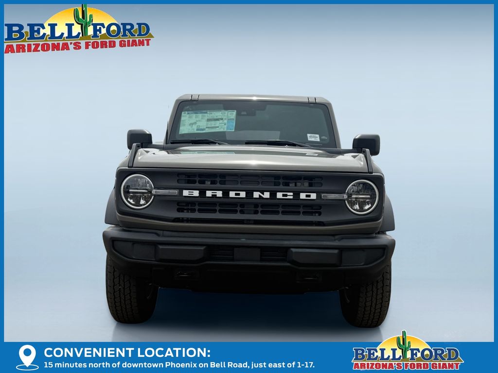 This Ford Bronco is equipped with the following options: Equipment Group 222A Mid Package (2-Door Intelligent Access with Lock/Unlock, AM/FM Stereo, Ambient Footwell Lighting, Cloth Bucket Seats, Connected Navigation, Driver and Front Passenger Illuminated Sliding Visor Vanity Mirrors, Dual Smart Charging USB Ports, Dual-Zone Electronic Automatic Temperature Control, Front Row Heated Seats, Pro Power Onboard - 400W, Rear Parking Sensors, SiriusXM with 360L, SYNC 4, and Wheels: 17" Carbonized Gray-Painted Aluminum), Ford Connectivity Package (1-Year Included), 4-Wheel Disc Brakes, 4.46 Axle Ratio, 7 Speakers, ABS brakes, Air Conditioning, Alloy wheels, AM/FM radio: SiriusXM with 360L, Auto High-Beam Headlamps, Auto High-beam Headlights, BLIS Blind Spot Information System, Brake assist, Carbonized Gray Molded-in-Color Hard Top, Compass, Delay-off headlights, Driver door bin, Driver vanity mirror, Dual front impact airbags, Dual front side impact airbags, Electronic Stability Control, Emergency communication system: 911 Assist, Exterior Parking Camera Rear, Front anti-roll bar, Front Bucket Seats, Front Center Armrest, Front reading lights, Front wheel independent suspension, Fully automatic headlights, Hard Top Sound Deadening Headliner, Heated door mirrors, Illuminated entry, Integrated roll-over protection, Lane-Keeping System, Low tire pressure warning, Occupant sensing airbag, Outside temperature display, Overhead airbag, Overhead console, Panic alarm, Passenger door bin, Passenger vanity mirror, Power door mirrors, Power steering, Power windows, Pre-Collision Assist with Automatic Emergency Braking, Radio data system, Rear-View Camera, Rear-Window Defroster and Washer, Remote keyless entry, Security system, Speed control, Split folding rear seat, Steering wheel mounted audio controls, Tachometer, Telescoping steering wheel, Tilt steering wheel, Traction control, Trip computer, and Variably intermittent wipers. Price includes: $750 - Retail Customer Cash. Exp. 04/30/2026