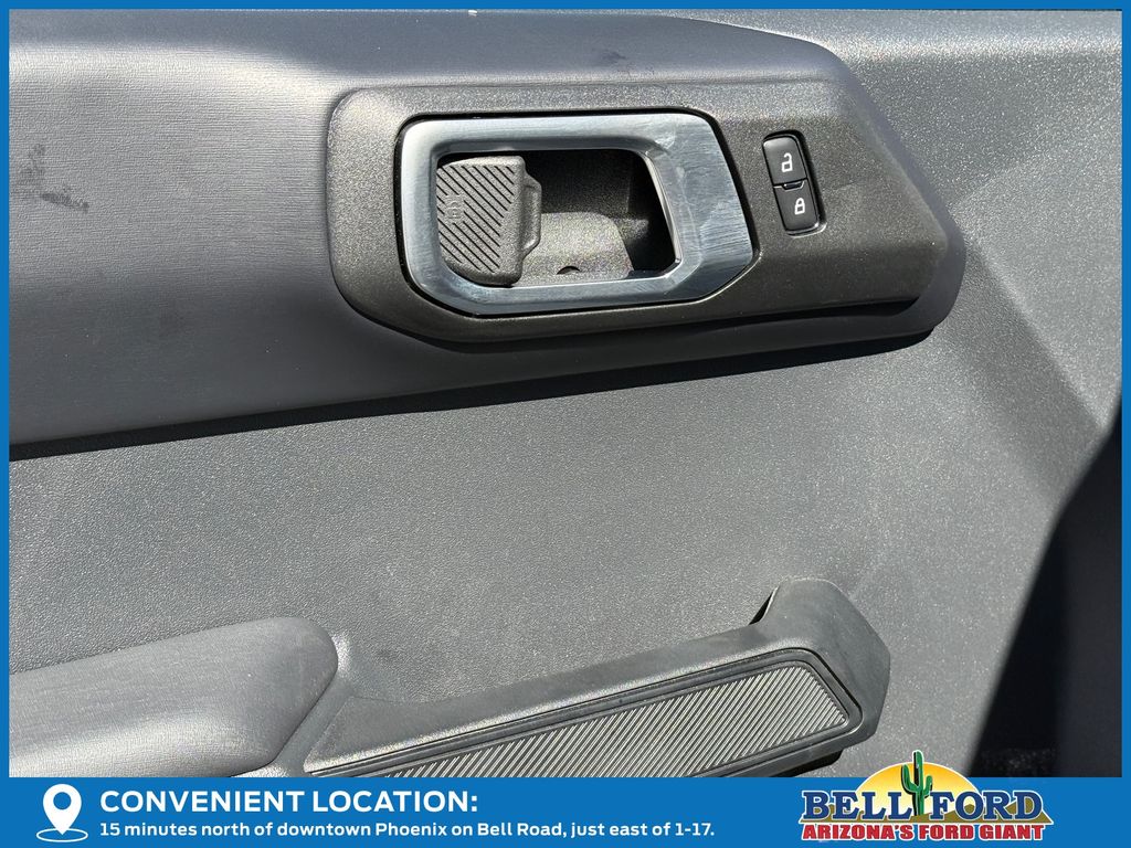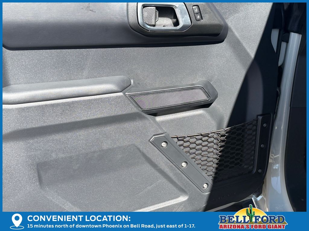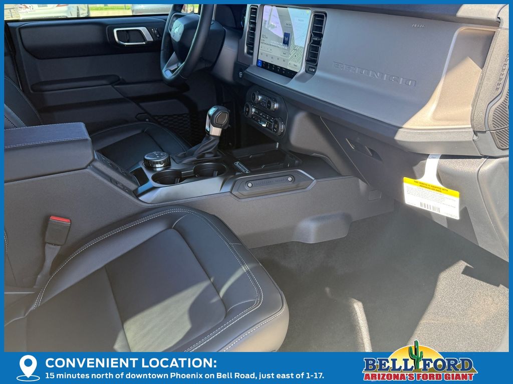 This Ford Bronco is equipped with the following options: Equipment Group 312A Mid Package (18" Bright Machined Aluminum Wheels, 3.73 Axle Ratio, AM/FM Stereo, Connected Navigation, Heated Leather-Trimmed/Vinyl Bucket Seats, SiriusXM with 360L, and SYNC 4), Ford Connectivity Package (1-Year Included), 4-Wheel Disc Brakes, 7 Speakers, ABS brakes, Air Conditioning, Alloy wheels, AM/FM radio: SiriusXM with 360L, Auto High-beam Headlights, Auto-dimming Rear-View mirror, Automatic temperature control, Brake assist, Compass, Delay-off headlights, Driver door bin, Driver vanity mirror, Dual front impact airbags, Dual front side impact airbags, Electronic Stability Control, Emergency communication system: 911 Assist, Exterior Parking Camera Rear, Front anti-roll bar, Front Bucket Seats, Front Center Armrest, Front dual zone A/C, Front fog lights, Front reading lights, Front wheel independent suspension, Fully automatic headlights, Hard Top Sound Deadening Headliner, Heated door mirrors, Heated front seats, Heated steering wheel, Illuminated entry, Integrated roll-over protection, Leather Shift Knob, Low tire pressure warning, Navigation system: Connected Navigation, Occupant sensing airbag, Outside temperature display, Overhead airbag, Overhead console, Panic alarm, Passenger door bin, Passenger vanity mirror, Power door mirrors, Power driver seat, Power passenger seat, Power steering, Power windows, Radio data system, Rear seat center armrest, Rear-Window Defroster and Washer, Remote keyless entry, Security system, Shadow Black-Painted Hard Top, Speed control, Split folding rear seat, Steering wheel mounted audio controls, Tachometer, Telescoping steering wheel, Tilt steering wheel, Traction control, Trip computer, Variably intermittent wipers, and Voltmeter. Price includes dealer added accessories totaling $9,260.