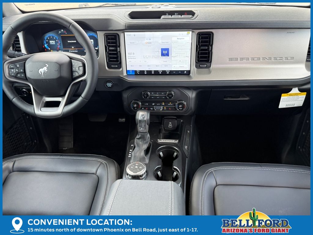 This Ford Bronco is equipped with the following options: Equipment Group 314A Lux Package (18" Bright Machined Aluminum Wheels, 3.73 Axle Ratio, 360-Degree Camera, Adaptive Cruise Control, Evasive Steering Assist, Front Parking Sensors, Heated Leather-Trimmed/Vinyl Bucket Seats, and Sideview Mirrors), Ford Connectivity Package (1-Year Included), Trailer Tow Package, 4-Wheel Disc Brakes, 7 Speakers, ABS brakes, Air Conditioning, Alloy wheels, AM/FM radio: SiriusXM with 360L, AM/FM Stereo, Auto High-beam Headlights, Auto-dimming Rear-View mirror, Automatic temperature control, Brake assist, Carbonized Gray Molded-in-Color Hard Top, Compass, Connected Navigation, Delay-off headlights, Driver door bin, Driver vanity mirror, Dual front impact airbags, Dual front side impact airbags, Electronic Stability Control, Emergency communication system: 911 Assist, Exterior Parking Camera Rear, First Aid Kit, Front anti-roll bar, Front Bucket Seats, Front Center Armrest, Front dual zone A/C, Front fog lights, Front reading lights, Front wheel independent suspension, Fully automatic headlights, Hard Top Sound Deadening Headliner, Heated door mirrors, Heated front seats, Heated steering wheel, Illuminated entry, Integrated roll-over protection, Leather Shift Knob, Low tire pressure warning, Navigation system: Connected Navigation, Occupant sensing airbag, Outside temperature display, Overhead airbag, Overhead console, Panic alarm, Passenger door bin, Passenger vanity mirror, Power door mirrors, Power driver seat, Power passenger seat, Power steering, Power windows, Radio data system, Rear seat center armrest, Rear-Window Defroster and Washer, Remote keyless entry, Security system, SiriusXM with 360L, Speed control, Split folding rear seat, Steering wheel mounted audio controls, SYNC 4, Tachometer, Telescoping steering wheel, Tilt steering wheel, Traction control, Trip computer, Variably intermittent wipers, and Voltmeter. Price includes: $750 - Retail Customer Cash. Exp. 04/30/2026