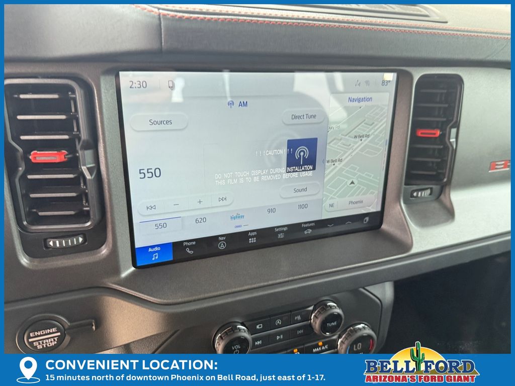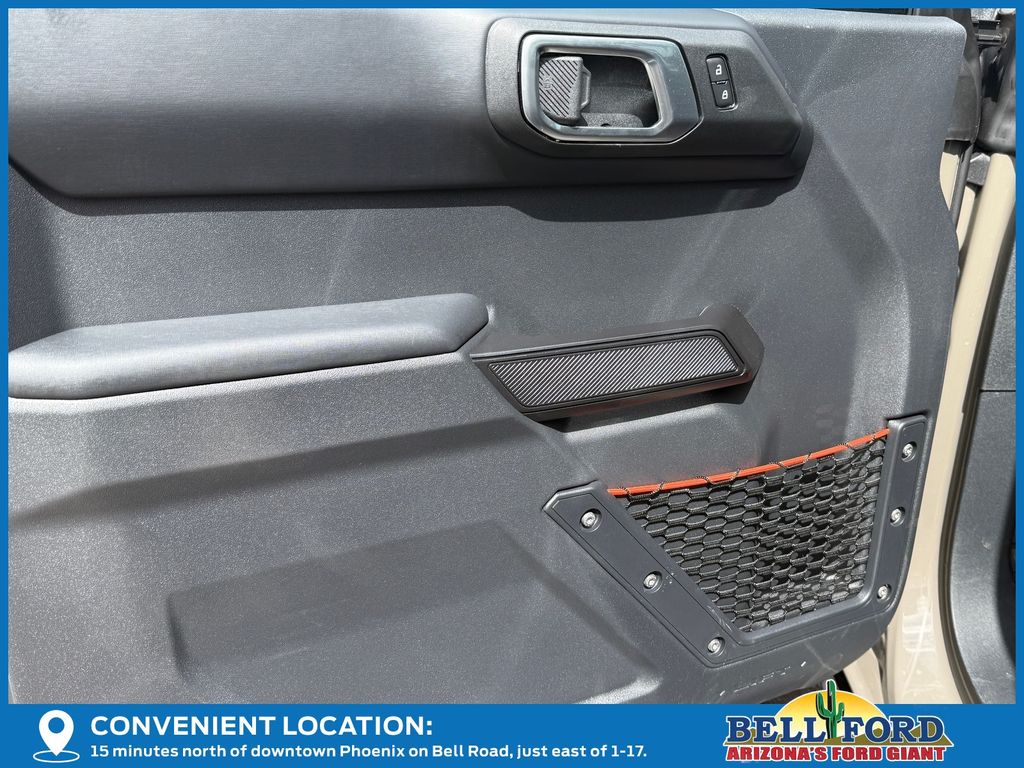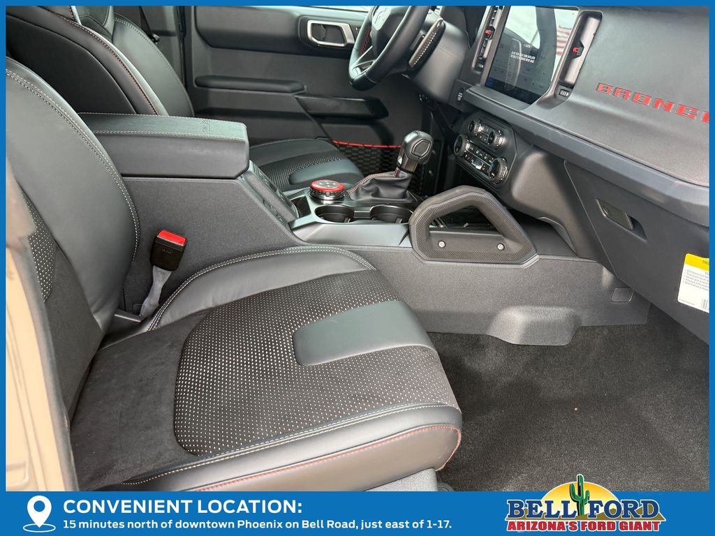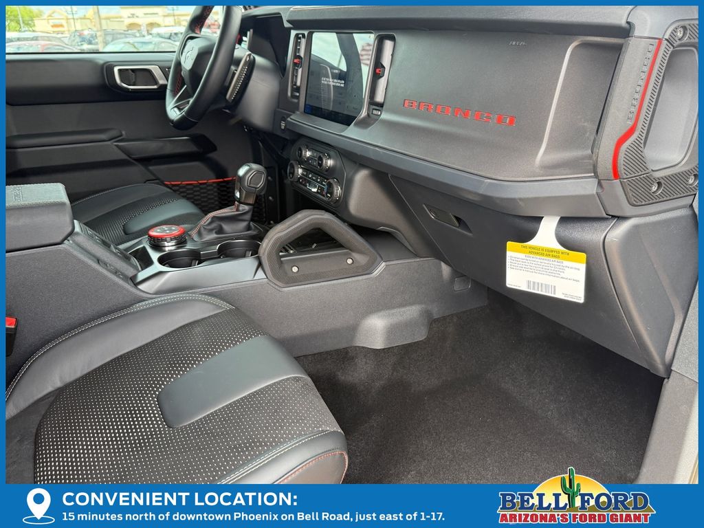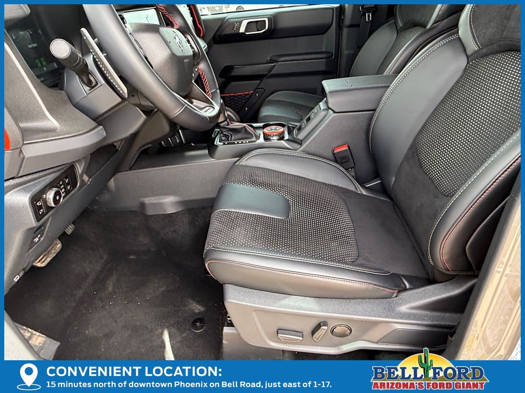 This Ford Bronco is equipped with the following options: Equipment Group 374A Lux Package (Marine Grade Vinyl Bucket Seats and Wheels: 17" Black High Gloss-Painted Aluminum), Ford Connectivity Package (1-Year Included), 12 Speakers, 4-Wheel Disc Brakes, ABS brakes, Air Conditioning, Alloy wheels, AM/FM radio: SiriusXM with 360L, Auto High-beam Headlights, Auto-dimming Rear-View mirror, Automatic temperature control, Brake assist, Compass, Connected Navigation, Convertible HardTop, Convertible roof lining, Delay-off headlights, Driver door bin, Driver vanity mirror, Dual front impact airbags, Dual front side impact airbags, Electronic Stability Control, Emergency communication system: 911 Assist, Exterior Parking Camera Rear, Front anti-roll bar, Front Bucket Seats, Front Center Armrest, Front dual zone A/C, Front fog lights, Front reading lights, Front wheel independent suspension, Fully automatic headlights, Glass rear window, Hard Top Sound Deadening Headliner, Heated door mirrors, Heated front seats, Heated steering wheel, Illuminated entry, Integrated roll-over protection, Leather Shift Knob, Leather-Trimmed/Vinyl Bucket Seats, Low tire pressure warning, Navigation system: Connected Navigation, Occupant sensing airbag, Outside temperature display, Overhead airbag, Overhead console, Panic alarm, Passenger door bin, Passenger vanity mirror, Power door mirrors, Power steering, Power windows, Radio data system, Rear anti-roll bar, Rear seat center armrest, Rear window defroster, Rear window wiper, Rear-Window Defroster and Washer, Remote keyless entry, Security system, Shadow Black Painted Hard Top, SiriusXM with 360L, Speed control, Split folding rear seat, Steering wheel mounted audio controls, SYNC 4, Tachometer, Telescoping steering wheel, Tilt steering wheel, Traction control, Trip computer, Turn signal indicator mirrors, Variably intermittent wipers, and Voltmeter.