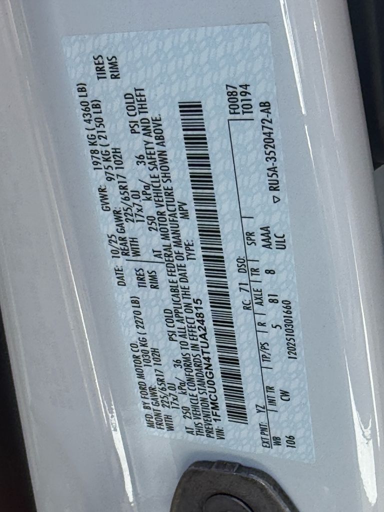 This Ford Escape is equipped with the following options: Equipment Group 200A (3.81 Axle Ratio, 4-Way Manual Front Passenger Seat, 6-Way Manual Driver Seat, Ford App, Radio: AM/FM Stereo with SiriusXM 360L, SYNC 4, Unique Cloth Front Bucket Seats, and Wheels: 17" Shadow Silver-Painted Aluminum), Tech Pack #1 (Adaptive Cruise Control with Stop-and-Go, Connected Navigation (1-Year Included), Digital Rear View Camera, Evasive Steering Assist, Ford Co-Pilot360 Assist+, Intersection Assist, Predictive Speed Assist, Rear Parking Sensor, and SYNC 4 with Enhanced Voice Recognition), 4-Wheel Disc Brakes, 6 Speakers, ABS brakes, Air Conditioning, Alloy wheels, AM/FM radio: SiriusXM 360L, Auto High-beam Headlights, Automatic temperature control, Brake assist, Bumpers: body-color, Compass, Delay-off headlights, Driver door bin, Driver vanity mirror, Dual front impact airbags, Dual front side impact airbags, Electronic Stability Control, Emergency communication system: SYNC 4 911 Assist, Four wheel independent suspension, Front anti-roll bar, Front Bucket Seats, Front Center Armrest, Front dual zone A/C, Front reading lights, Fully automatic headlights, Illuminated entry, Knee airbag, Low tire pressure warning, Occupant sensing airbag, Outside temperature display, Overhead airbag, Overhead console, Panic alarm, Passenger door bin, Passenger vanity mirror, Power door mirrors, Power Liftgate, Power steering, Power windows, Radio data system, Rear anti-roll bar, Rear reading lights, Rear seat center armrest, Rear window defroster, Rear window wiper, Remote keyless entry, Speed control, Speed-sensing steering, Speed-Sensitive Wipers, Split folding rear seat, Spoiler, Steering wheel mounted audio controls, Tachometer, Telescoping steering wheel, Tilt steering wheel, Traction control, Trip computer, and Variably intermittent wipers. Price includes: $1500 - Retail Customer Cash. Exp. 03/31/2026 $2000 - Bonus Customer Cash. Exp. 03/31/2026
