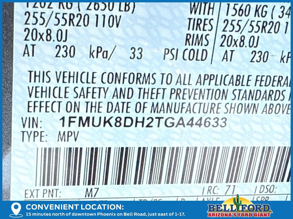 - VIN : 1FMUK8DH2TGA44633