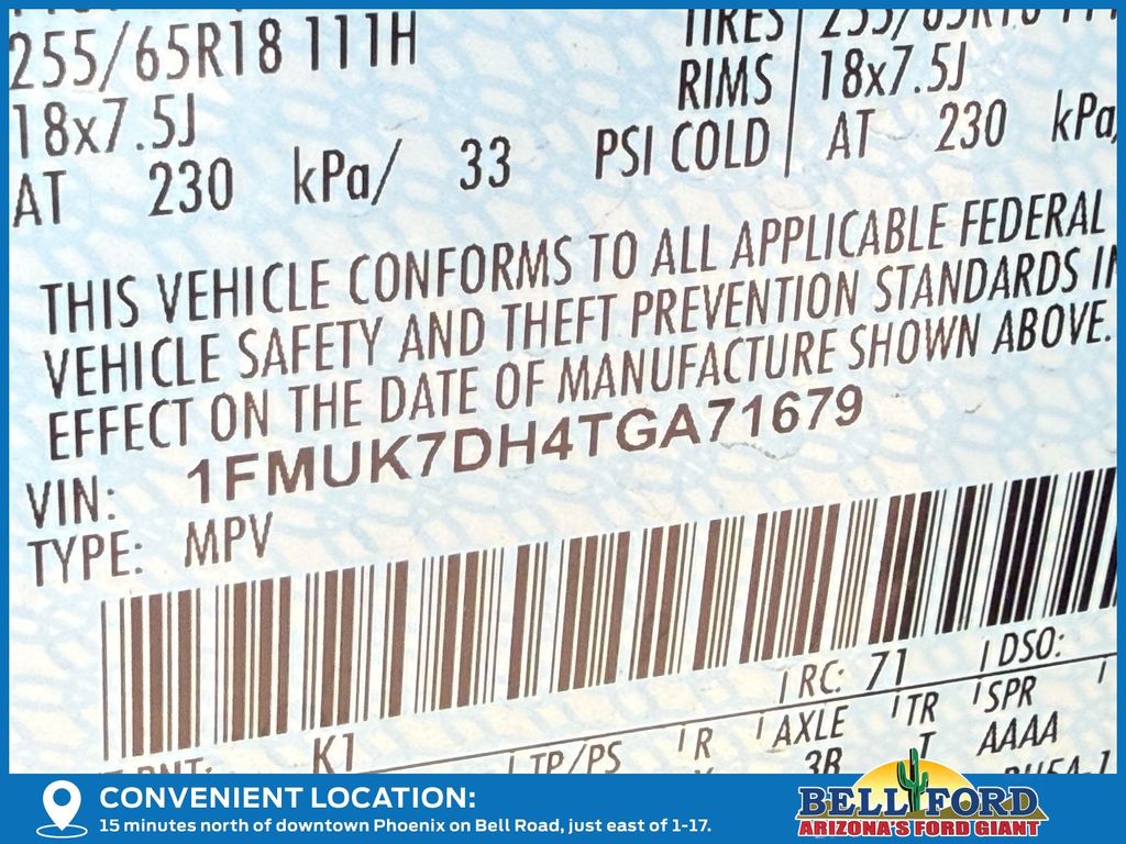 - VIN : 1FMUK7DH4TGA71679