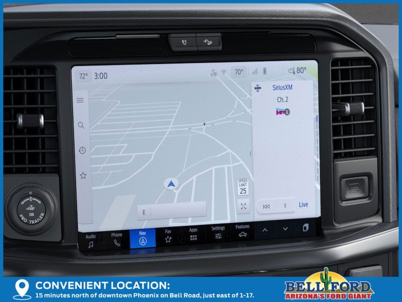 This Ford F-150 is equipped with the following options: Equipment Group 702A High (Center High Mounted Stop Lamp (CHMSL) Camera, Power-Deployable Running Boards, Radio: B&O Unleashed Sound System by Bang & Olufsen, Unique Multi-Contour Leather Bucket Seats, and Wheels: 20" Painted Gloss Ebony Black), Ford Connectivity Package (1-Year Included), FX4 Off-Road Package (4x4 FX4 Off-Road Bodyside Decal, Hill Descent Control, Monotube Rear Shocks, and Off-Road Tuned Front Shock Absorbers), GVWR: 7,400 lbs Payload Package, Internet access capable: 5G Modem - Ford Connectivity Package, 3.5L PowerBoost Full-Hybrid V6, 4WD, 4-Wheel Disc Brakes, 8 Speakers, ABS brakes, Adjustable pedals, Air Conditioning, Alloy wheels, AM/FM radio: SiriusXM with 360L, Auto High-beam Headlights, Auto tilt-away steering wheel, Auto-dimming door mirrors, Auto-dimming Rear-View mirror, Automatic temperature control, Brake assist, Bumpers: body-color, Compass, Delay-off headlights, Driver door bin, Driver vanity mirror, Driver's Side SecuriCode Keyless-Entry Keypad, Dual front impact airbags, Dual front side impact airbags, Electronic Stability Control, Emergency communication system: SYNC 4 911 Assist, Front anti-roll bar, Front Bucket Seats, Front Center Armrest, Front dual zone A/C, Front fog lights, Front reading lights, Front wheel independent suspension, Fully automatic headlights, Garage door transmitter, Heated door mirrors, Heated front seats, Heated rear seats, Heated steering wheel, Illuminated entry, Leather steering wheel, Low tire pressure warning, Memory seat, Navigation system: Connected Navigation, Occupant sensing airbag, Outside temperature display, Overhead airbag, Overhead console, Panic alarm, Passenger door bin, Passenger vanity mirror, Pedal memory, Power door mirrors, Power driver seat, Power passenger seat, Power steering, Power windows, Pro Access Tailgate, Radio data system, Radio: B&O Sound System by Bang and Olufsen, Rain sensing wipers, Rear reading lights, Rear seat center armrest, Rear step bumper, Rear window defroster, Remote keyless entry, Security system, Speed control, Split folding rear seat, Steering wheel memory, Steering wheel mounted audio controls, SYNC 4 with Enhanced Voice Recognition, Tachometer, Telescoping steering wheel, Tilt steering wheel, Traction control, Tray Style Floor Liner, Trip computer, Turn signal indicator mirrors, Twin Panel Moonroof, Variably intermittent wipers, and Ventilated front seats.