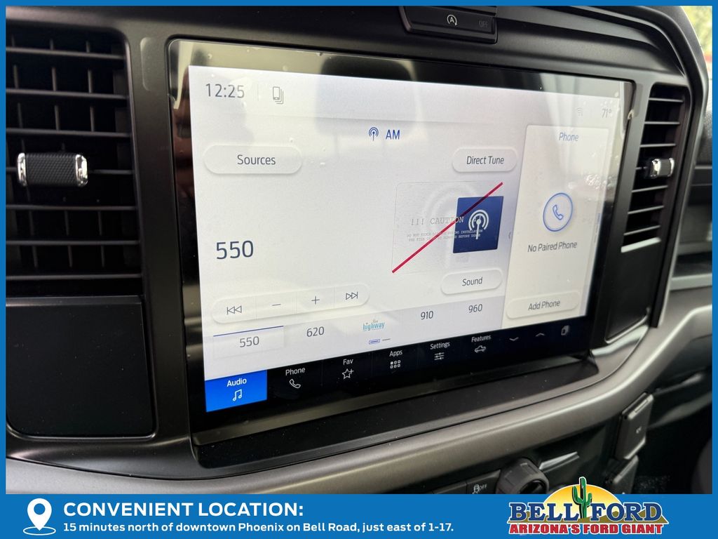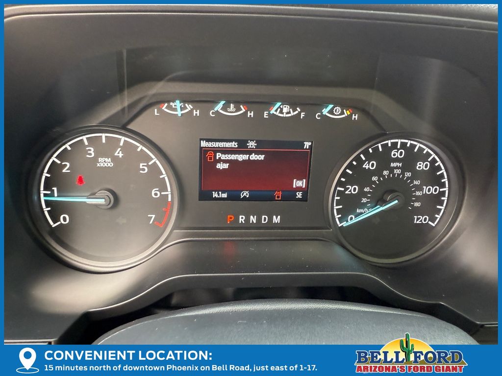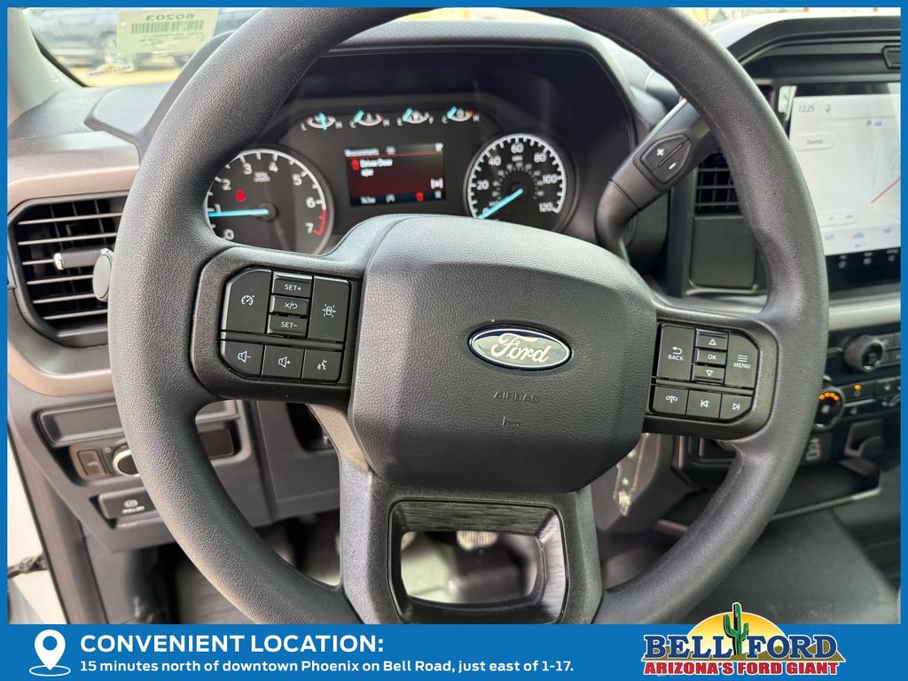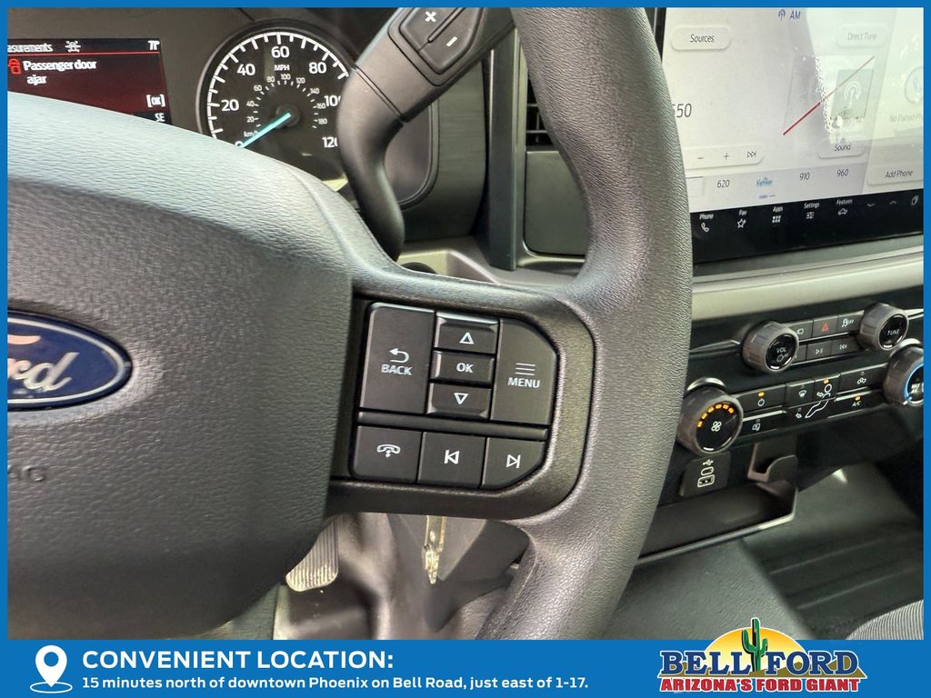 This Ford F-150 is equipped with the following options: Equipment Group 101A Standard (3.55 Axle Ratio, Cloth 40/20/40 Front Seat, Radio: AM/FM Stereo with SiriusXM 360L, SYNC 4 with Enhanced Voice Recognition, and Wheels: 17" Silver Steel), Ford Connectivity Package (1-Year Included), GVWR: 6,220 Lb Payload Package, Internet access capable: 5G Modem - Ford Connectivity Package, 4 Speakers, 4-Wheel Disc Brakes, ABS brakes, Air Conditioning, AM/FM radio: SiriusXM with 360L, Auto High-beam Headlights, Brake assist, Compass, Delay-off headlights, Driver door bin, Dual front impact airbags, Dual front side impact airbags, Electronic Stability Control, Emergency communication system: SYNC 4 911 Assist, Front anti-roll bar, Front Center Armrest, Front reading lights, Front wheel independent suspension, Fully automatic headlights, Heated door mirrors, Illuminated entry, Low tire pressure warning, Occupant sensing airbag, Outside temperature display, Overhead airbag, Overhead console, Panic alarm, Passenger door bin, Passenger vanity mirror, Power door mirrors, Power steering, Power windows, Radio data system, Rear Parking Sensors, Rear step bumper, Remote keyless entry, Security system, Speed control, Steering wheel mounted audio controls, Tachometer, Telescoping steering wheel, Tilt steering wheel, Traction control, Trip computer, and Variably intermittent wipers.