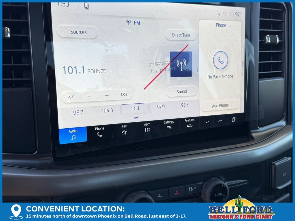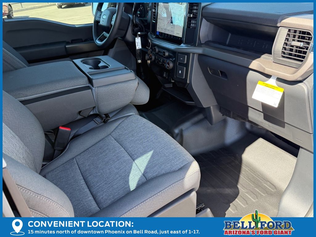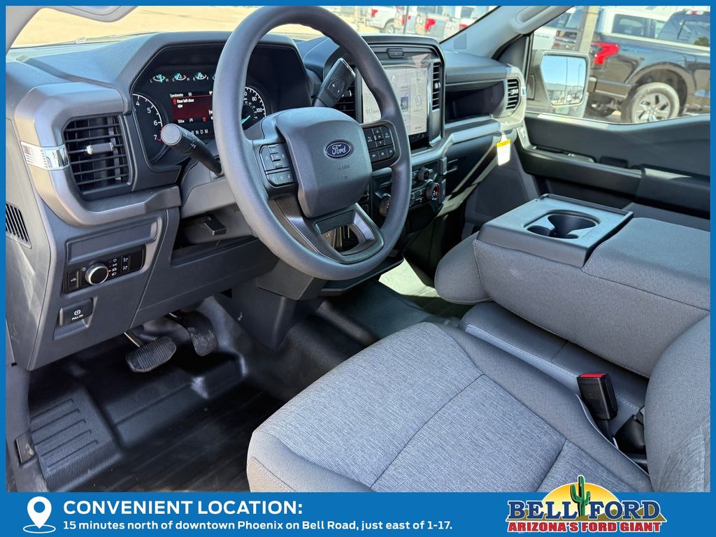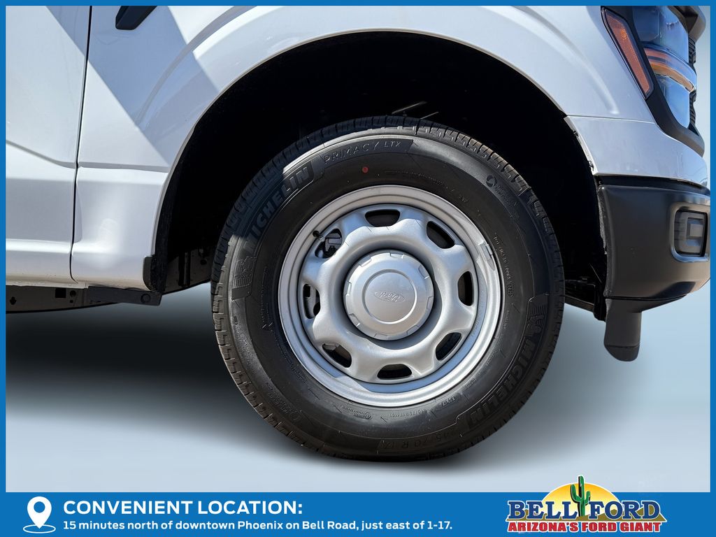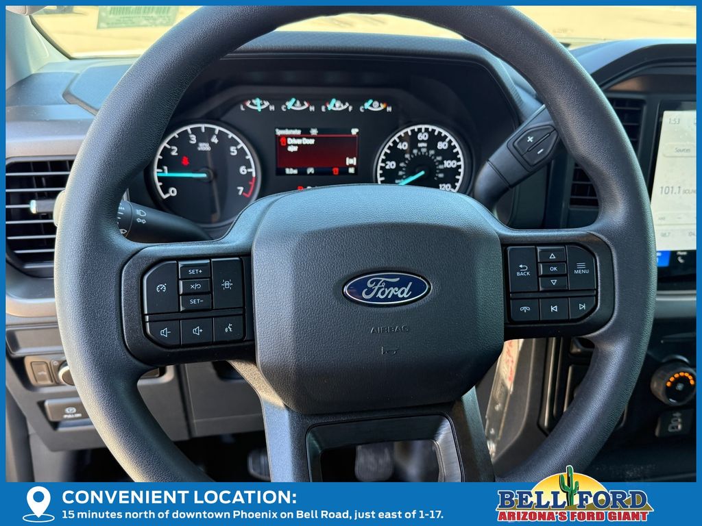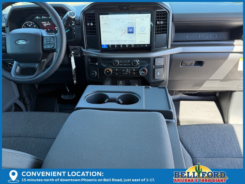 This Ford F-150 is equipped with the following options: Equipment Group 101A Standard (3.55 Axle Ratio, Cloth 40/20/40 Front Seat, Radio: AM/FM Stereo with SiriusXM 360L, SYNC 4 with Enhanced Voice Recognition, and Wheels: 17" Silver Steel), Ford Connectivity Package (1-Year Included), GVWR: 6,365 lbs Payload Package, Internet access capable: 5G Modem - Ford Connectivity Package, 4-Wheel Disc Brakes, 6 Speakers, ABS brakes, Air Conditioning, AM/FM radio: SiriusXM with 360L, Auto High-beam Headlights, Brake assist, Compass, Delay-off headlights, Driver door bin, Dual front impact airbags, Dual front side impact airbags, Electronic Stability Control, Emergency communication system: SYNC 4 911 Assist, Front anti-roll bar, Front Center Armrest, Front reading lights, Front wheel independent suspension, Fully automatic headlights, Heated door mirrors, Illuminated entry, Low tire pressure warning, Occupant sensing airbag, Outside temperature display, Overhead airbag, Overhead console, Panic alarm, Passenger door bin, Passenger vanity mirror, Power door mirrors, Power steering, Power windows, Radio data system, Rear Parking Sensors, Rear step bumper, Remote keyless entry, Security system, Speed control, Split folding rear seat, Steering wheel mounted audio controls, Tachometer, Telescoping steering wheel, Tilt steering wheel, Traction control, Trip computer, and Variably intermittent wipers.