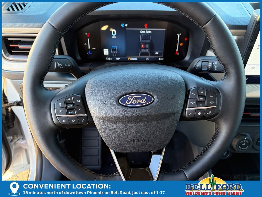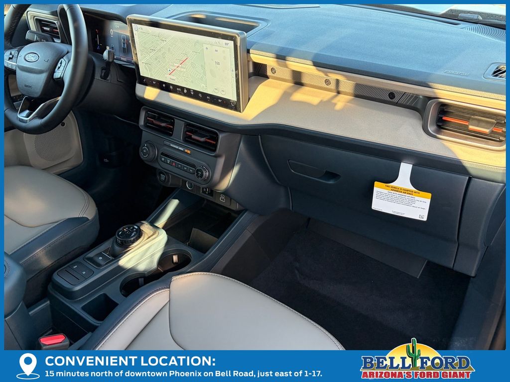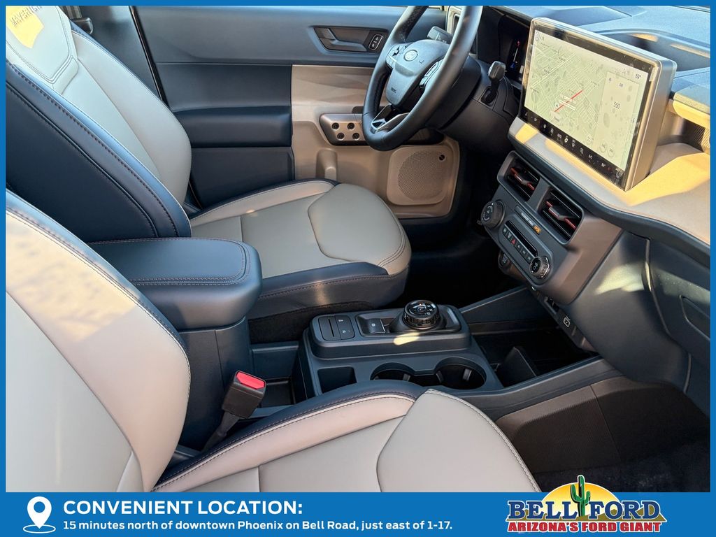 This Ford Maverick is equipped with the following options: Equipment Group 502A (ActiveX Trimmed Heated Front Bucket Seats, Radio: B&O Sound System by Bang and Olufsen, SiriusXM with 360L, SYNC 4 with Enhanced Voice Recognition, and Wheels: 19" Machined Aluminum Painted), Ford Connectivity Package (1-Year Included), Internet access capable: 5G Modem - Ford Connectivity Package, 2.91 Axle Ratio, 4-Wheel Disc Brakes, 8 Speakers, ABS brakes, Air Conditioning, Alloy wheels, AM/FM radio: SiriusXM with 360L, Apple CarPlay/Android Auto, Auto High-beam Headlights, Automatic temperature control, Brake assist, Bumpers: body-color, Compass, Delay-off headlights, Driver door bin, Driver vanity mirror, Dual front impact airbags, Dual front side impact airbags, Electronic Stability Control, Emergency communication system: SYNC 4 911 Assist, Exterior Parking Camera Rear, Four wheel independent suspension, Front anti-roll bar, Front Bucket Seats, Front Center Armrest, Front dual zone A/C, Front reading lights, Fully automatic headlights, Heated door mirrors, Heated front seats, Heated steering wheel, Illuminated entry, Knee airbag, Low tire pressure warning, Navigation system: Connected Navigation, Occupant sensing airbag, Outside temperature display, Overhead airbag, Overhead console, Panic alarm, Passenger door bin, Passenger vanity mirror, Power door mirrors, Power driver seat, Power steering, Power windows, Power-Sliding Rear Window, Radio data system, Rear anti-roll bar, Rear seat center armrest, Rear step bumper, Remote keyless entry, Security system, Speed control, Speed-sensing steering, Steering wheel mounted audio controls, Telescoping steering wheel, Tilt steering wheel, Traction control, and Trip computer.