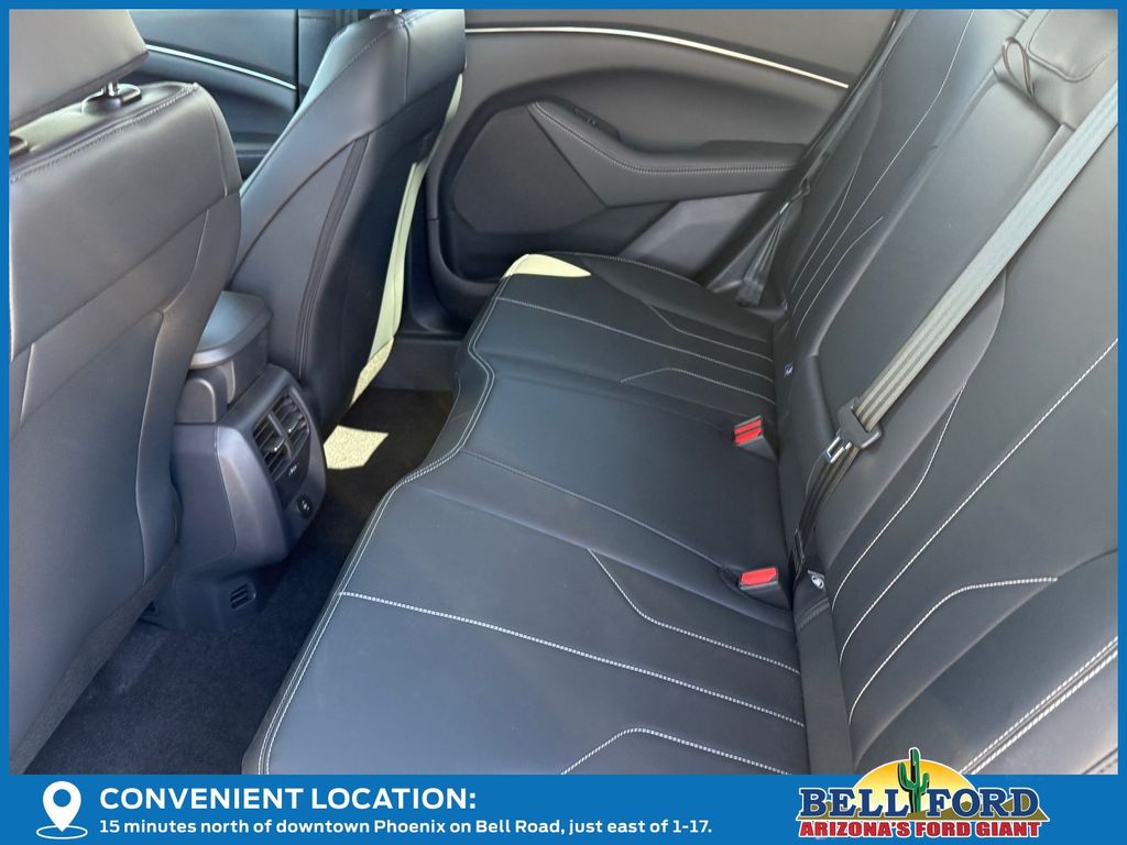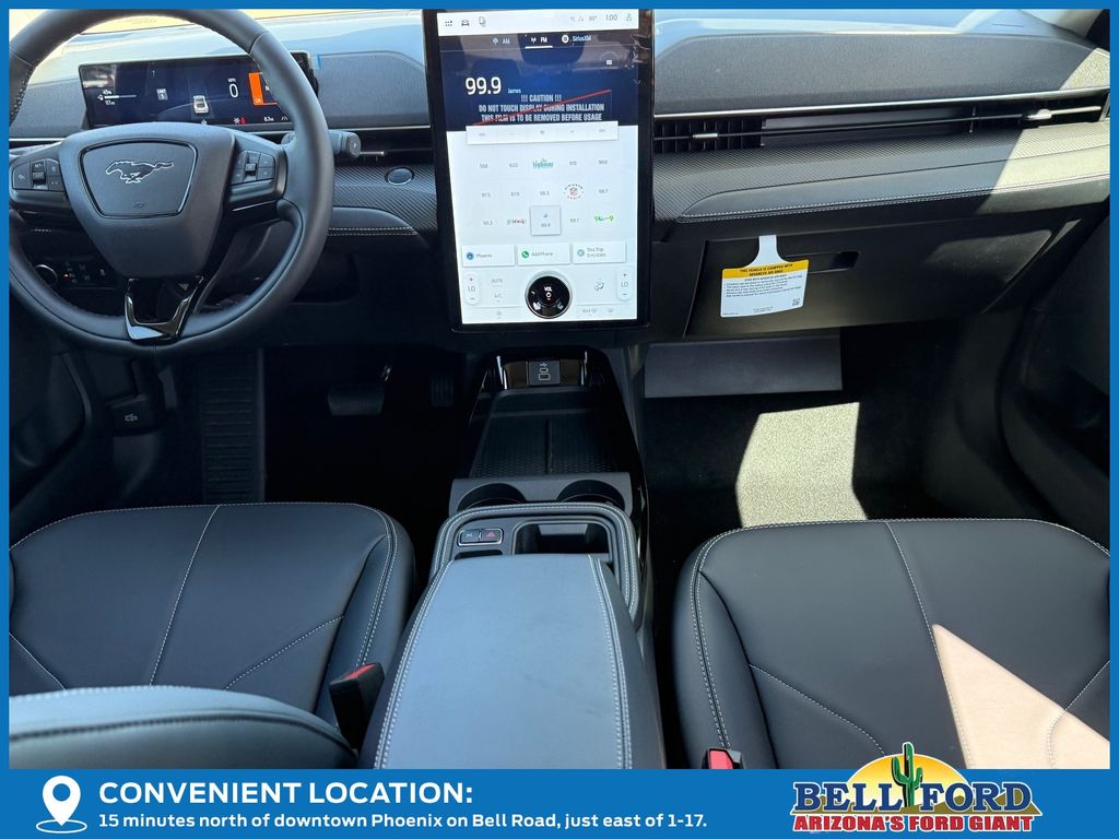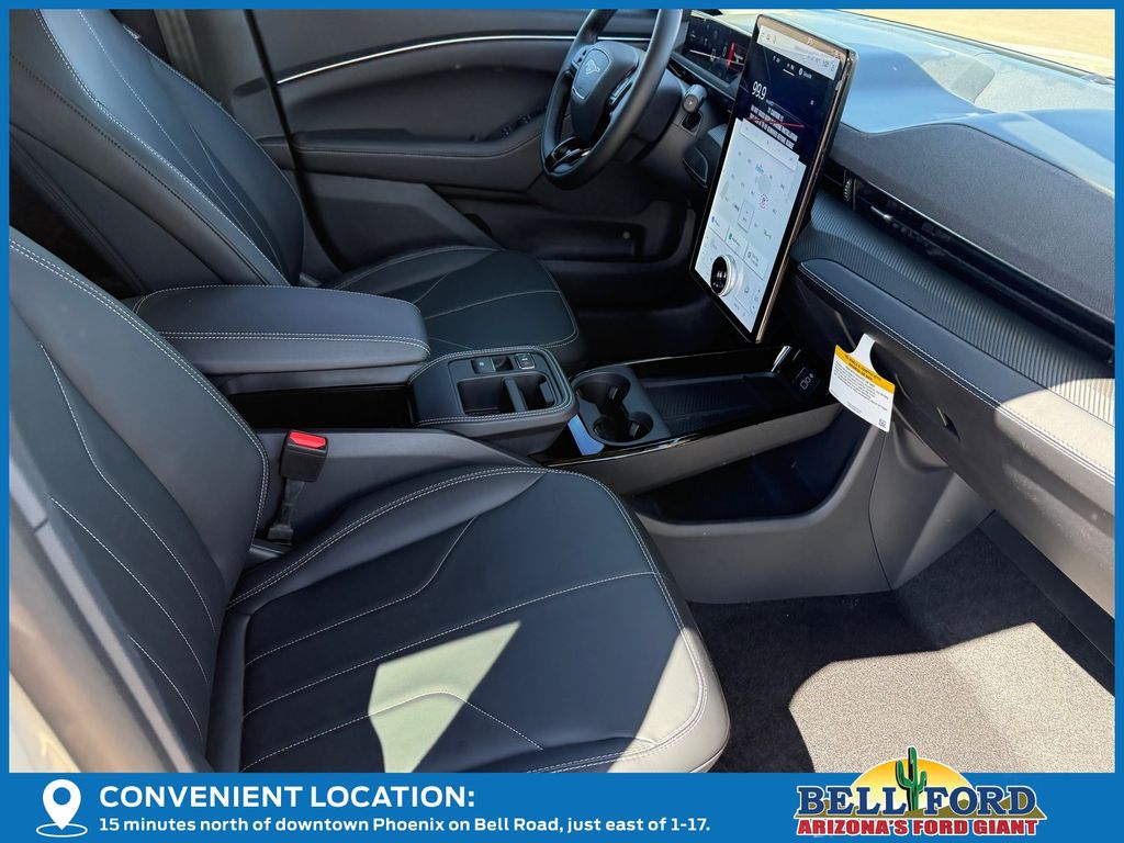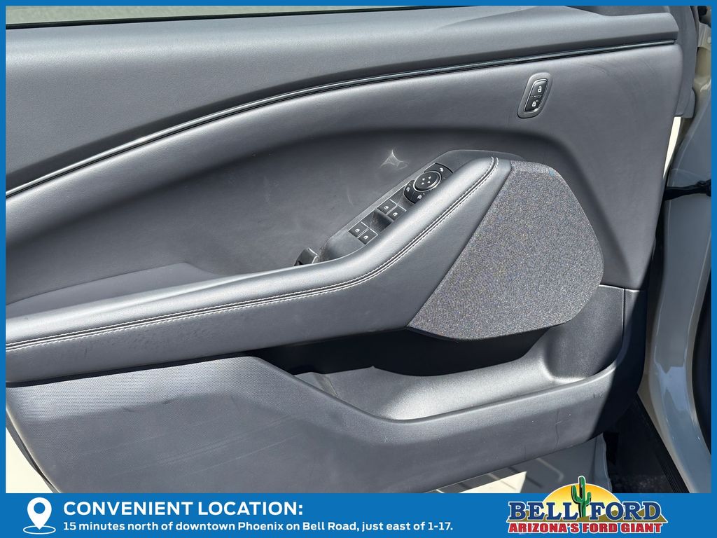 This Ford Mustang Mach-E is equipped with the following options: Equipment Group 100A Standard Package (ActiveX Bucket Seats, AM/FM Stereo, SiriusXM with 360L, SYNC 4A with Enhanced Voice Recognition, and Wheels: 19" Machined-Face Aluminum), 4-Wheel Disc Brakes, 6 Speakers, ABS brakes, Air Conditioning, Alloy wheels, AM/FM radio: SiriusXM with 360L, Apple CarPlay/Android Auto, Auto High-beam Headlights, Auto-dimming Rear-View mirror, Automatic temperature control, Brake assist, Bumpers: body-color, Compass, Delay-off headlights, Driver door bin, Driver vanity mirror, Dual front impact airbags, Dual front side impact airbags, Electronic Stability Control, Emergency communication system: 911 Assist, Exterior Parking Camera Rear, Four wheel independent suspension, Front anti-roll bar, Front Bucket Seats, Front Center Armrest, Front dual zone A/C, Front reading lights, Fully automatic headlights, Heated door mirrors, Illuminated entry, Knee airbag, Low tire pressure warning, Mobile Power Cord (120V/240V), Navigation system: Connected Navigation, Occupant sensing airbag, Outside temperature display, Overhead airbag, Overhead console, Panic alarm, Passenger door bin, Passenger vanity mirror, Power door mirrors, Power driver seat, Power steering, Power windows, Radio data system, Rain sensing wipers, Rear anti-roll bar, Rear seat center armrest, Rear side impact airbag, Rear window defroster, Rear window wiper, Remote keyless entry, Security system, Speed control, Speed-sensing steering, Speed-Sensitive Wipers, Split folding rear seat, Spoiler, Steering wheel mounted audio controls, Telescoping steering wheel, Tilt steering wheel, Tire Inflator and Sealant Kit, Traction control, Trip computer, Turn signal indicator mirrors, Variably intermittent wipers, and Wheels: 19" Monochromatic High Gloss Black-Painted.
