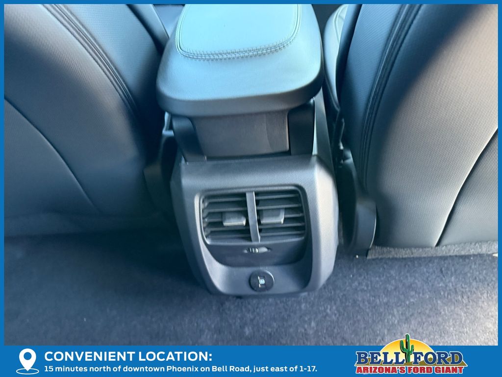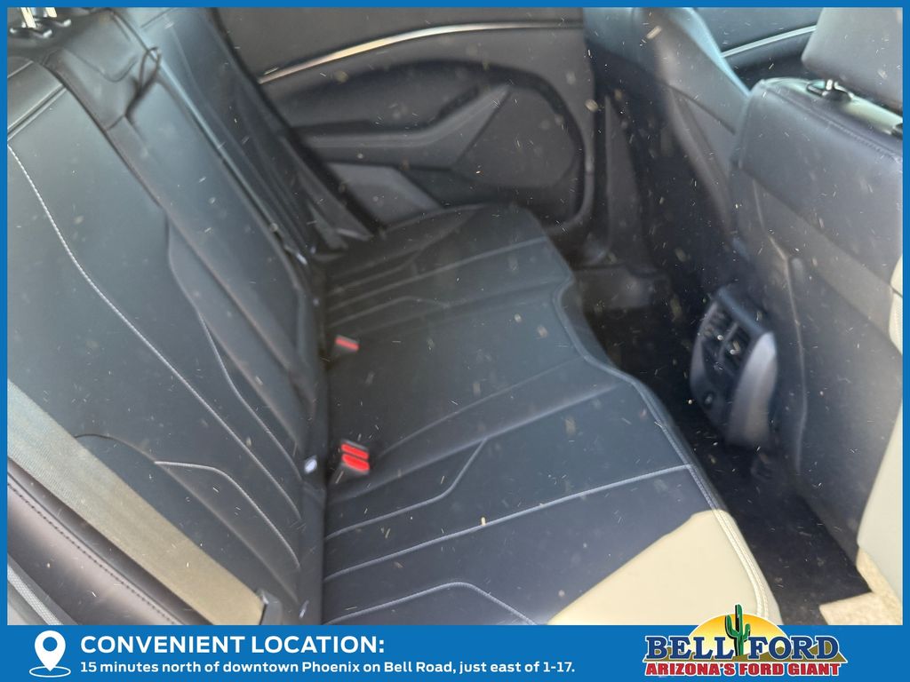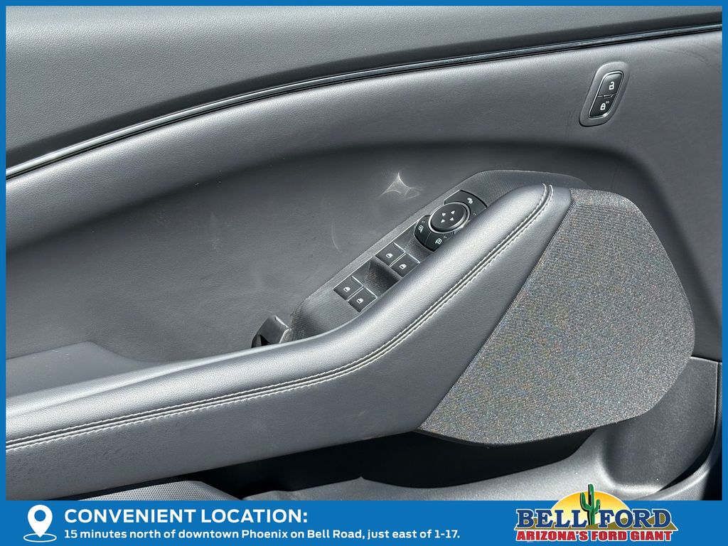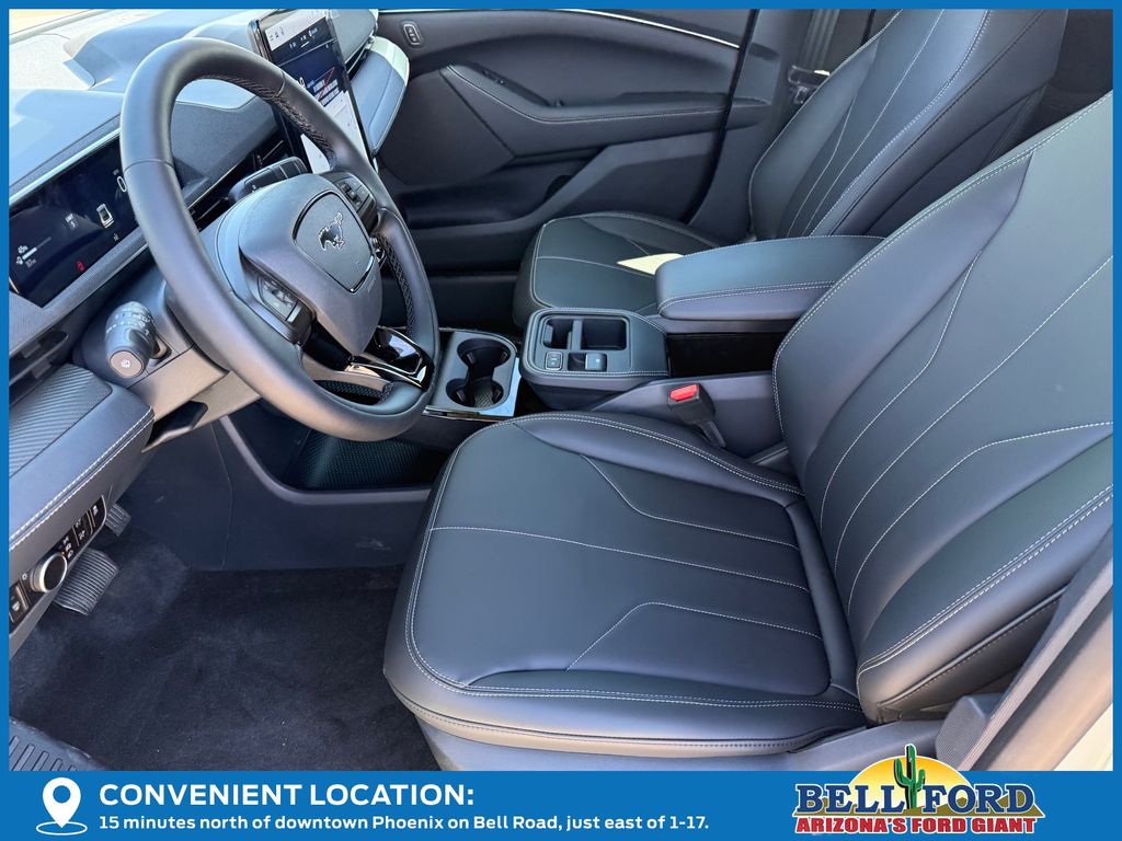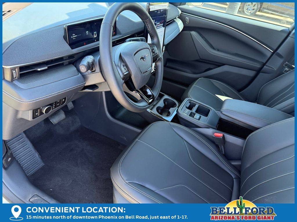 This Ford Mustang Mach-E is equipped with the following options: Equipment Group 100A Standard Package (ActiveX Bucket Seats, AM/FM Stereo, SiriusXM with 360L, SYNC 4A with Enhanced Voice Recognition, and Wheels: 19" Machined-Face Aluminum), 4-Wheel Disc Brakes, 6 Speakers, ABS brakes, Air Conditioning, Alloy wheels, AM/FM radio: SiriusXM with 360L, Apple CarPlay/Android Auto, Auto High-beam Headlights, Auto-dimming Rear-View mirror, Automatic temperature control, Brake assist, Bumpers: body-color, Compass, Delay-off headlights, Driver door bin, Driver vanity mirror, Dual front impact airbags, Dual front side impact airbags, Electronic Stability Control, Emergency communication system: 911 Assist, Exterior Parking Camera Rear, Four wheel independent suspension, Front anti-roll bar, Front Bucket Seats, Front Center Armrest, Front dual zone A/C, Front reading lights, Fully automatic headlights, Heated door mirrors, Illuminated entry, Knee airbag, Low tire pressure warning, Mobile Power Cord (120V/240V), Navigation system: Connected Navigation, Occupant sensing airbag, Outside temperature display, Overhead airbag, Overhead console, Panic alarm, Passenger door bin, Passenger vanity mirror, Power door mirrors, Power driver seat, Power steering, Power windows, Radio data system, Rain sensing wipers, Rear anti-roll bar, Rear seat center armrest, Rear side impact airbag, Rear window defroster, Rear window wiper, Remote keyless entry, Security system, Speed control, Speed-sensing steering, Speed-Sensitive Wipers, Split folding rear seat, Spoiler, Steering wheel mounted audio controls, Telescoping steering wheel, Tilt steering wheel, Tire Inflator and Sealant Kit, Traction control, Trip computer, Turn signal indicator mirrors, Variably intermittent wipers, and Wheels: 19" Monochromatic High Gloss Black-Painted.