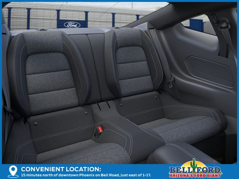 This Ford Mustang is equipped with the following options: Equipment Group 100A Standard Package, 1st Row Carpeted Black Floor Mats, 4-Wheel Disc Brakes, 6 Speakers, ABS brakes, Air Conditioning, Alloy wheels, AM/FM radio, AM/FM Stereo, Auto High-beam Headlights, Automatic temperature control, Brake assist, Bumpers: body-color, Cloth Bucket Seats, Compass, Delay-off headlights, Driver door bin, Driver vanity mirror, Dual front impact airbags, Dual front side impact airbags, Electronic Stability Control, Emergency communication system: 911 Assist, Exterior Parking Camera Rear, Four wheel independent suspension, Front anti-roll bar, Front Bucket Seats, Front Center Armrest, Front dual zone A/C, Front reading lights, Fully automatic headlights, Illuminated entry, Internet access capable: FordPass Connect, Knee airbag, Leather Shift Knob, Low tire pressure warning, Occupant sensing airbag, Outside temperature display, Overhead airbag, Overhead console, Panic alarm, Passenger door bin, Passenger vanity mirror, Power door mirrors, Power steering, Power windows, Radio data system, Rain sensing wipers, Rear anti-roll bar, Rear Parking Sensors, Rear window defroster, Remote keyless entry, Speed control, Speed-sensing steering, Speed-Sensitive Wipers, Split folding rear seat, Sport steering wheel, Steering wheel mounted audio controls, SYNC 4, Tachometer, Telescoping steering wheel, Tilt steering wheel, Traction control, Trip computer, Variably intermittent wipers, Voltmeter, and Wheels: 18" x 8" Painted Shadow Silver Cast Alum.