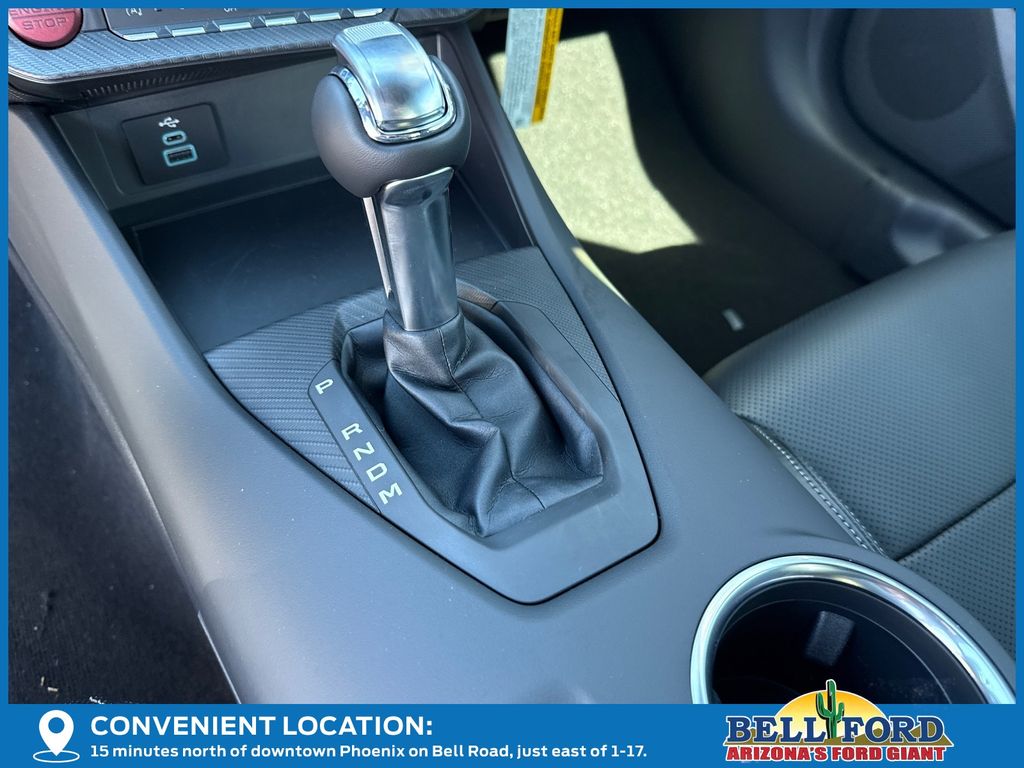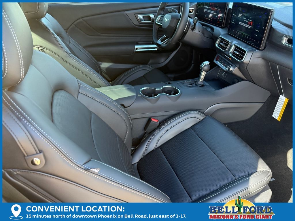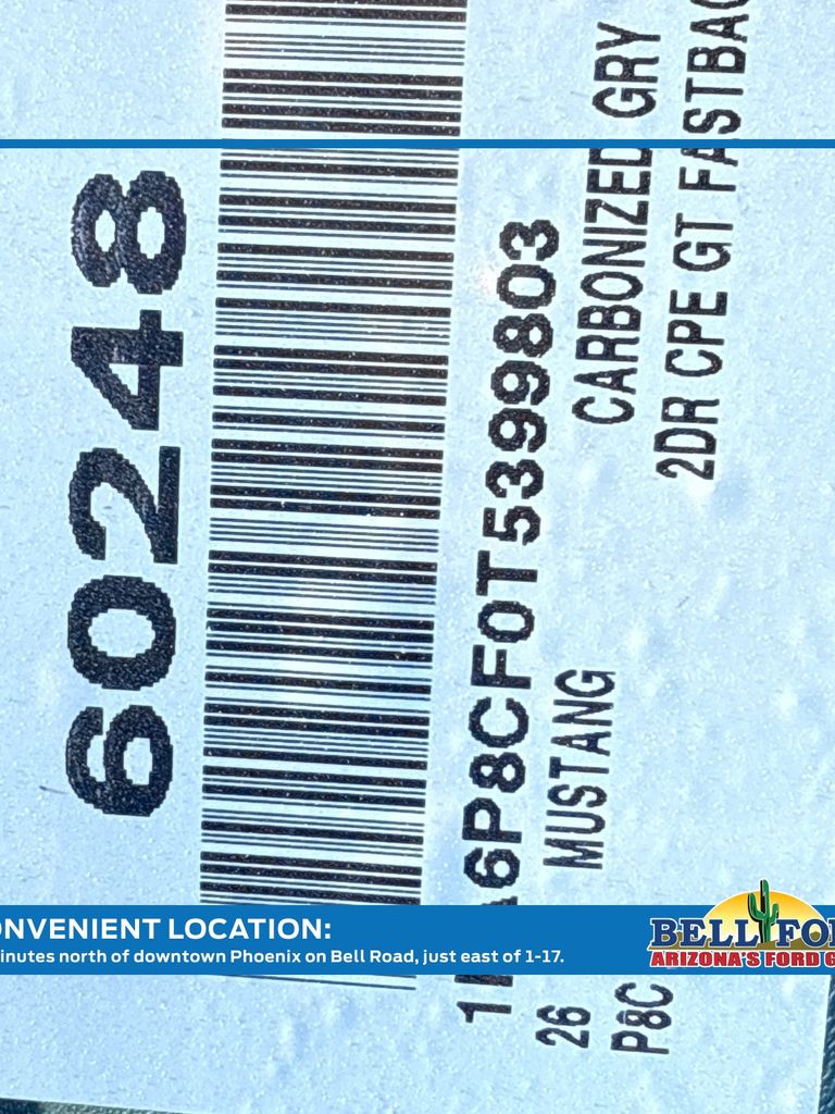 This Ford Mustang is equipped with the following options: 1st Row Carpeted Black Floor Mats, 4-Wheel Disc Brakes, 6 Speakers, ABS brakes, Active Valve Performance Exhaust, Air Conditioning, Alloy wheels, AM/FM radio, AM/FM Stereo, Auto High-beam Headlights, Automatic temperature control, Brake assist, Bumpers: body-color, Cloth Bucket Seats, Compass, Delay-off headlights, Driver door bin, Driver vanity mirror, Dual front impact airbags, Dual front side impact airbags, Electronic Stability Control, Emergency communication system: 911 Assist, Exterior Parking Camera Rear, Four wheel independent suspension, Front anti-roll bar, Front Bucket Seats, Front Center Armrest, Front dual zone A/C, Front reading lights, Fully automatic headlights, Illuminated entry, Knee airbag, Leather Shift Knob, Leather steering wheel, Low tire pressure warning, Occupant sensing airbag, Outside temperature display, Overhead airbag, Overhead console, Panic alarm, Passenger door bin, Passenger vanity mirror, Power door mirrors, Power steering, Power windows, Radio data system, Rain sensing wipers, Rear anti-roll bar, Rear Parking Sensors, Rear window defroster, Remote keyless entry, Speed control, Speed-sensing steering, Speed-Sensitive Wipers, Split folding rear seat, Sport steering wheel, Steering wheel mounted audio controls, SYNC 4, Tachometer, Telescoping steering wheel, Tilt steering wheel, Traction control, Trip computer, Variably intermittent wipers, Voltmeter, Wedge Decklid Spoiler, and Wheels: 8" x 8.5" Ebony Black Painted Aluminum. Price includes: $1000 - Retail Customer Cash. Exp. 03/31/2026