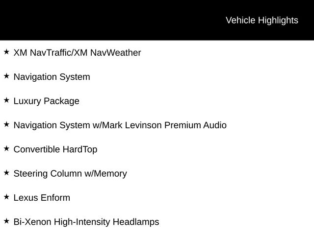 Alabaster Leather, Bi-Xenon High-Intensity Headlamps, Convertible HardTop, Driver & Front Passenger 3-Position Seat Memory, Heated & Ventilated Front Seats, Illuminated Scuff Plates, Lexus Enform, Luxury Package, Navigation System, Navigation System w/Mark Levinson Premium Audio, One-Touch Auto Front-Seat Fold & Slide Activation, Outside Rear-View Mirror Functions, Perforated Semi-Aniline Leather Seat Trim, Rain-Sensing Wipers, Rear Back-Up Camera, Steering Column w/Memory, Wood Interior Trim, XM NavTraffic/XM NavWeather.