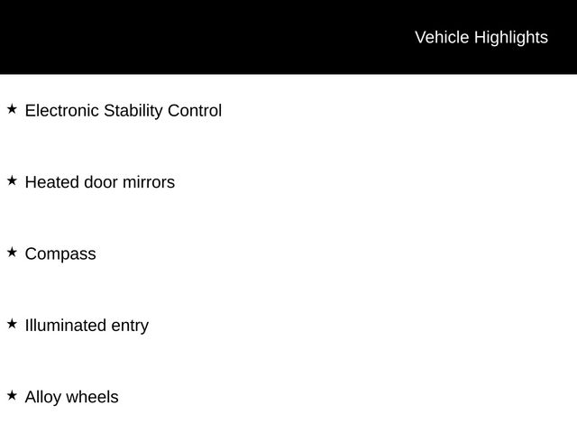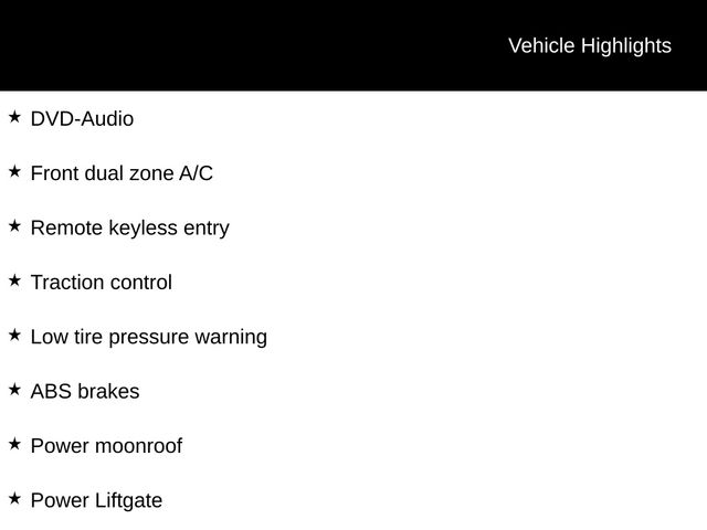 ABS brakes, Alloy wheels, Compass, DVD-Audio, Electronic Stability Control, Front dual zone A/C, Heated door mirrors, Illuminated entry, Low tire pressure warning, Power Liftgate, Power moonroof, Remote keyless entry, Traction control.
