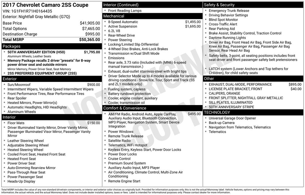 Don't miss your chance to experience the power and style of this exceptional 50th Anniversary Edition Camaro. Schedule a test drive today and discover why this is the sports car you've been waiting for.